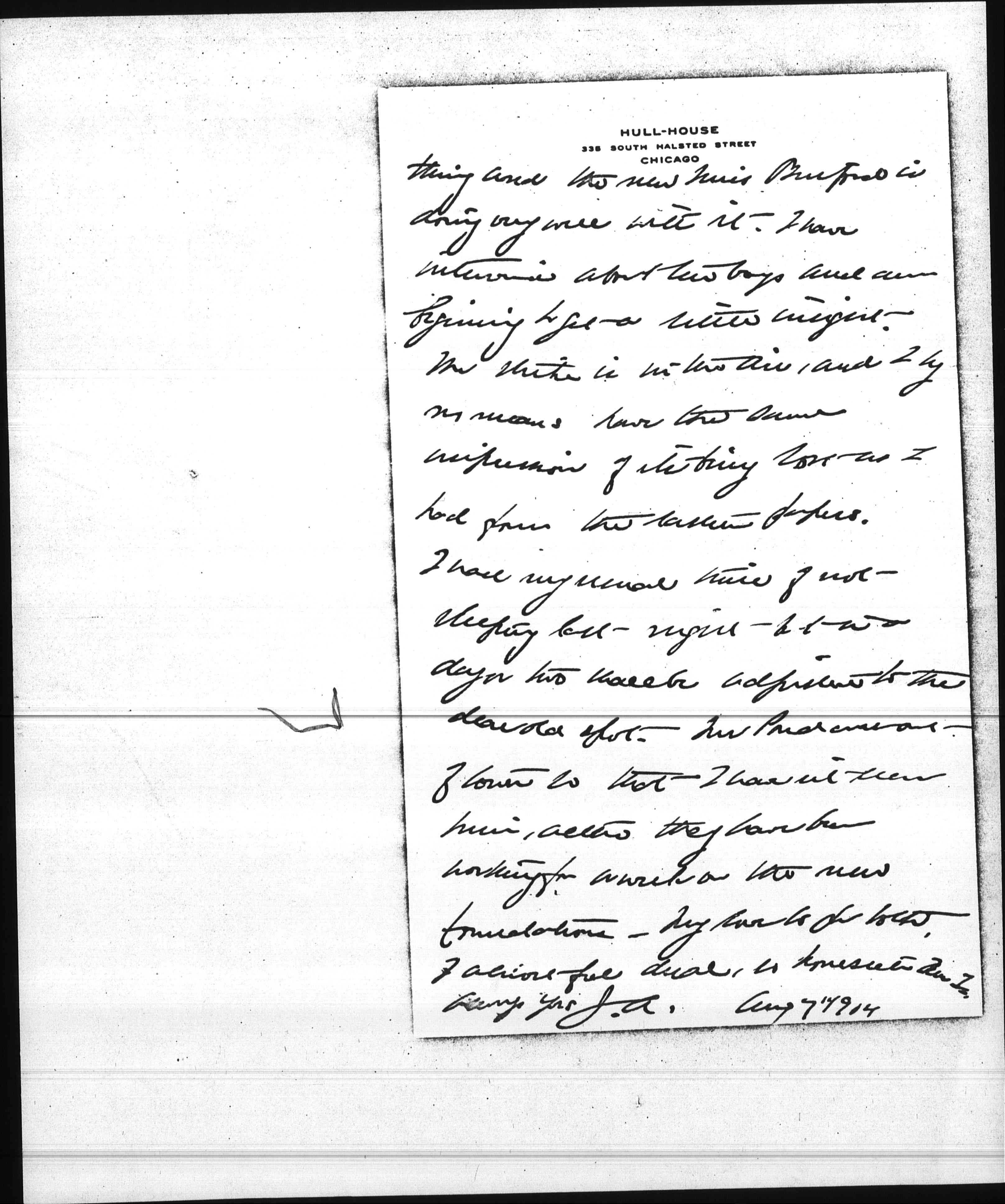 I saw Aunt Sarah yesterday who was looking very well. Your father had gone to Wheaton for Sunday, Frank had left for the West and she and Miss Christenson were as cozy and happy as possible. Margaret Fletcher with Richard and Polly had gone to the park and [although] I was there for more than an hour, they did not come back. Affairs here are very satisfactory. Mrs Britton has taken hold of the nursery in great shape as well as the [Fresh] Air work. The cocaine raid which A. Hamilton started is really a big [page 2] thing and [the] new Miss Binford is doing very well with it. I have interviewed about ten boys and am beginning to get a little insight. The strike is in the air, and I by no means have the same impression of its being lost as I had from the eastern papers.