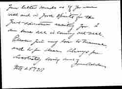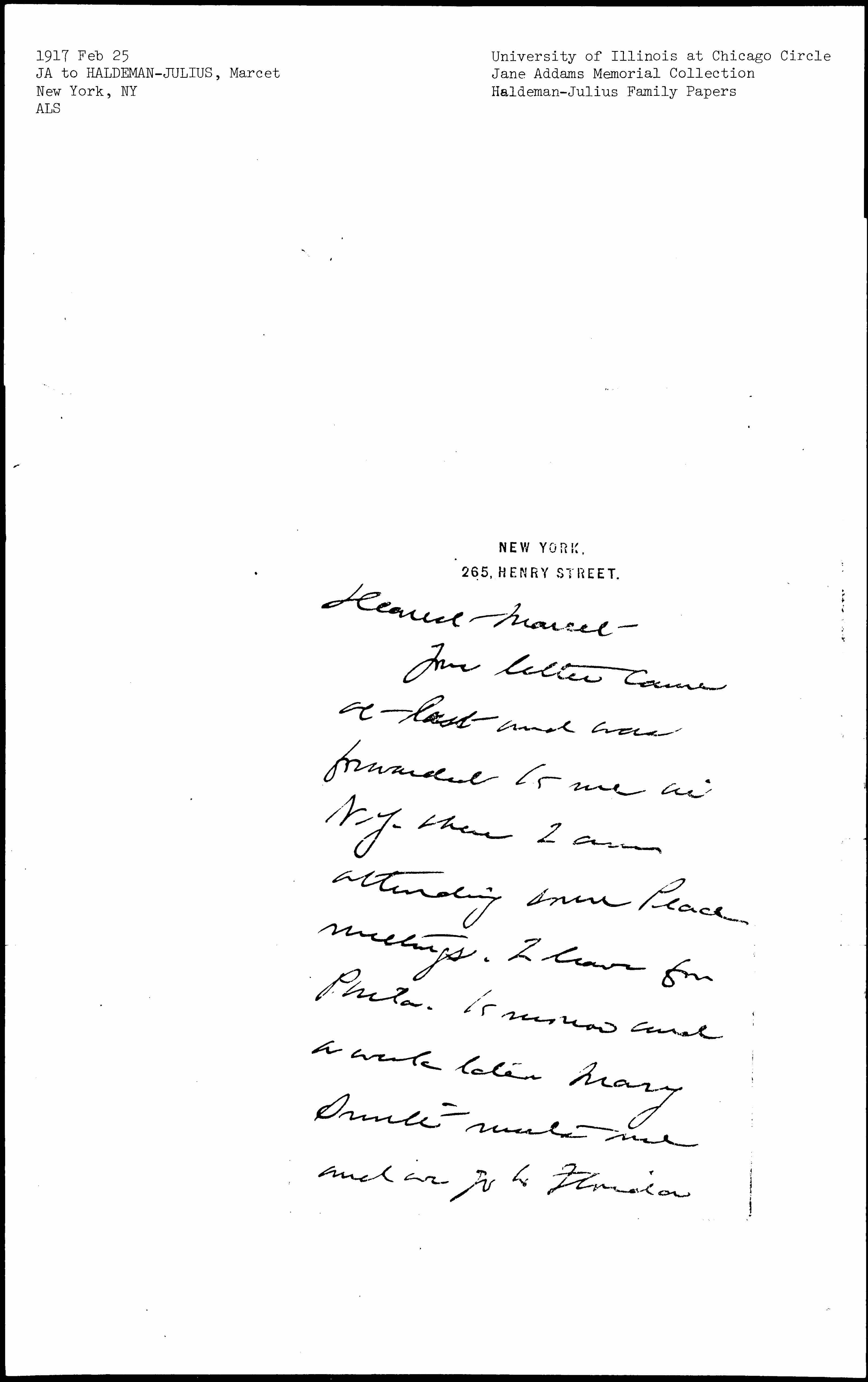 Your letter came at last and was forwarded to me in N.Y. where I am attending some Peace meetings. I leave for Phila. tomorrow and a week later Mary Smith visits me and we go to Florida [page 2] together. I will keep you supplied with our addresses so that if you change your mind in regard to having an old aunt about at [a] crucial moment, Manuel can telegraph us. We would stay at the hotel and proffer comfort when it was wanted. [page 3]