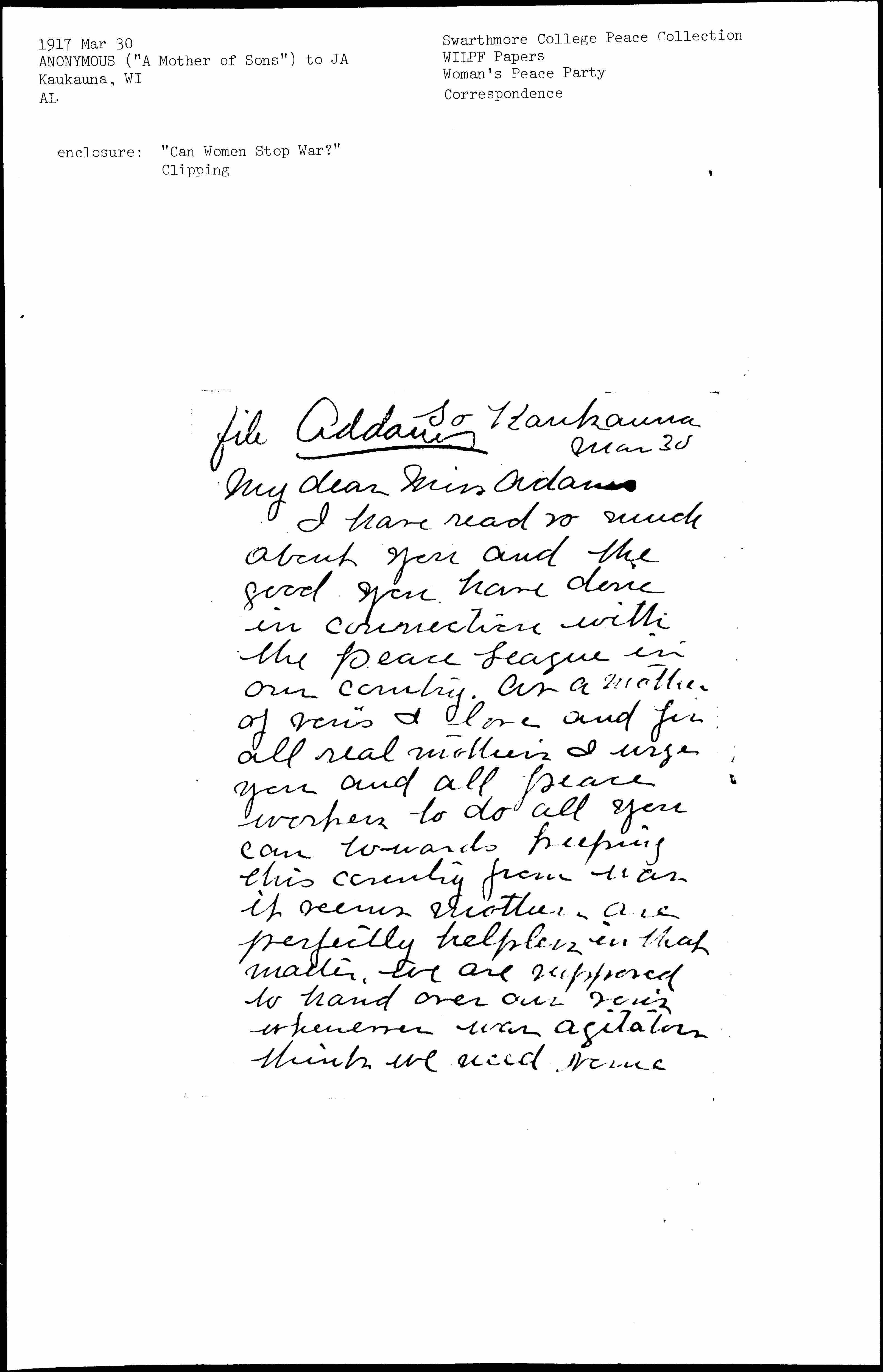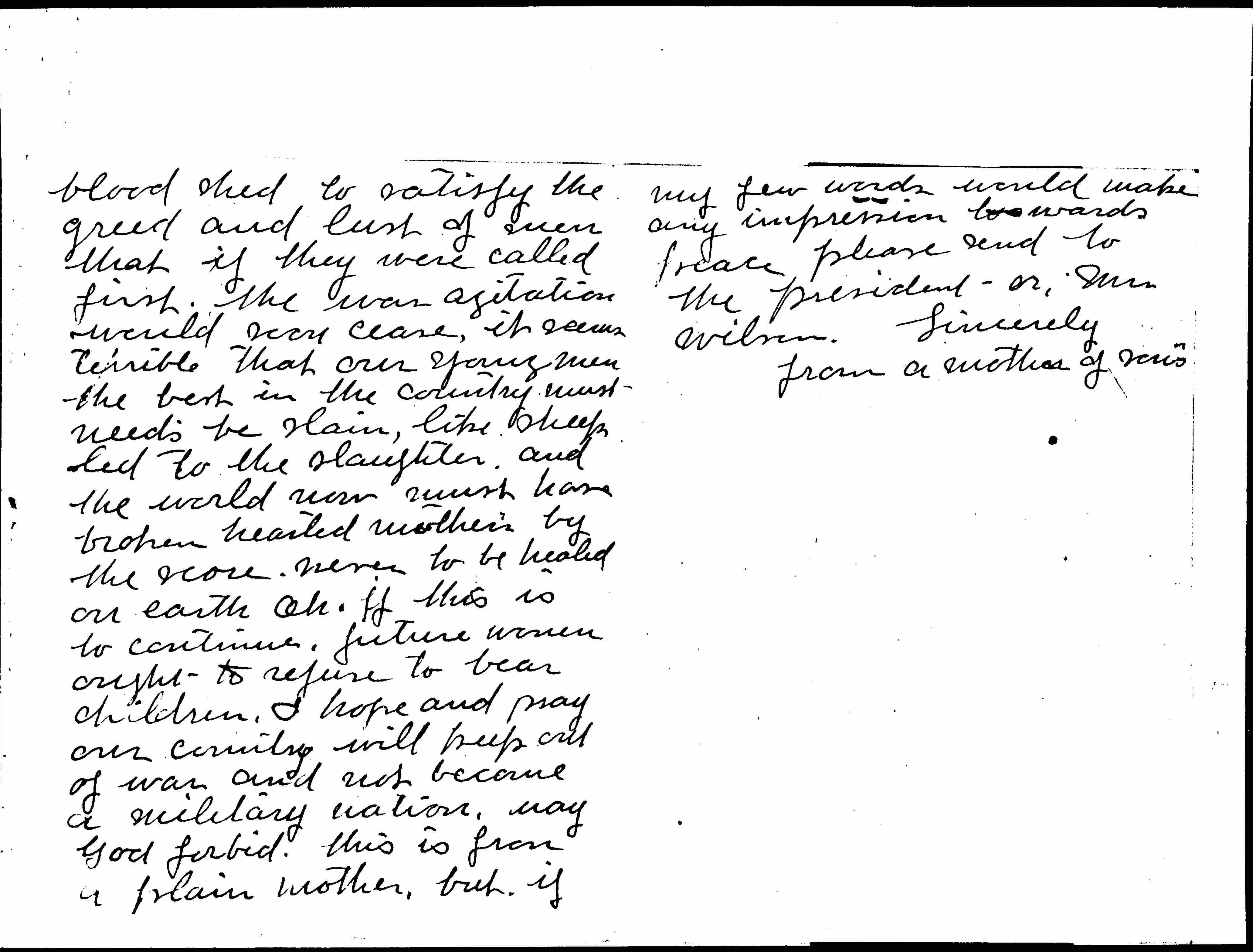 I have read so much about you and the good you have done in connection with the Peace League in our country. As a mother of sons I love and for all real mothers I urge you and all peace workers to do all you can towards keeping this country from war it seems mothers are perfectly helpless in that matter. We are supposed to hand over our sons [whenever] war agitators think we need some [page 2] blood shed to satisfy the greed and lust of men that if they were called first, the war agitation would now cease, it seems terrible that our young men the best in the country must needs be slain, like sheep led to the slaughter and the world war must have broken hearted mothers by the score never to be healed on earth [and] if this is to continue, future women ought to refuse to bear children. I hope and pray our country will keep out of war and not become a military nation. May God forbid. This is from a plain mother, but if [page 3] my few words would make any impression towards peace please send to the president or, Mrs Wilson.