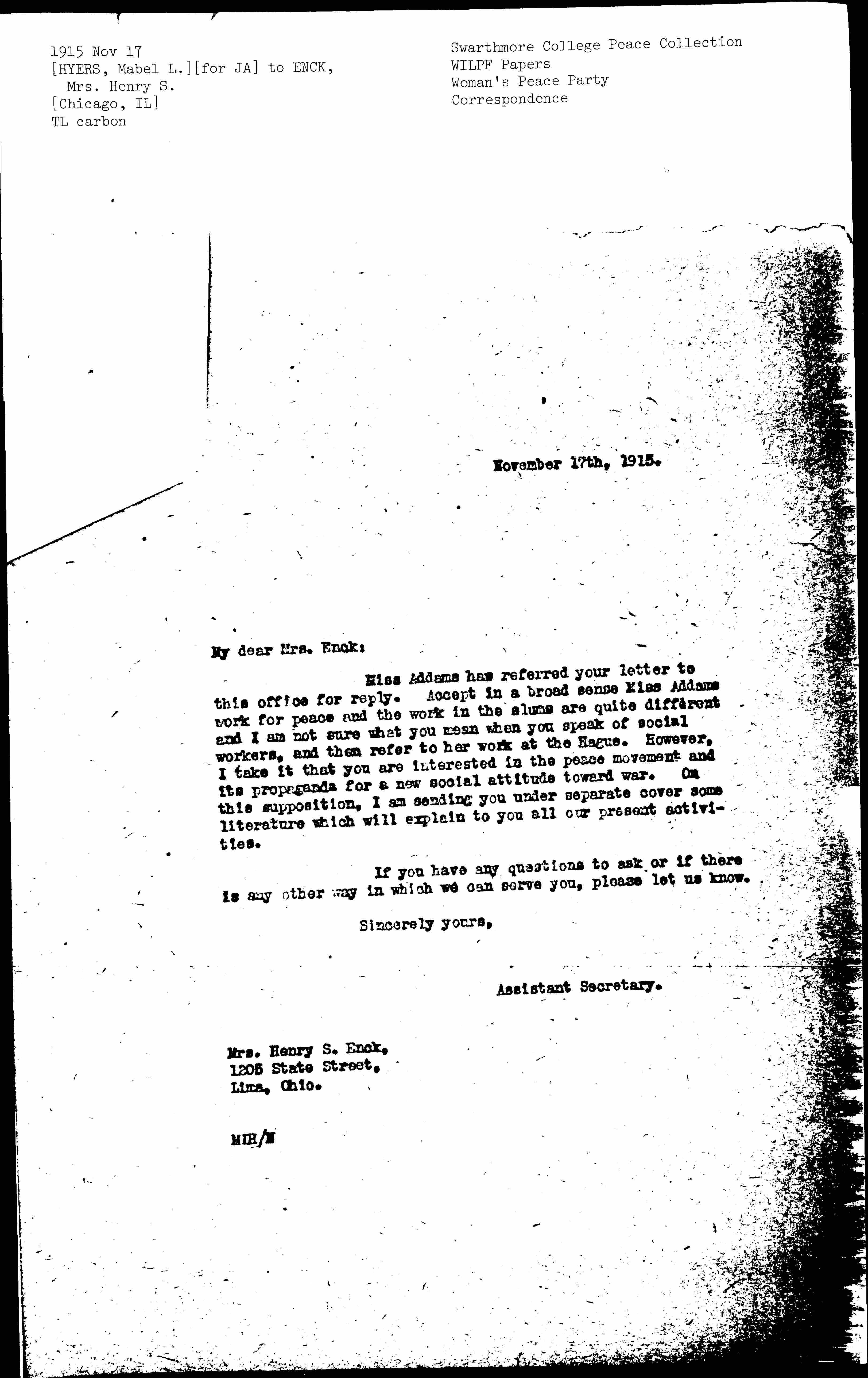 Miss Addams has referred our letter to this office for reply. [Except] in a broad sense Miss Addams work for peace and the work in the slums are quite different and I am not sure what you mean when you speak of social workers, and then refer to her work at The Hague. However, I take it that you are interested in the peace movement and its propaganda for a new social attitude toward war. On this supposition, I am sending you under separate cover some literature which will explain to you all our present activities.