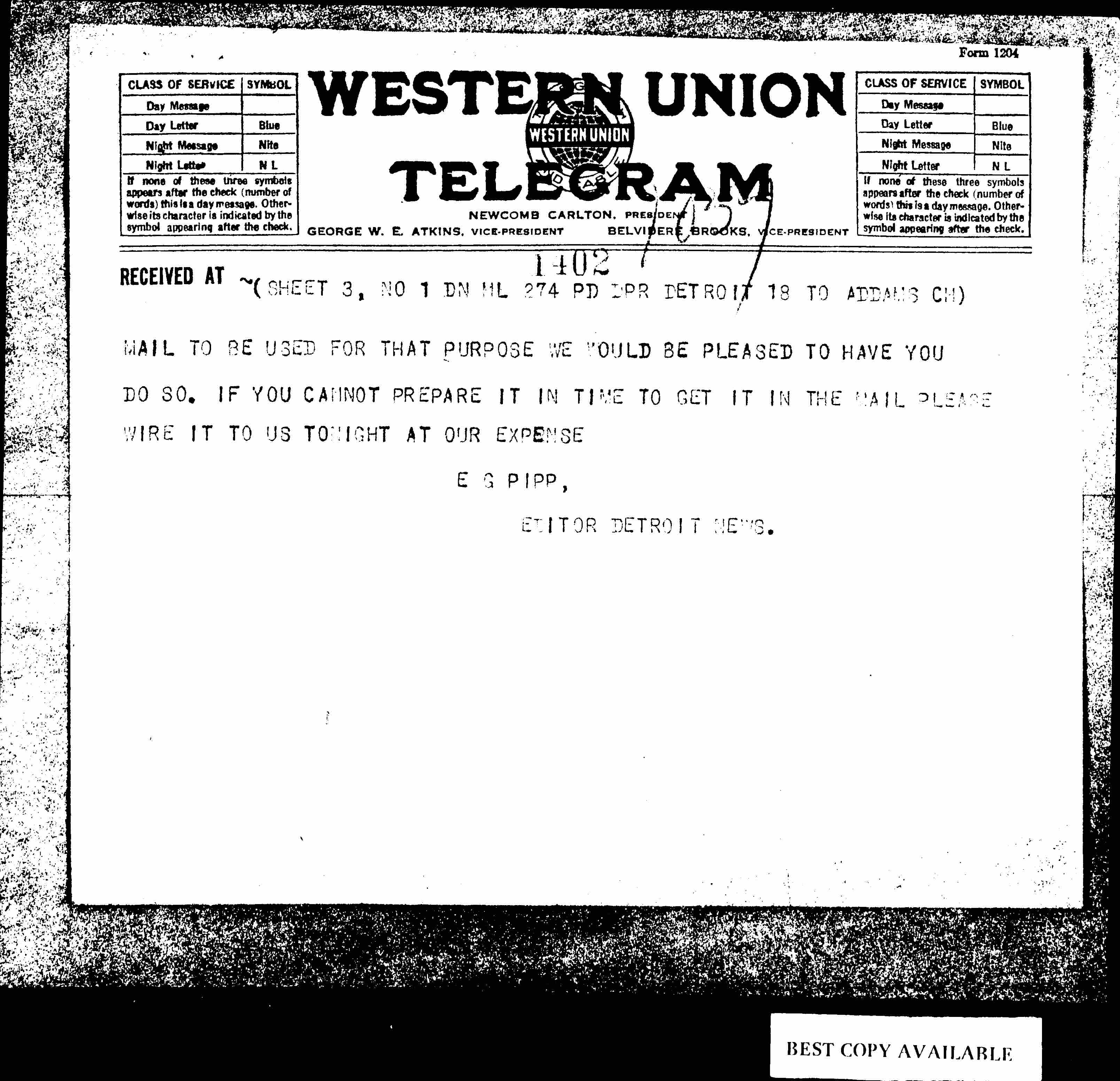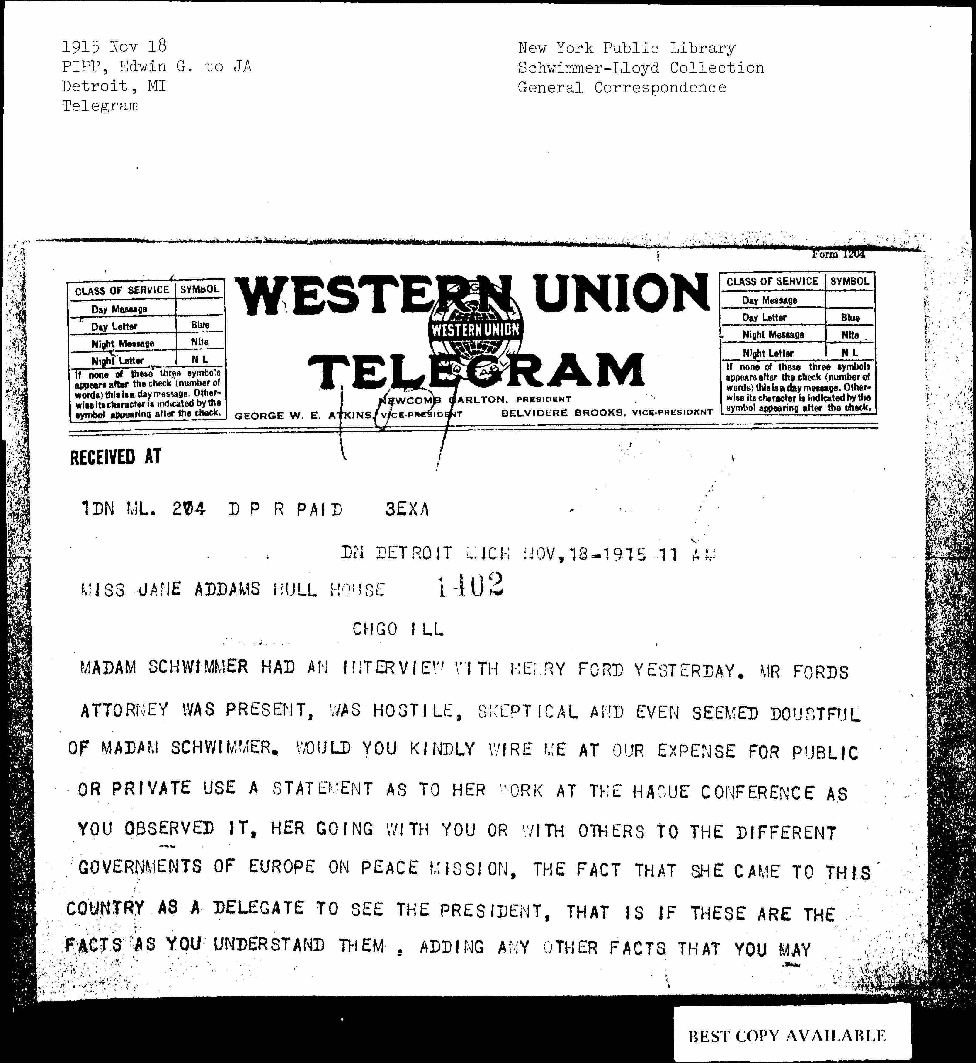 MADAM SCHWIMMER HAD AN INTERVIEW WITH HENRY FORD YESTERDAY. MR FORDS ATTORNEY WAS PRESENT, WAS HOSTILE, SKEPTICAL AND EVEN SEEMED DOUBTFUL OF MADAM SCHWIMMER. WOULD YOU KINDLY WIRE ME AT OUR EXPENSE FOR PUBLIC OR PRIVATE USE A STATEMENT AS TO HER WORK AT THE HAGUE CONFERENCE AS YOU OBSERVED IT, HER GOING WITH YOU OR WITH OTHERS TO THE DIFFERENT GOVERNMENTS OF EUROPE ON PEACE MISSION, THE FACT THAT SHE CAME TO THIS COUNTRY AS A DELEGATE TO SEE THE PRESIDENT, THAT IS IF THESE ARE THE FACTS AS YOU UNDERSTAND THEM, ADDING ANY OTHER FACTS THAT YOU MAY [page 2] SEE FIT, KEEPING THE ATTITUDE OF MR. FORDS ATTORNEY CONFIDENTIAL FOR THE TIME BEING. OUR WASHINGTON CORRESPONDENT HAS ARRANGED WITH THE PRESIDENT FOR AN INTERVIEW WITH MADAM SCHWIMMER AND MRS. SNOWDEN TO TAKE PLACE IN THE NEAR FUTURE. IN THE MEANTIME WE ARE ANXIOUS TO HAVE THE PRESS OF THE COUNTRY TAKE A MORE FRIENDLY ATTITUDE TOWARD THE PEACE MOVEMENT. THE DETROIT NEWS WILL UNDERTAKE TO SEND TO ABOUT 700 DAILY PAPERS OF THE COUNTRY STATEMENTS FROM MADAM SCHWIMMER, MR. [LOCHNER] AND OTHERS REGARDING THE ATTITUDE OF OUR COUNTRY AND WHAT IT SHOULD BE. WE WOULD BE PLEASED TO HAVE YOU SEND US A STATEMENT TO BE PRINTED IN OUR OWN PAPER AND FORWARDED TO THE OTHERS. IF YOU COULD FOLLOW YOUR TELEGRAM REGARDING MADAM SCHWIMMER WITH A LETTER IN THIS AFTERNOONS [page 3] MAIL TO BE USED FOR THAT PURPOSE WE WOULD BE PLEASED TO HAVE YOU DO SO. IF YOU CANNOT PREPARE IT IN TIME TO GET IT IN THE MAIL PLEASE WIRE IT TO US TONIGHT AT OUR EXPENSE