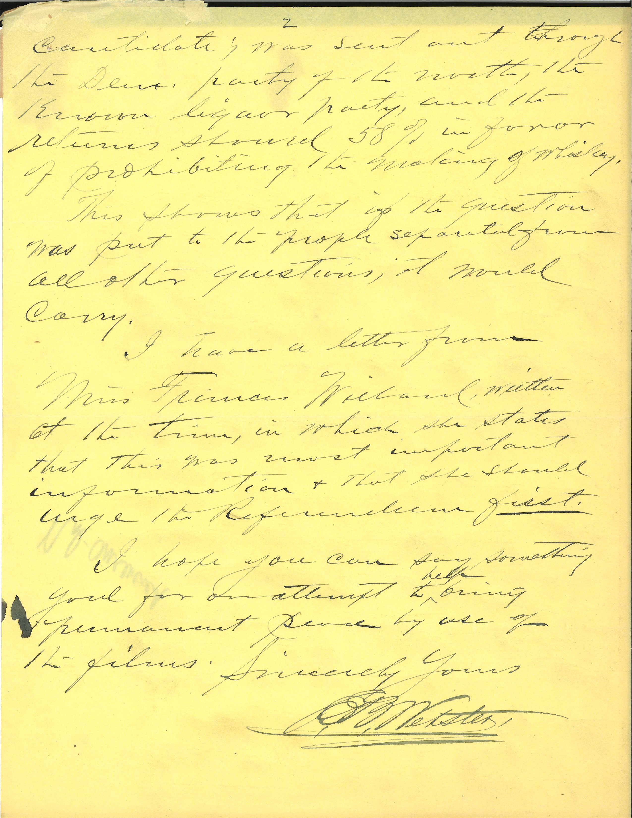 I was Secty of the first Referendum League in United States and while Nat'l Treas'r of The Patriots of America in '96 tabulated the returns from about 2 million Ref. Ballots sent out by the order. This ballot separated the question of the manufacture & sale of intoxicants from the Presidential [page 2] [candidate] & was sent out through the Dem. party of the north, the known liquor party, and the returns showed 58% in favor of prohibiting the making of whiskey.