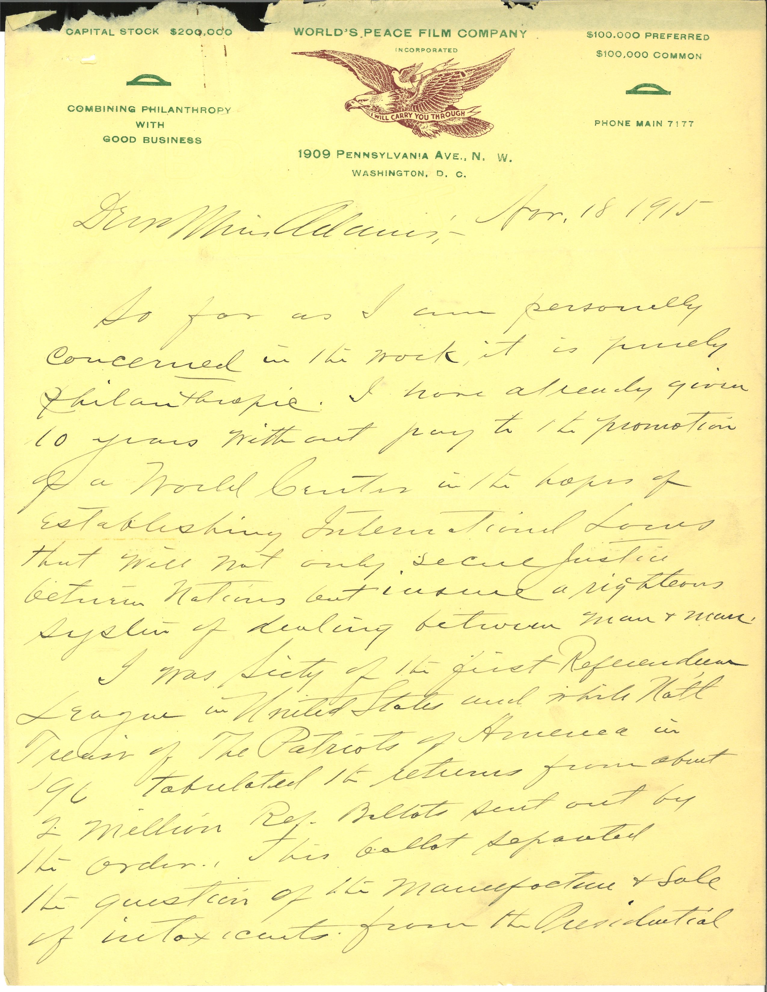 Dear Miss [Addams]: --So far as I am personally concerned in the work, it is purely philanthropic. I have already given 10 years without pay to the promotion of a World Center in the hopes of establishing International Laws that will not only secure justice between Nations but [ensure] a righteous system of dealing between man & man.