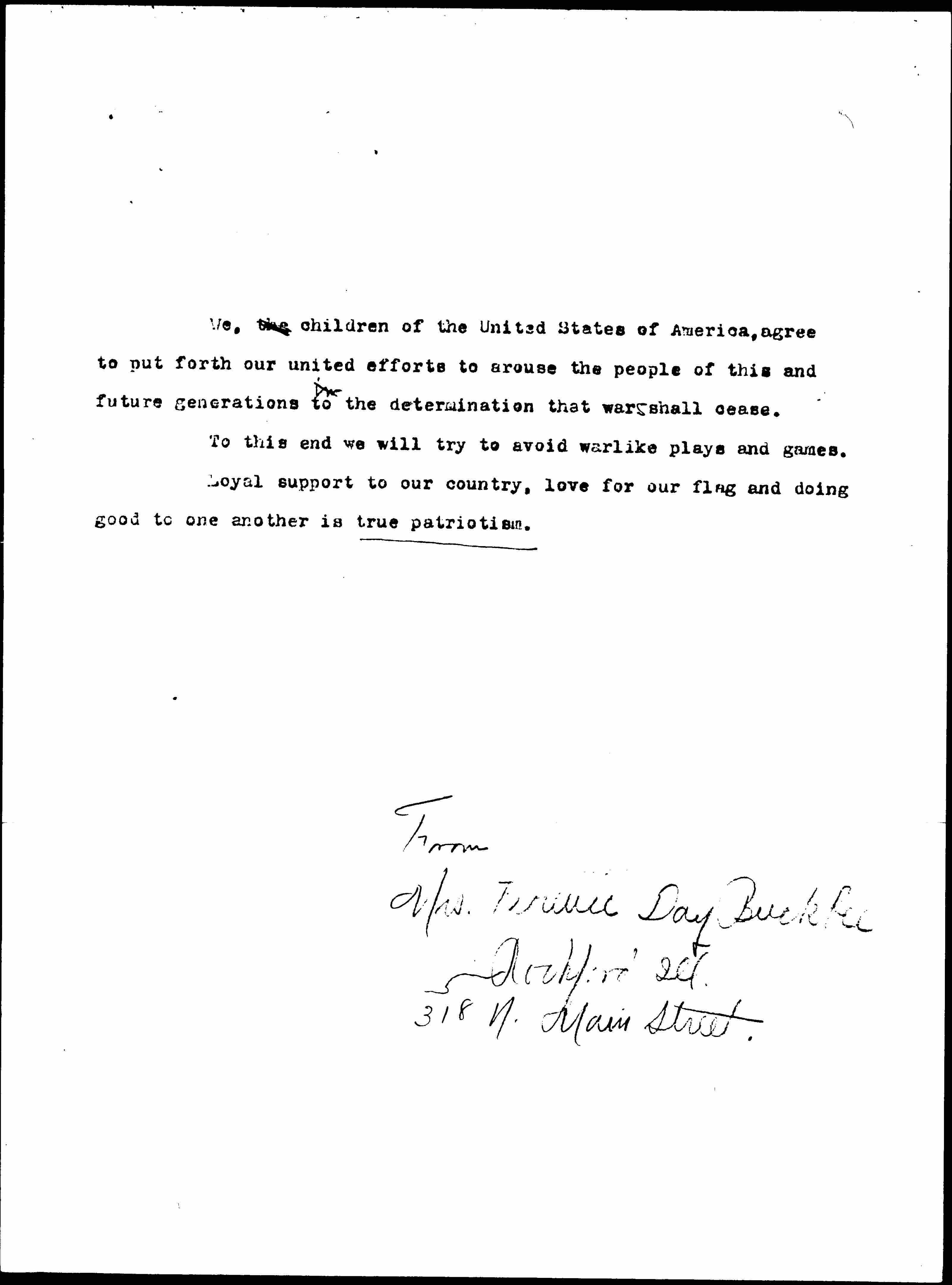 We, the children of the United States of America, agree to put forth our united efforts to arouse the people of this and future generations in to the determination that wars shall cease.