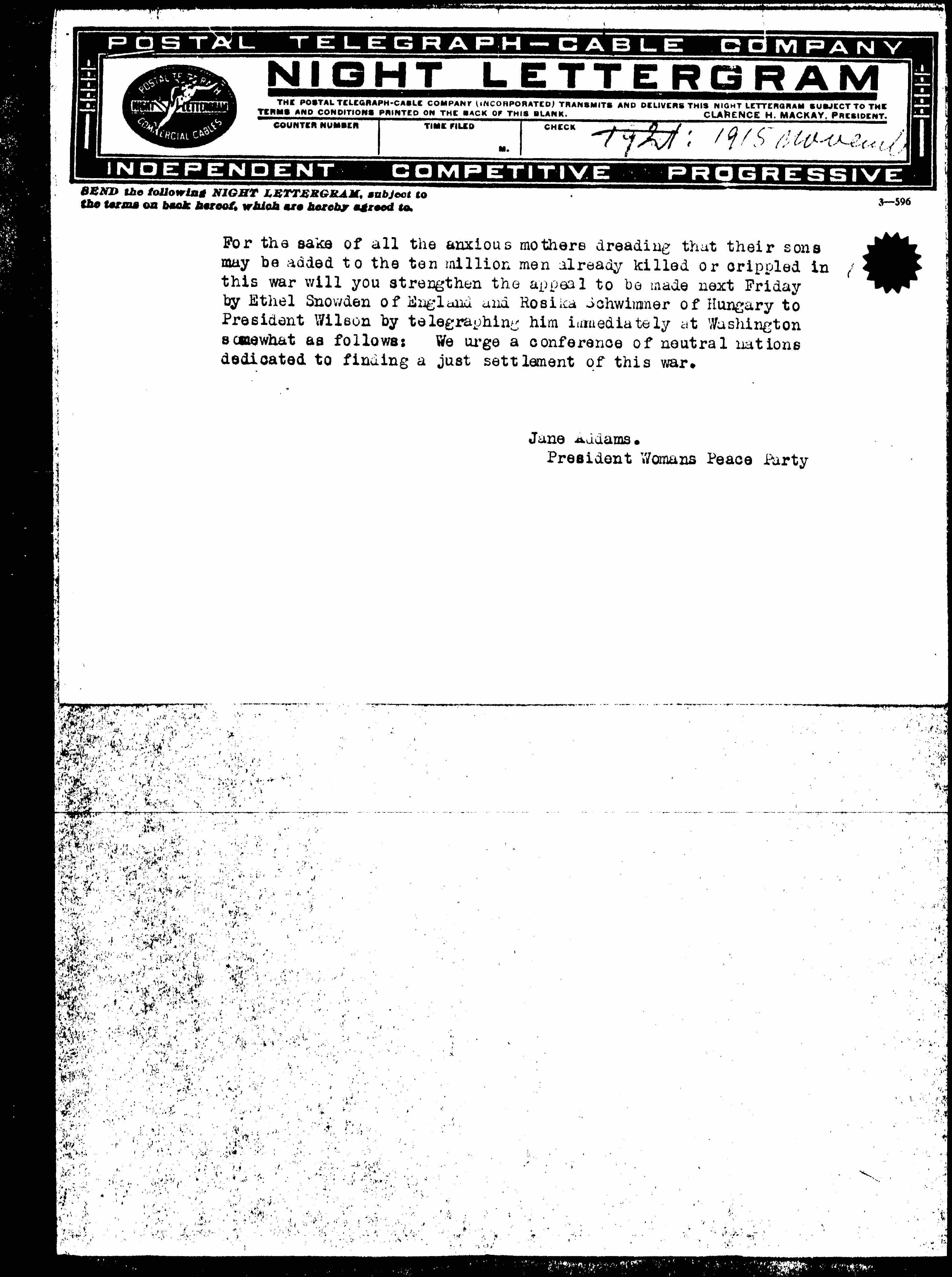 For the sake of all the anxious mothers dreading that their sons may be added to the ten million men already killed or crippled in this war will you strengthen the appeal to be made next Friday by Ethel Snowden of England and Rosika Schwimmer of Hungary to President Wilson by telegraphing him immediately at Washington somewhat as follows: We urge a conference of neutral nations dedicated to finding a just settlement of this war.