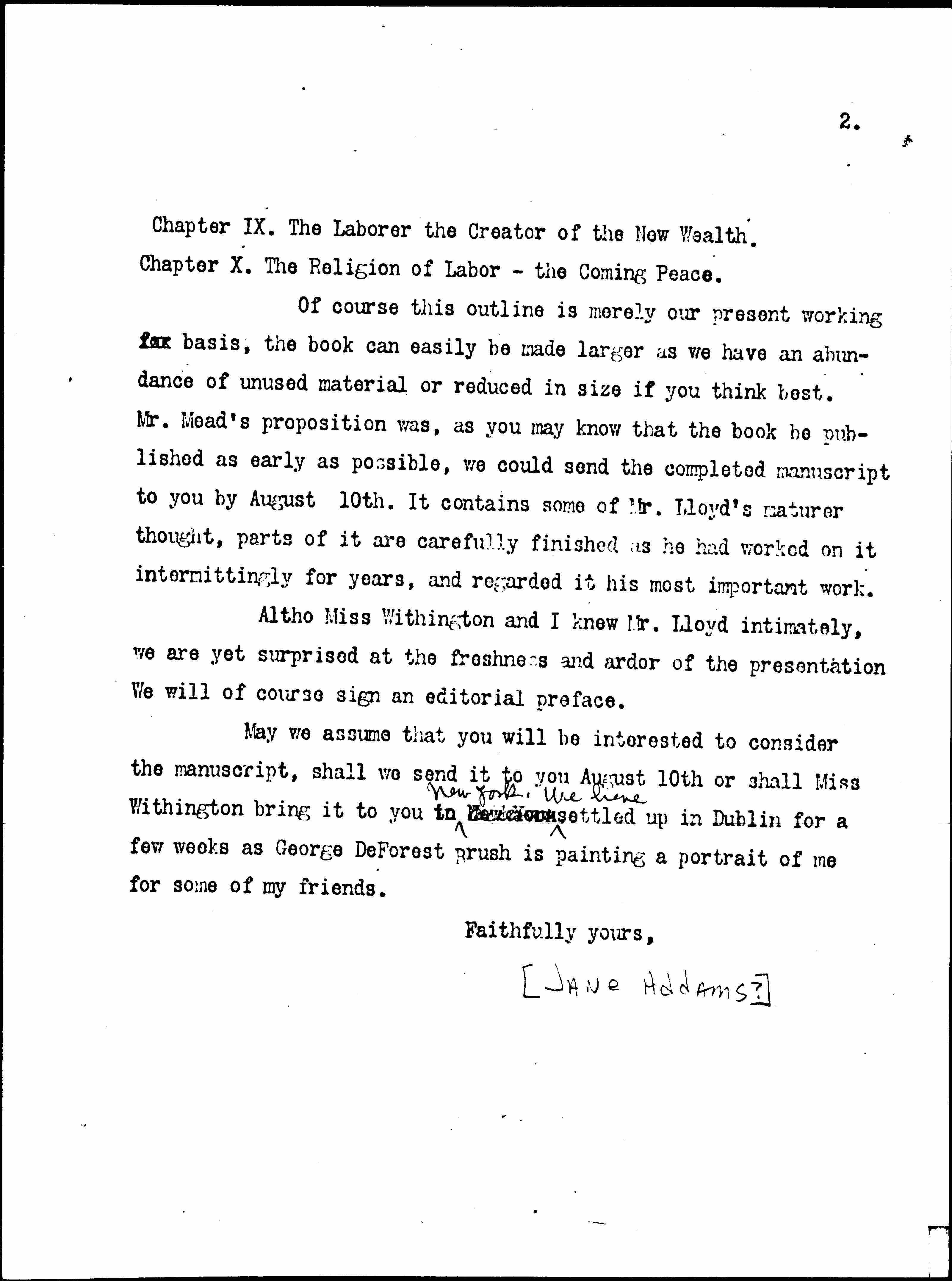May we assume that you will be interested to consider the manuscript, shall we send it to you August 10th or shall Miss Withington bring it to you in New York. ↑We have↓ settled up in Dublin for a few weeks as George DeForest Brush is painting a portrait of me for some of my friends.