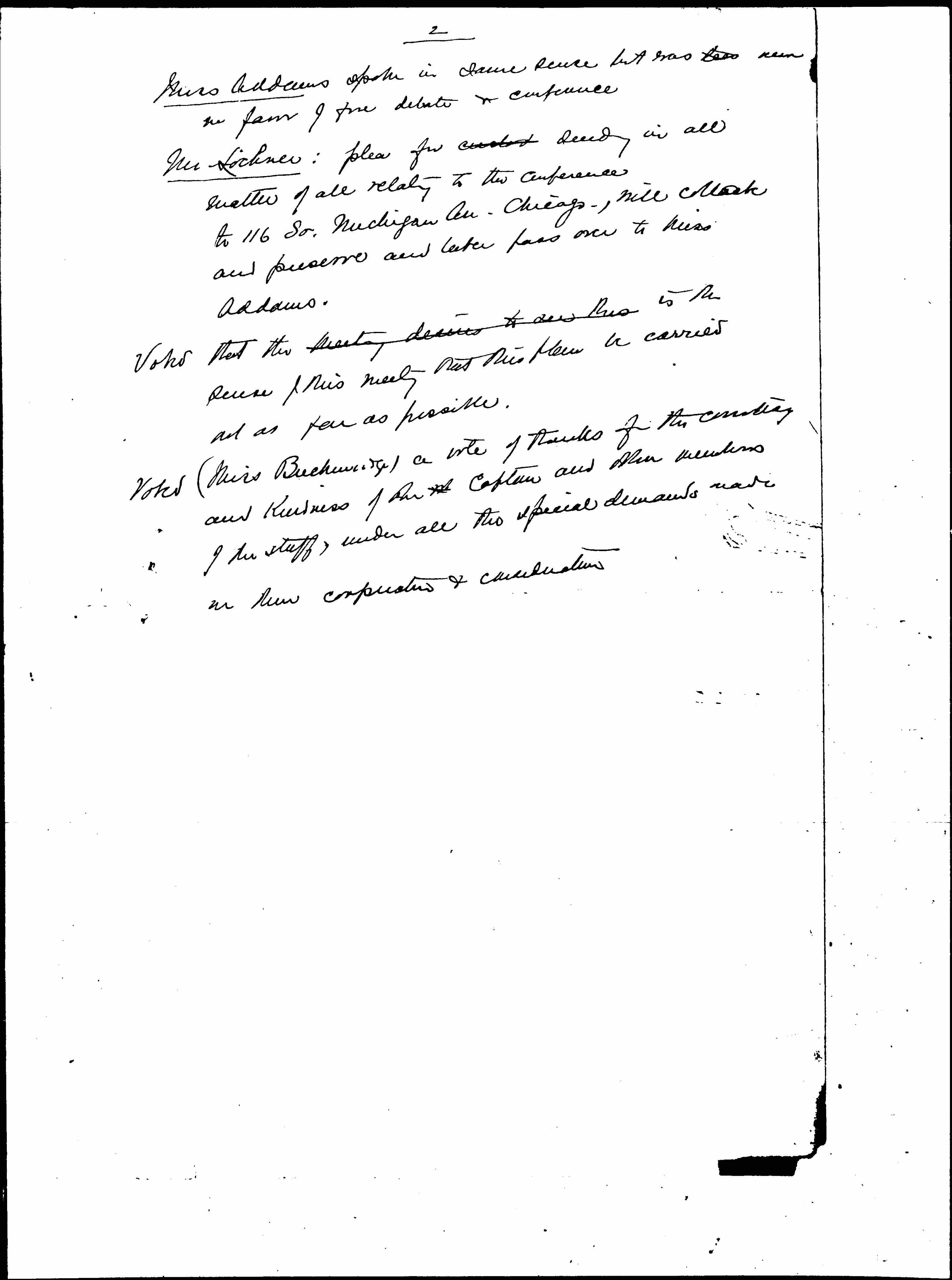 Mrs. Lawrence spoke of the character of the Conference, of its inevitable informality and of probability that rather than debate on floor should [illegible] leave much to meeting outside of meetings of the leaders and as much as possible unanimous consent [page 2]