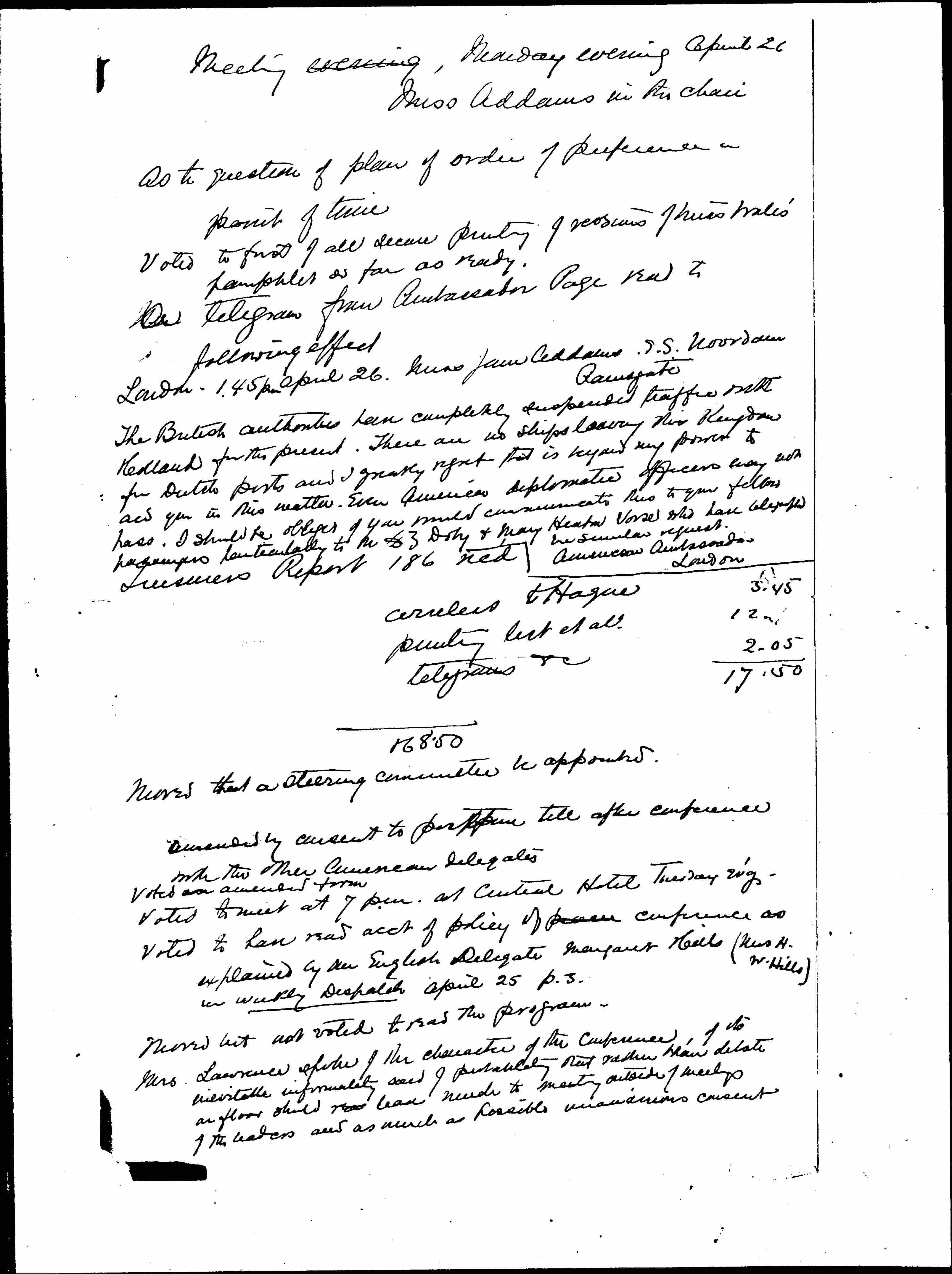 Voted to have read acct of policy of [peace] conference as explained by our English Delegate Margaret Hills (Mrs H. W. Hills) in Weekly Dispatch April 25 p. 3.
