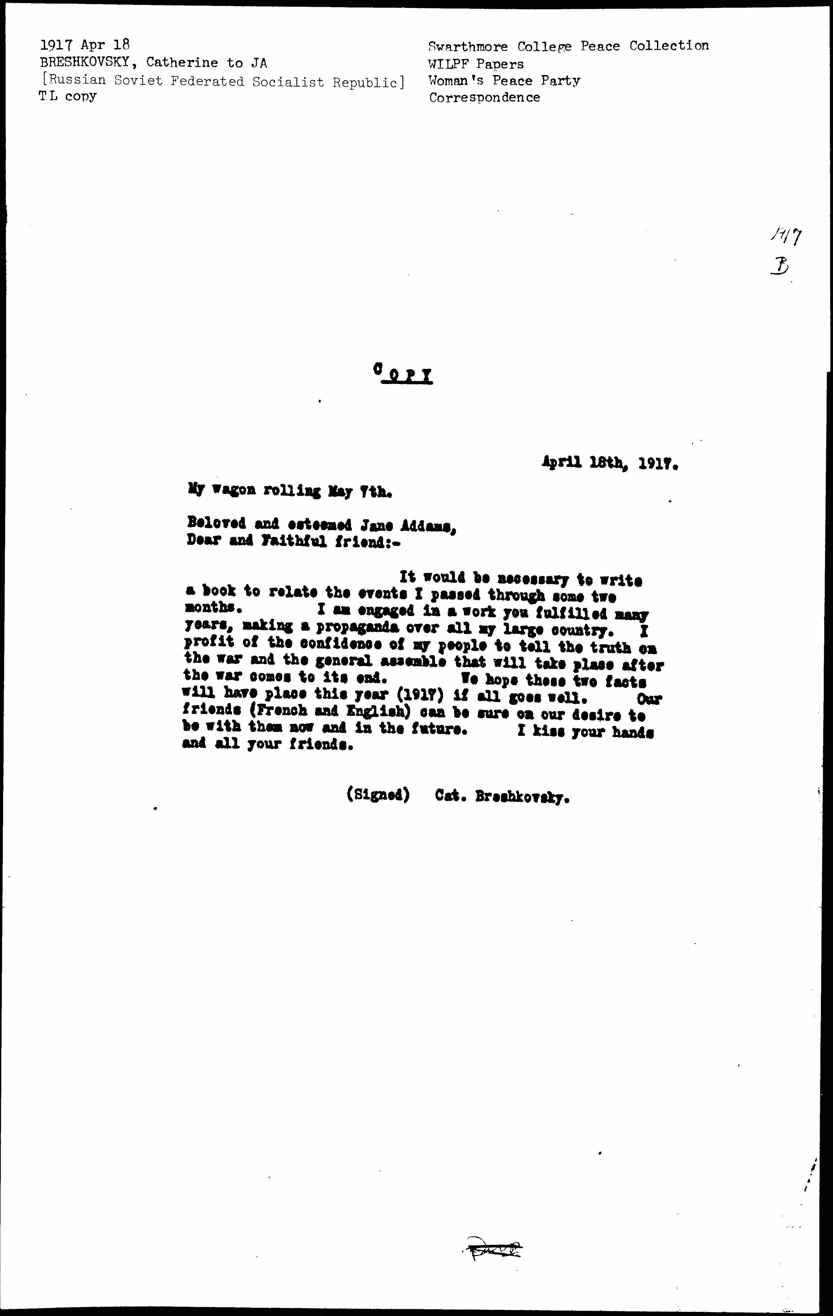 It would be necessary to write a book to relate the events I passed through some two months. I am engaged in a work you fulfilled many years, making a propaganda over all my large country. I profit of the confidence of my people to tell the truth on the war and the general assemble that will take place after the war comes to its end. We hope these two facts will have place this year (1917) if all goes well. Our friends (French and English) can be sure on our desire to be with them now and in the future. I kiss your hands and all your friends.