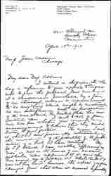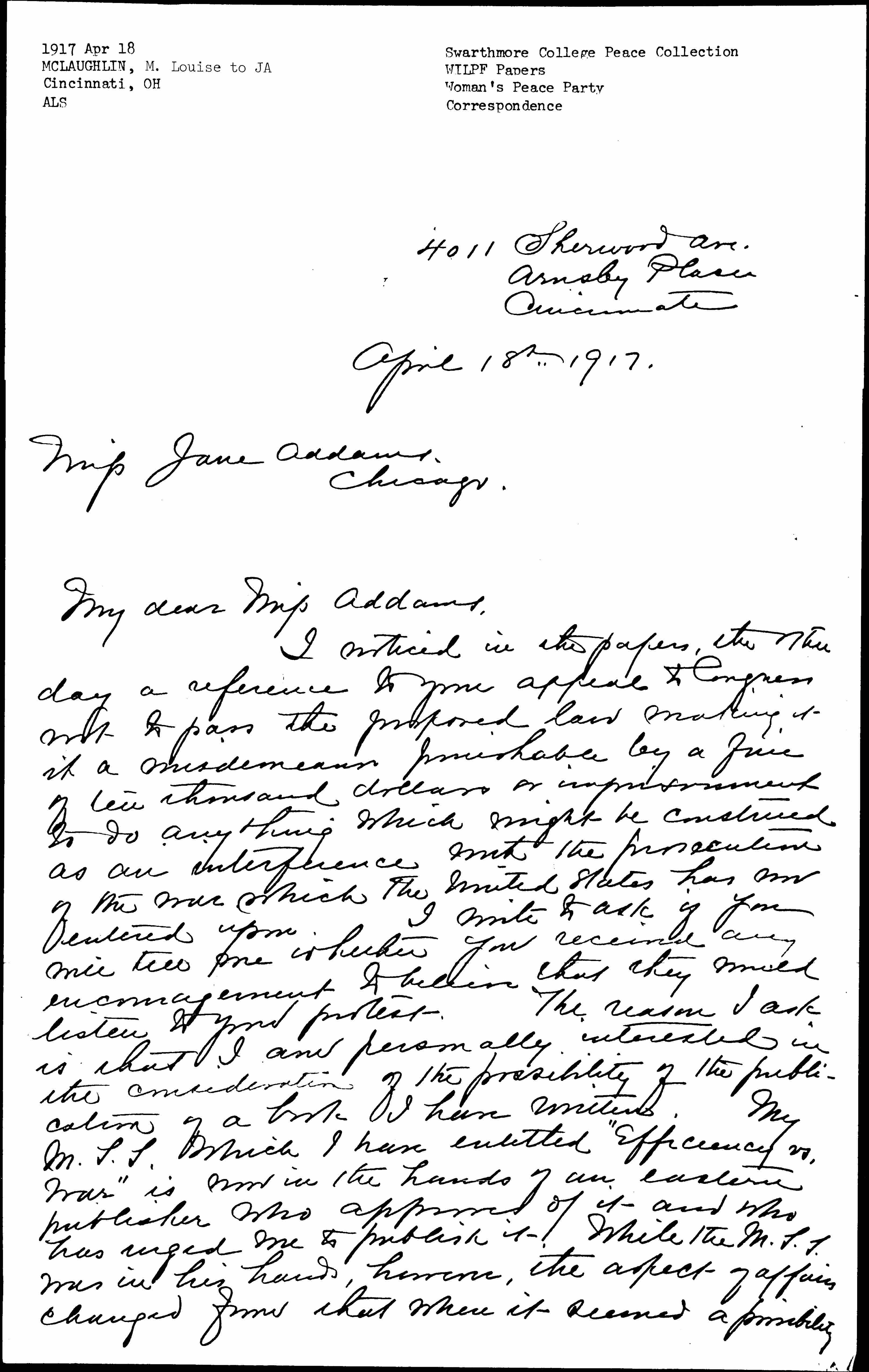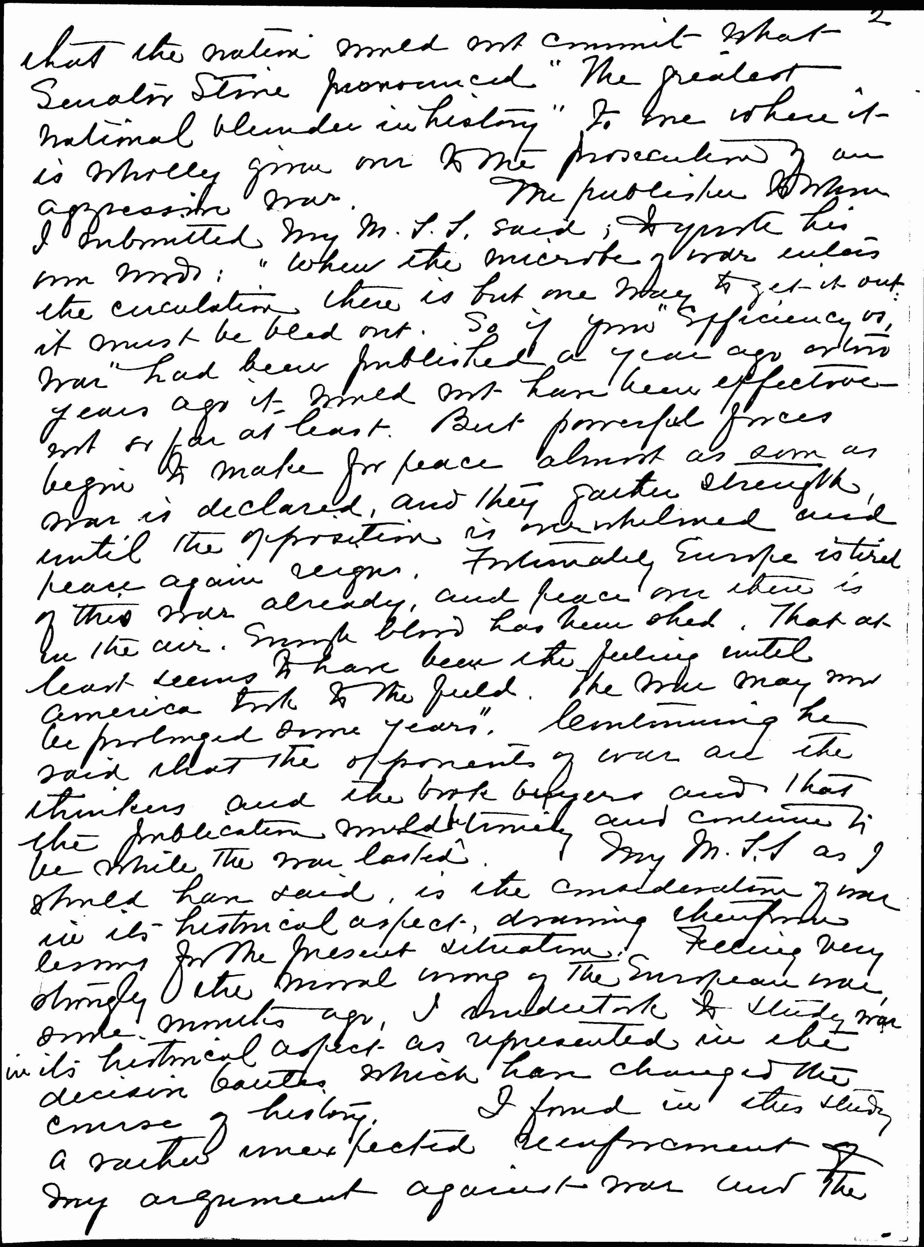 I noticed in the papers, the other day a reference to your appeal to Congress not to pass the proposed law making it a misdemeanor punishable by a fine of ten thousand dollars or imprisonment to do anything which might be construed as an interference with the prosecution of the war which the United States has now entered upon. I wish to ask if you will tell me whether you received any encouragement to believe that they would listen to your protest. The reason I ask is that I am personally interested in the consideration of the possibility of the publication of a book I have written. My M.S.S. which I have entitled "Efficiency vs. War" is now in the hands of an eastern publisher who approves of it and who has urged me to publish it. While the M.S.S. was in his hands, however, the aspect of affairs changed from that where it seemed a possibility [page 2] that the nation would not commit what Senator Stone pronounced "The greatest national blunder in history" to one where it is wholly given over to the prosecution of an aggressive war. The publisher to where I submitted my M.S.S. said, to quote his own words: "where the microbe of war enters the circulation there is but one way to get it out: it must be bled out. So if your 'Efficiency vs. War' had been published a year ago or two years ago it would not have been effective -- not so far at least. But powerful forces begin to make for peace almost as soon as war is declared, and they gather strength, until the opposition is overwhelmed and peace again reigns. Fortunately Europe is tired of this war already, and peace over there is in the air. Enough blood has been shed. That at least seems to have been the feeling until America took to the field. The war may now be prolonged some years". Continuing he said that the opponents of war are the thinkers and the book buyers and that the publication would <be> timely and continue to be while the war lasted. My M.S.S. as I should have said, is the consideration of war in its historical aspect, drawing therefrom lessons for the present situation. Feeling very strongly the moral wrong of the European war, some months ago, I undertook to study war <in> its historical aspect as represented in the decisive [battles] which have changed the course of history. I found in this study a rather unexpected reinforcement of my argument against war and the [page 3] result was that I combined with a condensed story of the historic conflicts referred to a summary of the conditions under which victory had been achieved, drawing therefrom a moral which set as naught the popularly received axioms of military science and pointed to the extreme uncertainty and inefficiency of warfare as a means of settling national difficulties.