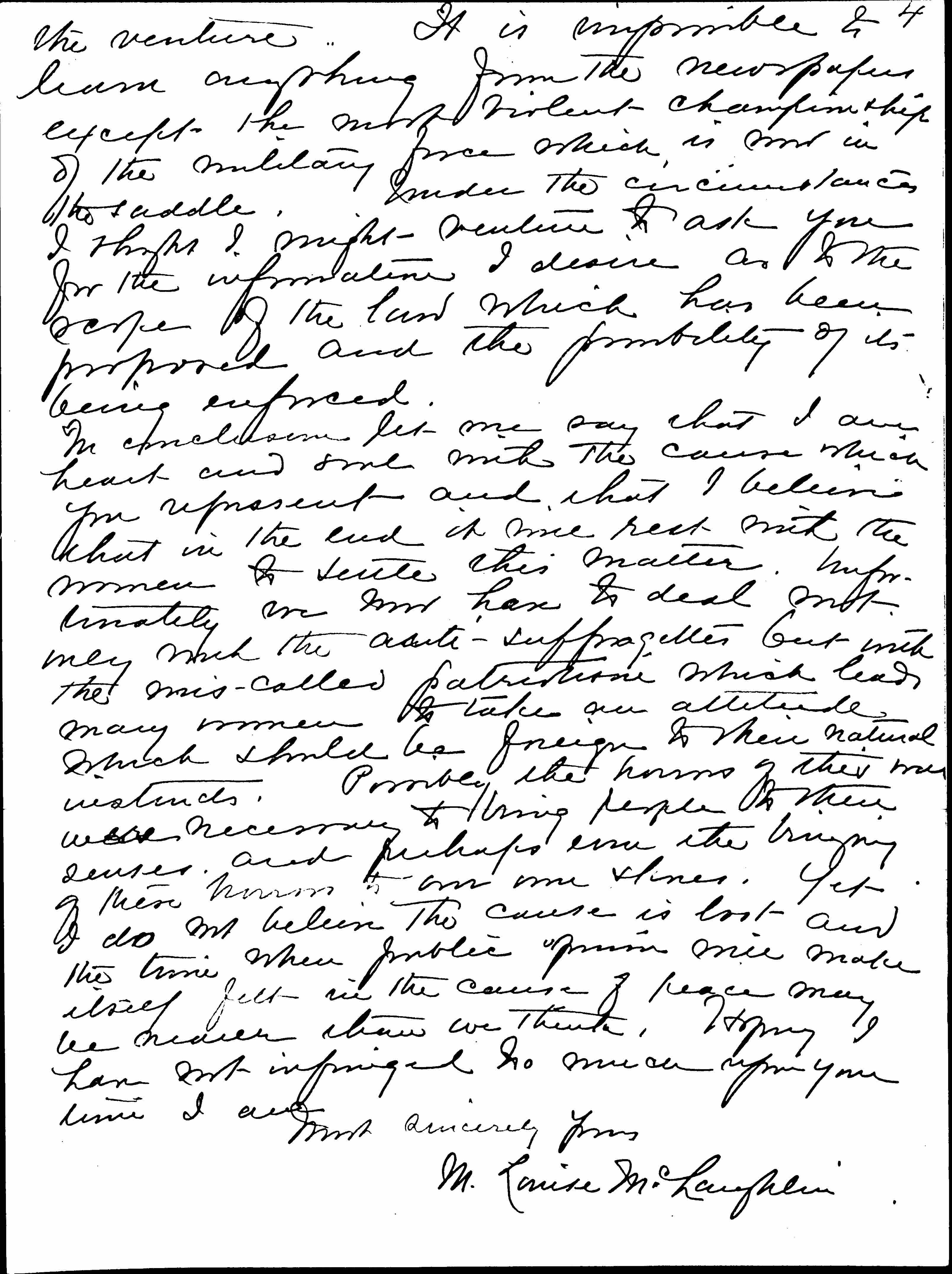 In conclusion let me say that I am heart and soul with the cause which you represent and that I believe that in the end it will rest with the women to settle this matter. Unfortunately we now have to deal not only with the anti-suffragettes but with the [miscalled] patriotism which leads many women to take an attitude which should be foreign to their natural instincts. Possibly the horrors of this war were necessary to bring people to their senses and perhaps even the bringing of these horrors to our own [shores]. Yet I do not believe the cause is lost and the time when public opinion will make itself felt in the cause of peace may be nearer than we think. Hoping I have not infringed too much upon your time I am
