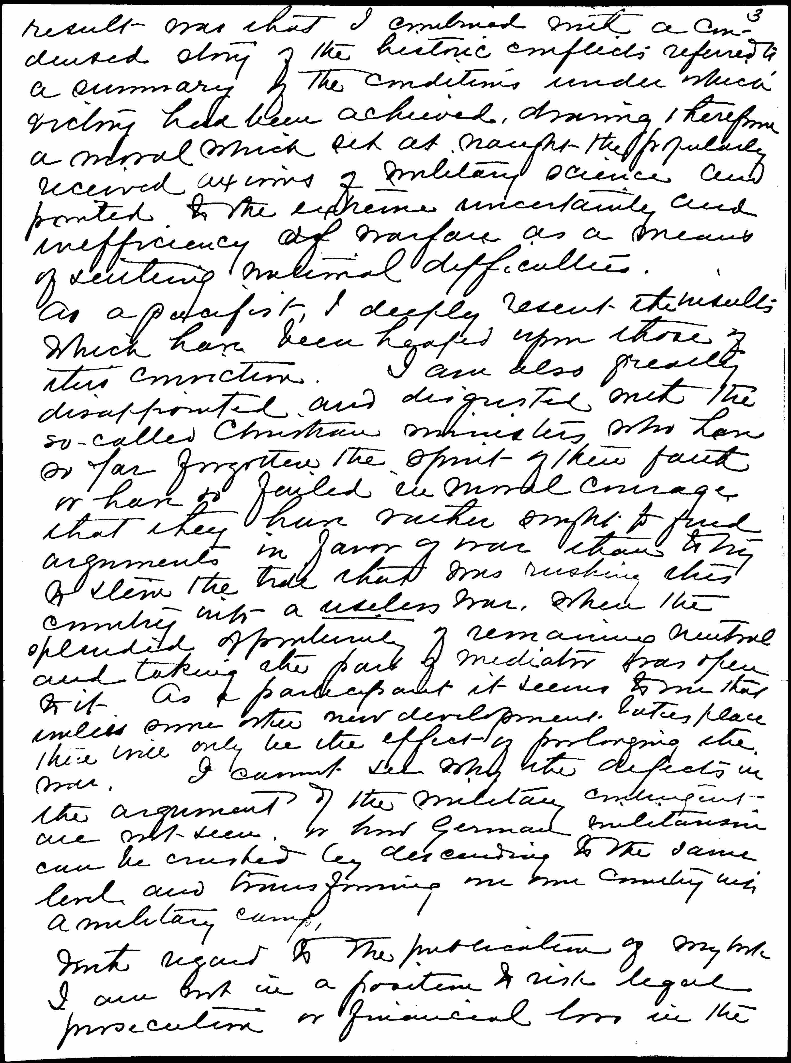 As a pacifist, I deeply resent the results which have been heaped upon those of this conviction. I am also greatly disappointed and disgusted with the so-called Christian ministers who have so far forgotten the spirit of their faith or have so failed in moral courage that they have rather sought to find arguments in favor of war than to try to stem the tide that was rushing this country into a useless war, when the splendid opportunity of remaining neutral and taking the part of mediator was open to it. As a participant it seems to me that unless some other new development takes place there will only be the effect of prolonging the war. I cannot see why the defects in the argument of the military contingent are not seen, or how German militarism can be crushed by descending to the same level and transforming our own country [into] a military camp.