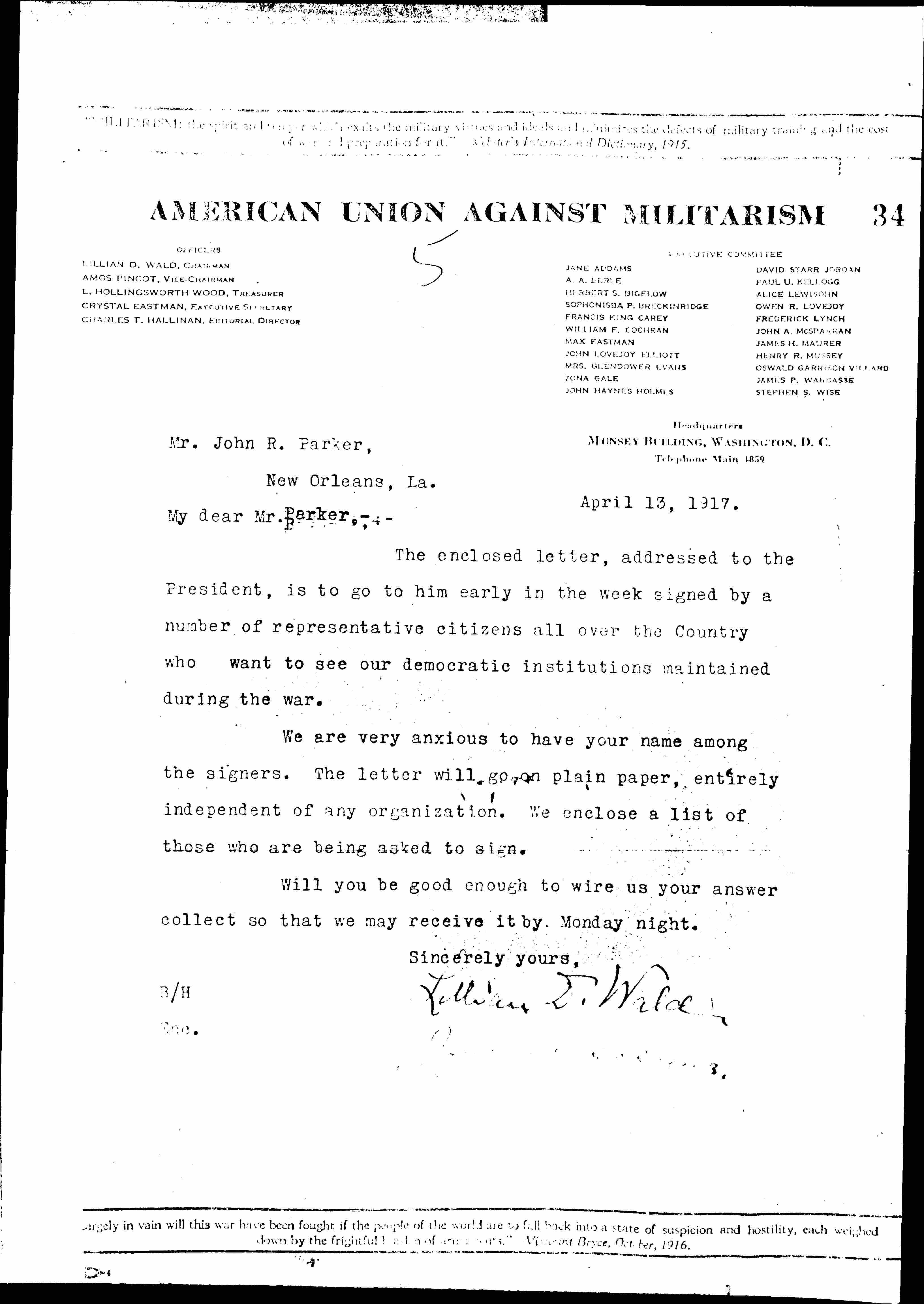 We are very anxious to have your name among the signers. The letter will go on plain paper, entirely independent of any organization. We enclose a list of those who are being asked to sign.