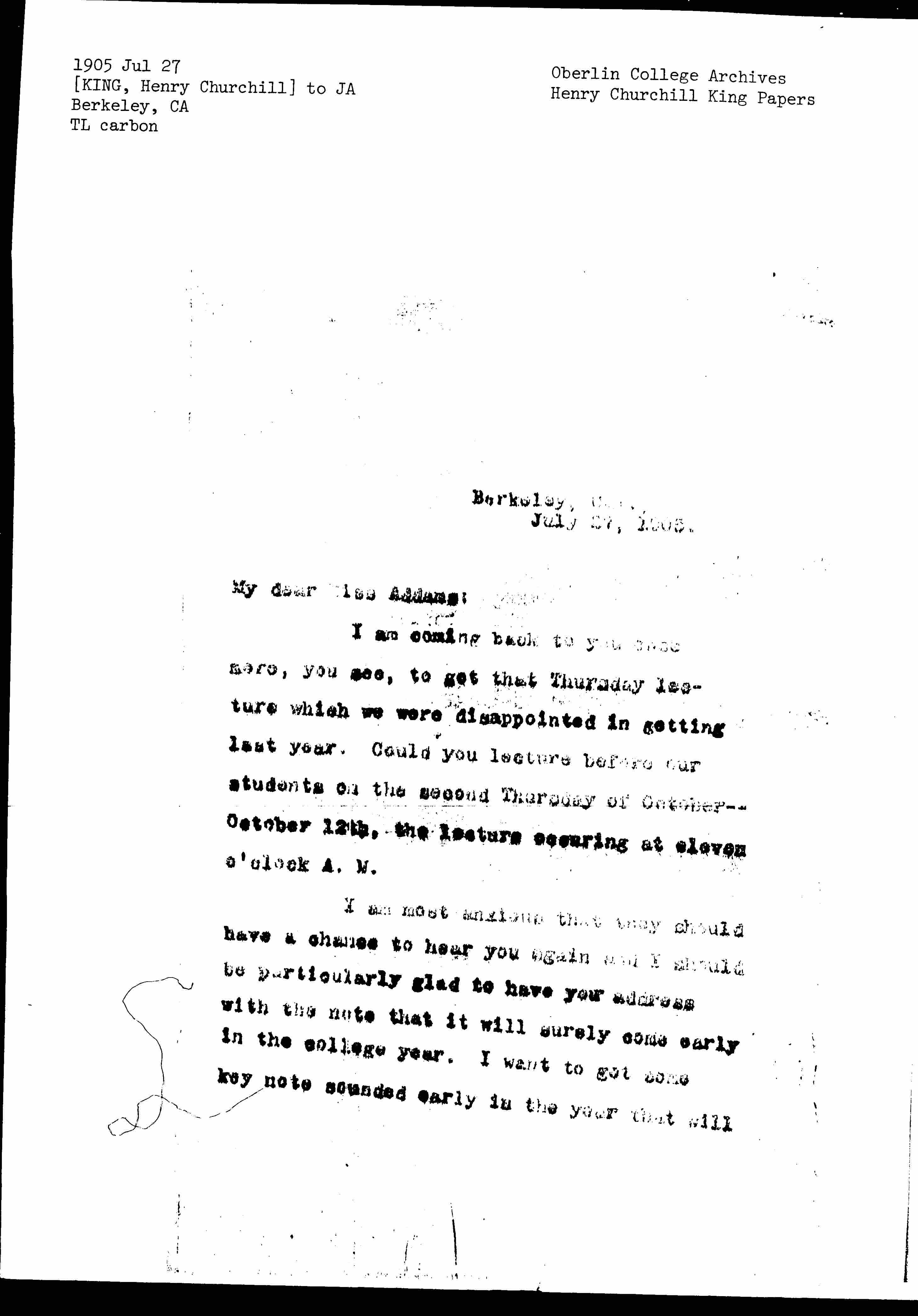 I am coming back to you once more, you see, to get that Thursday lecture which we were disappointed in getting last year. Could you lecture before our students on the second Thursday of October—October 12th, the lecture occuring at eleven o'clock A.M.