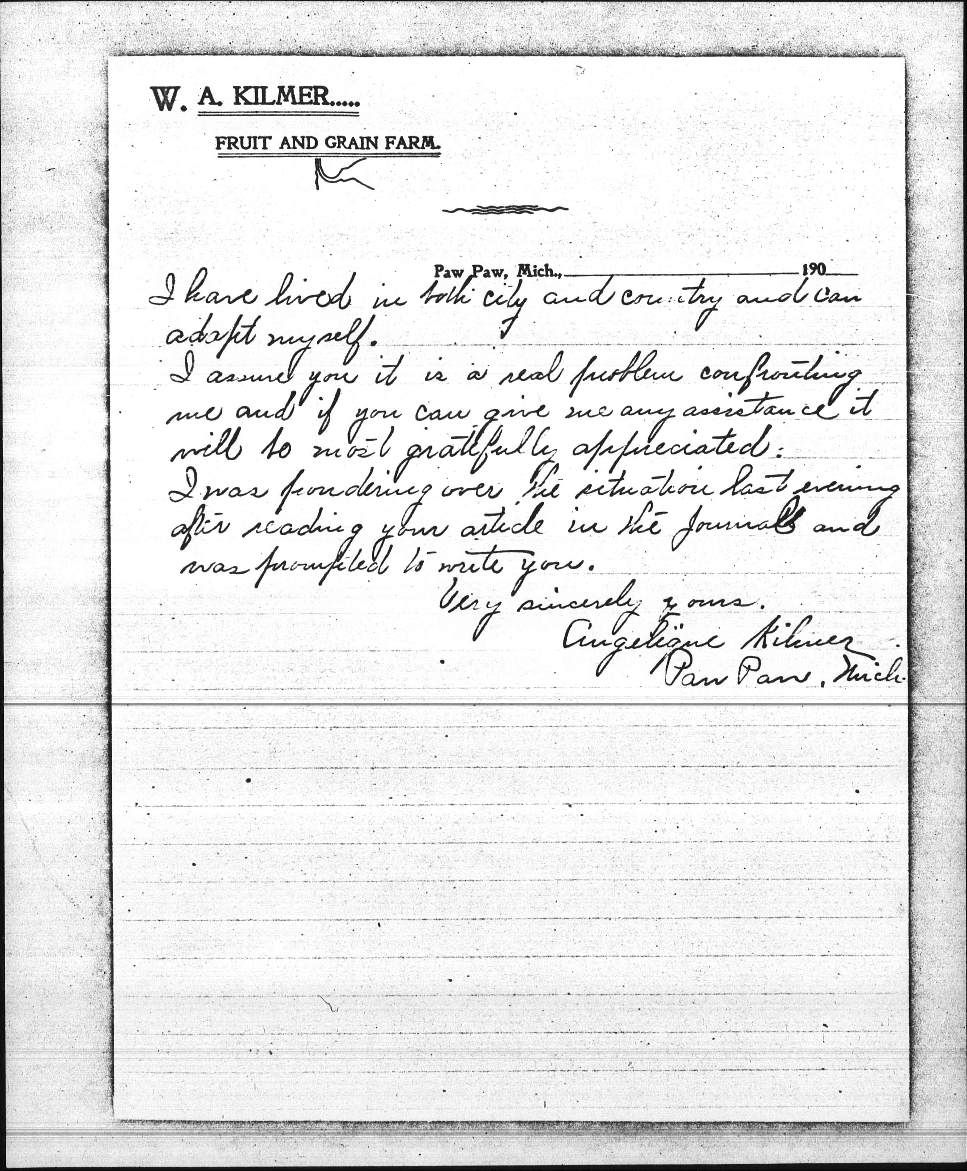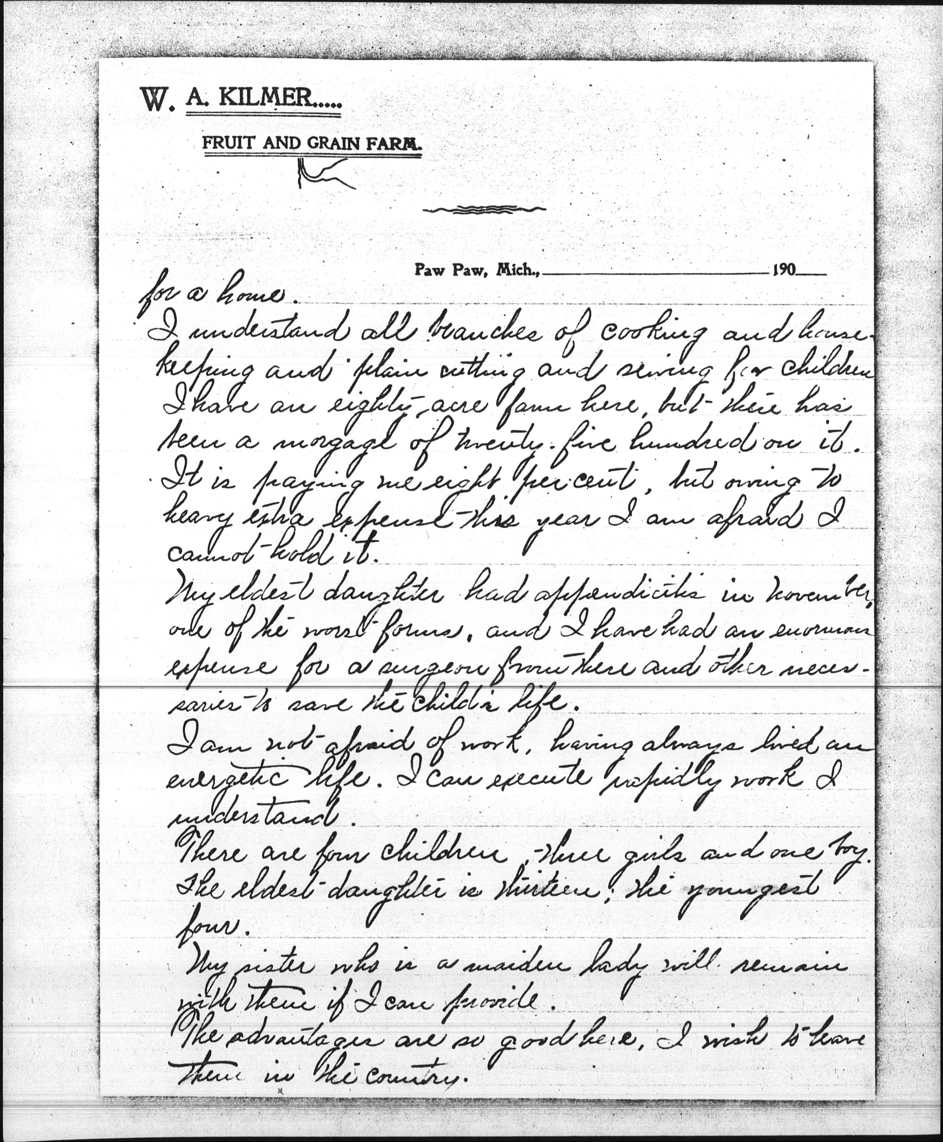 I understand all branches of cooking and housekeeping and plain cutting and sewing for children. I have an eighty-acre farm here, but there has been a [mortgage] of twenty-five hundred on it. It is paying me eight percent, but owing to heavy extra expenses this year I am afraid I cannot hold it.