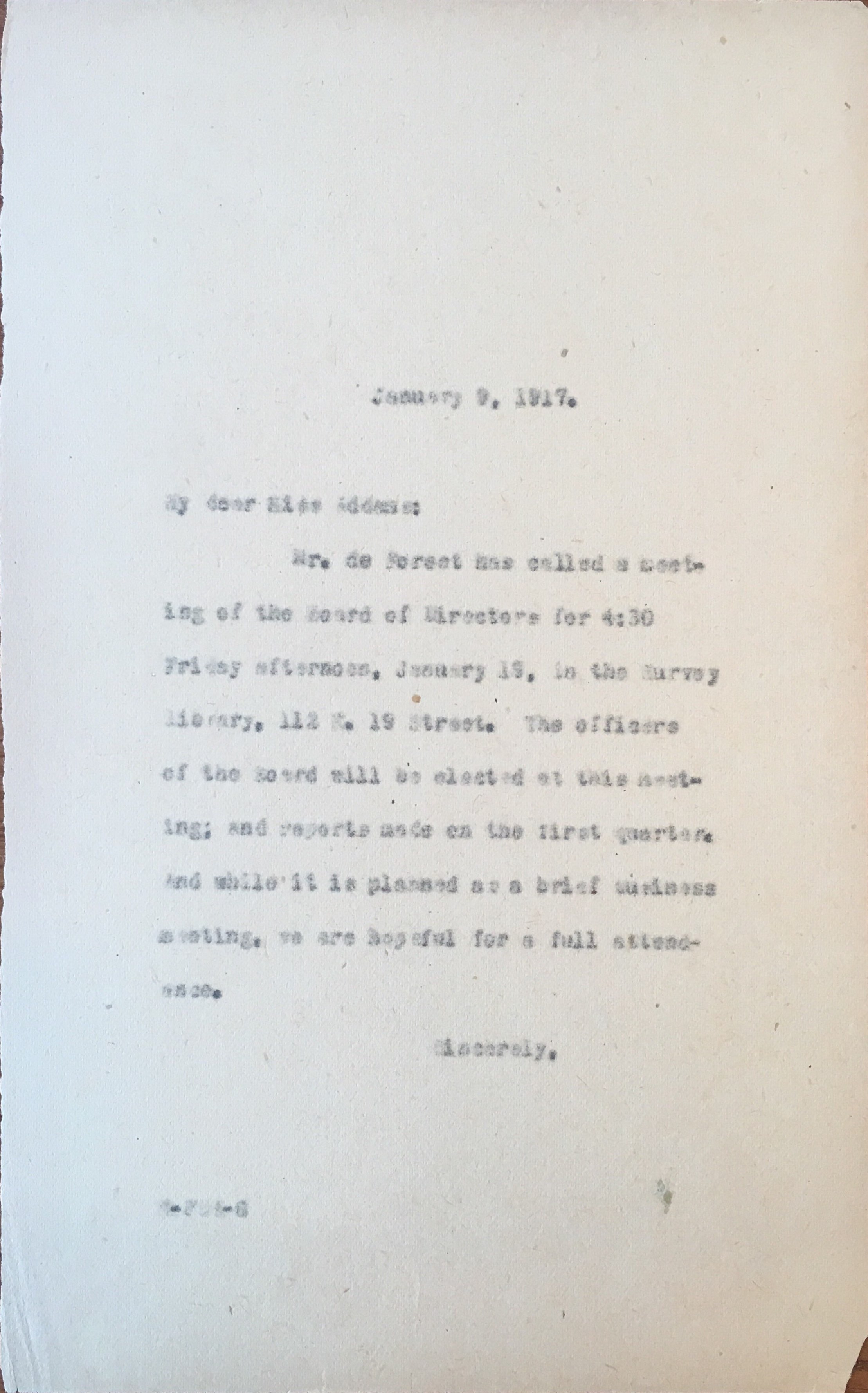 Mr. DeForest has called a meeting of the Board of Directors for 4:30 Friday afternoon, January 19, in the Survey library, 112 E. 19 Street. The officers of the Board will be elected at this meeting; and reports made on the first quarter. And while it is planned as a brief business meeting, we are hopeful for a full attendance.
