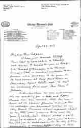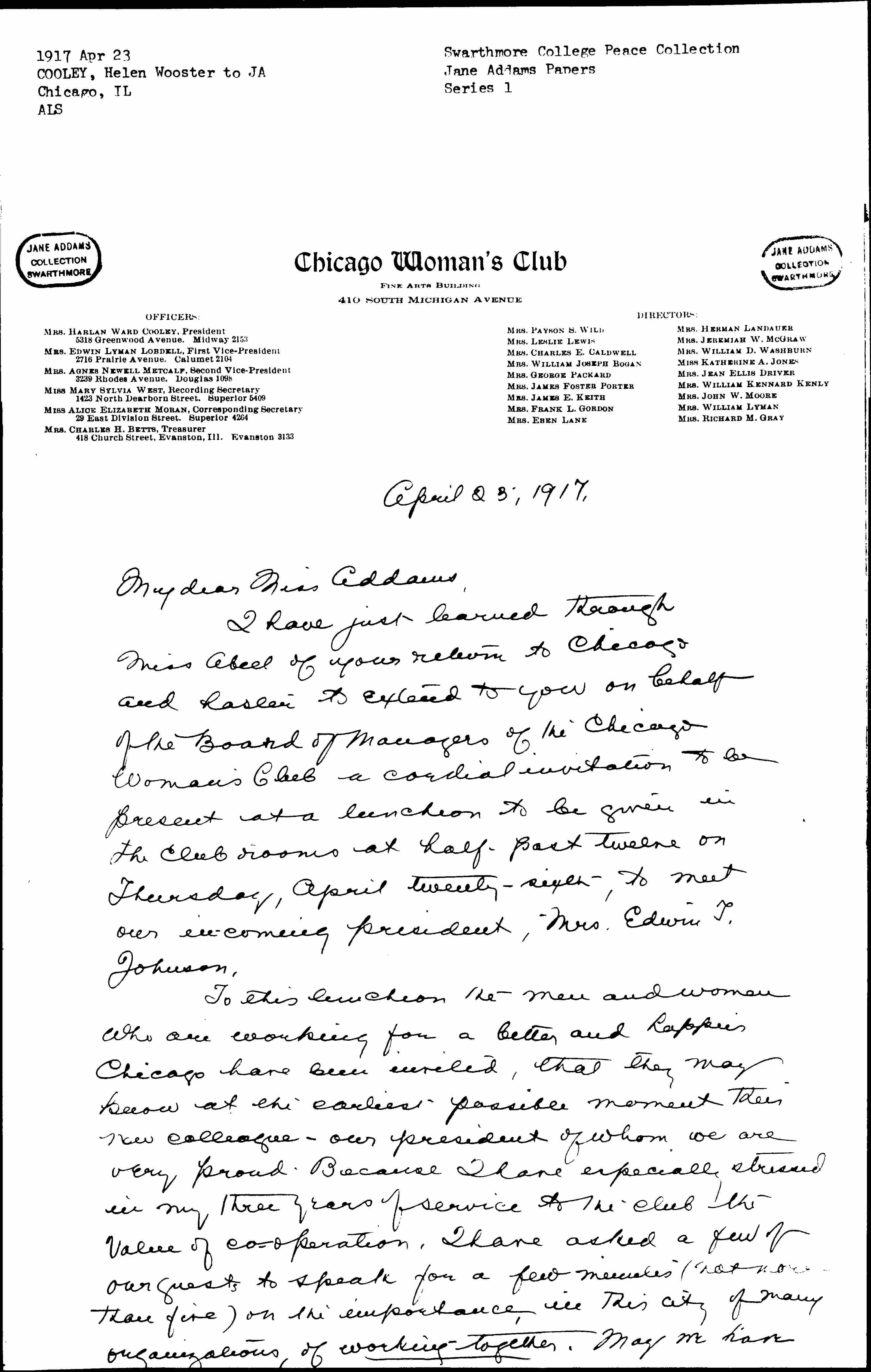 I have just learned through Miss Abeel of your return to Chicago and hasten to extend to you on behalf of the Board of Managers of the Chicago Woman's Club a cordial invitation to be present at a luncheon to be given in the club rooms at half-past twelve on Thursday, April twenty-sixth, to meet our incoming president, Mrs. Edwin T. Johnson.
