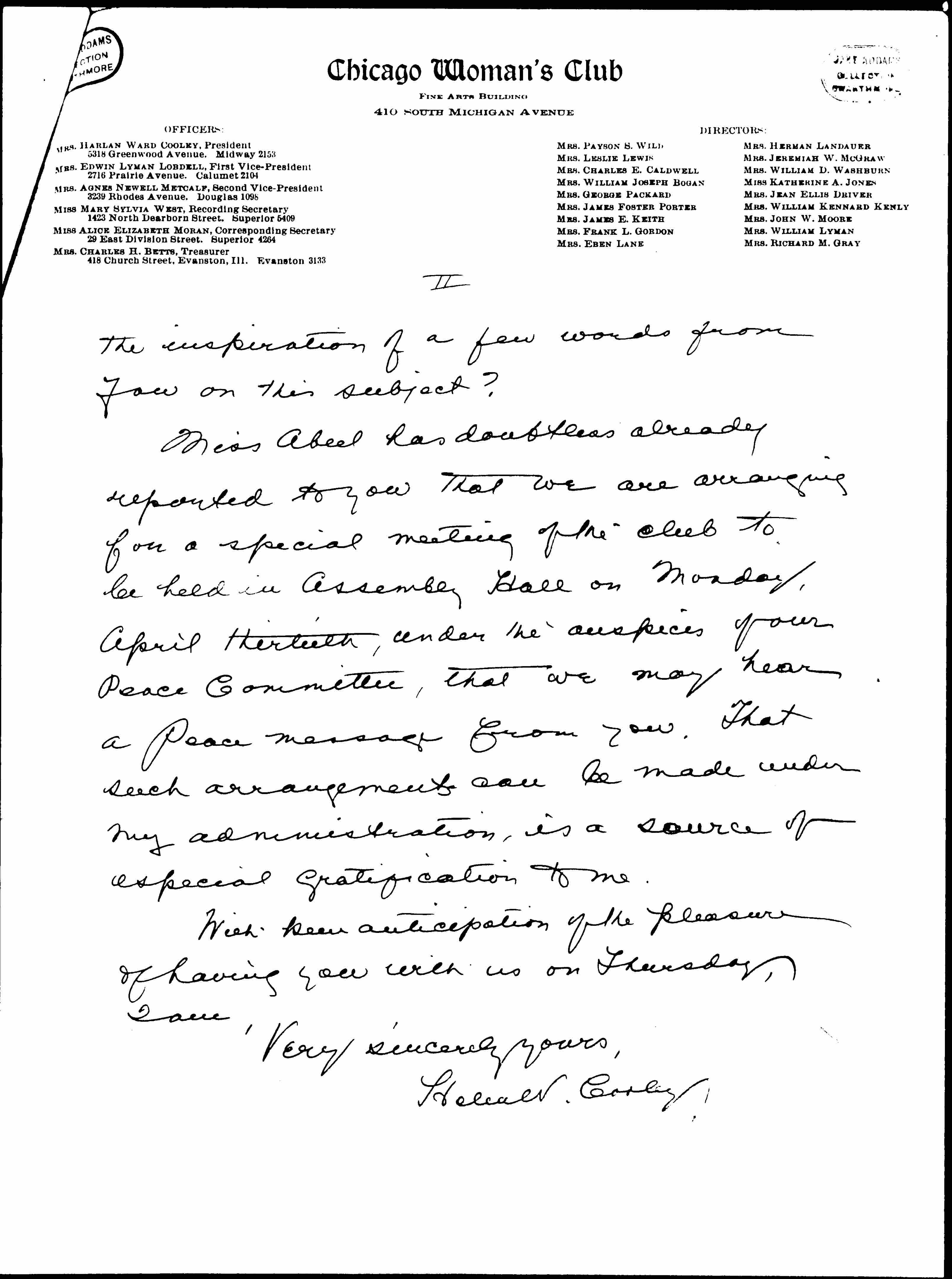 Miss Abeel has doubtless already reported to you that we are arranging for a special meeting of the club to be head in Assembly Hall on Monday, April thirteenth, under the auspices of our Peace Committee, that we may hear a Peace message from you. That such arrangements can be made under my administration is a source of especial gratification to me.