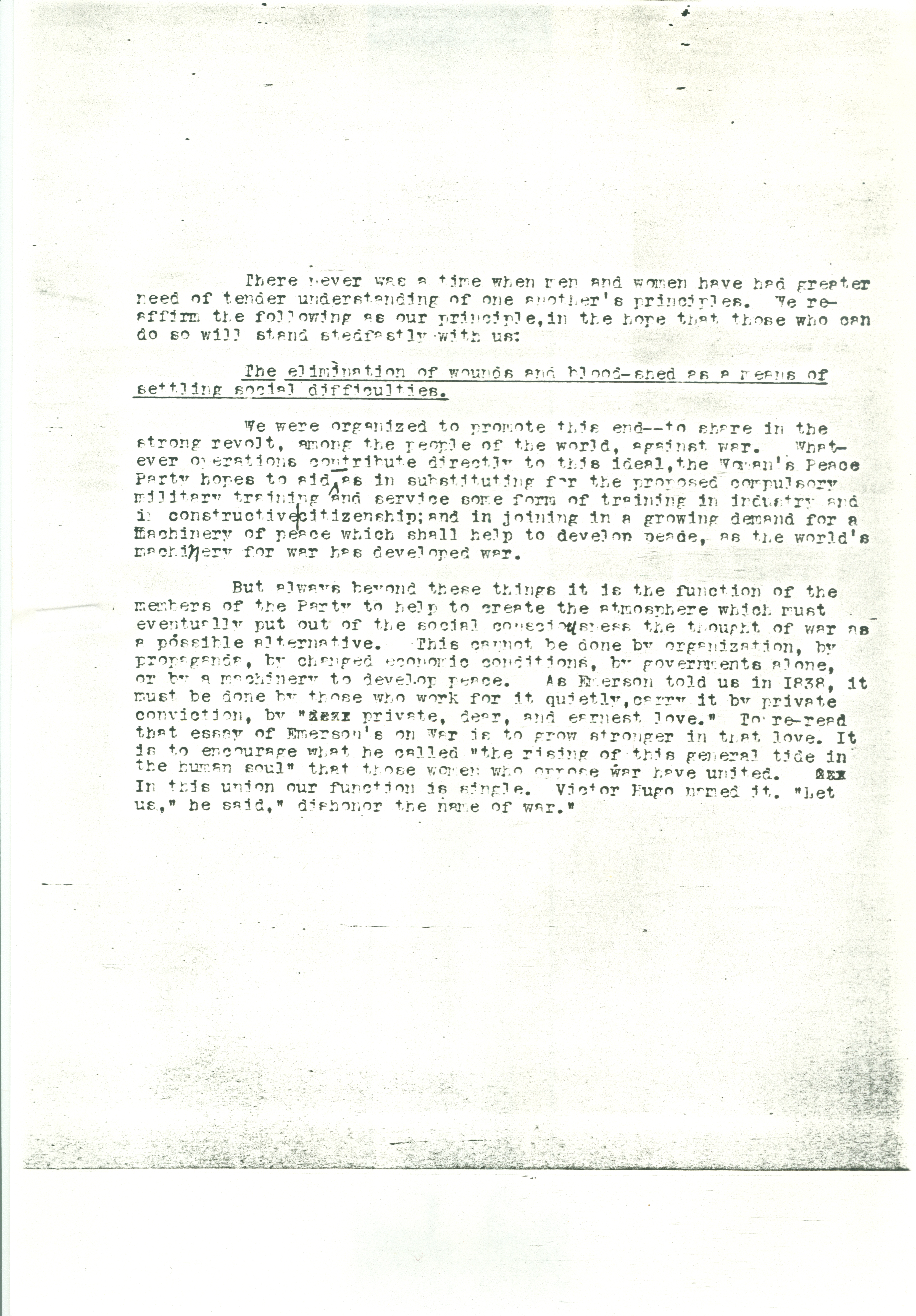 But always beyond these things it is the function of the members of the Party to help to create the atmosphere which must eventually put out of the social consciousness the thought of war as a possible alternative. This cannot be done by organization, by propaganda, by changed economic conditions, by governments alone, or by a machinery to develop peace. As Emerson told us in 1838, it must be done by those who work for it quietly, carry it by private conviction, by "dear private, dear, and earnest love." To [reread] that essay of Emerson's on War is to grow stronger in that love. It is to encourage what he called "the rising of this general tide in the human soul" that those women who oppose war have united. Our In this union our function is single. Victor Hugo named it. "Let us," he said, "dishonor the name of war."