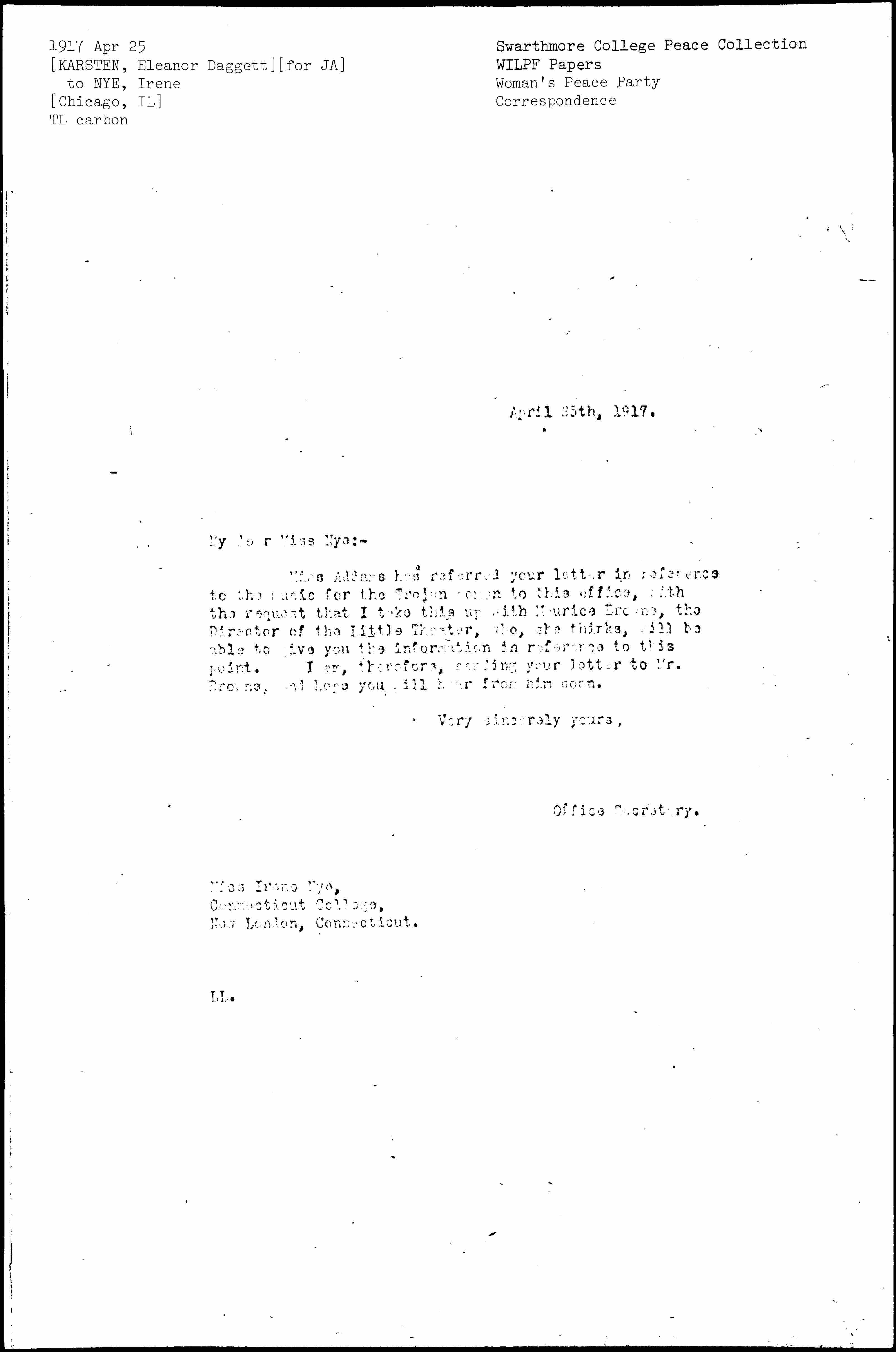 Miss Addams has referred your letter in reference to the music for the Trojan Women to this office, with the request that I take this up with Maurice Browne, the Director of the Little [Theatre], who, she thinks, will be able to give you the information in reference to this point. I am, therefore, sending your letter to Mr. Browne, and hope you will hear from him soon.