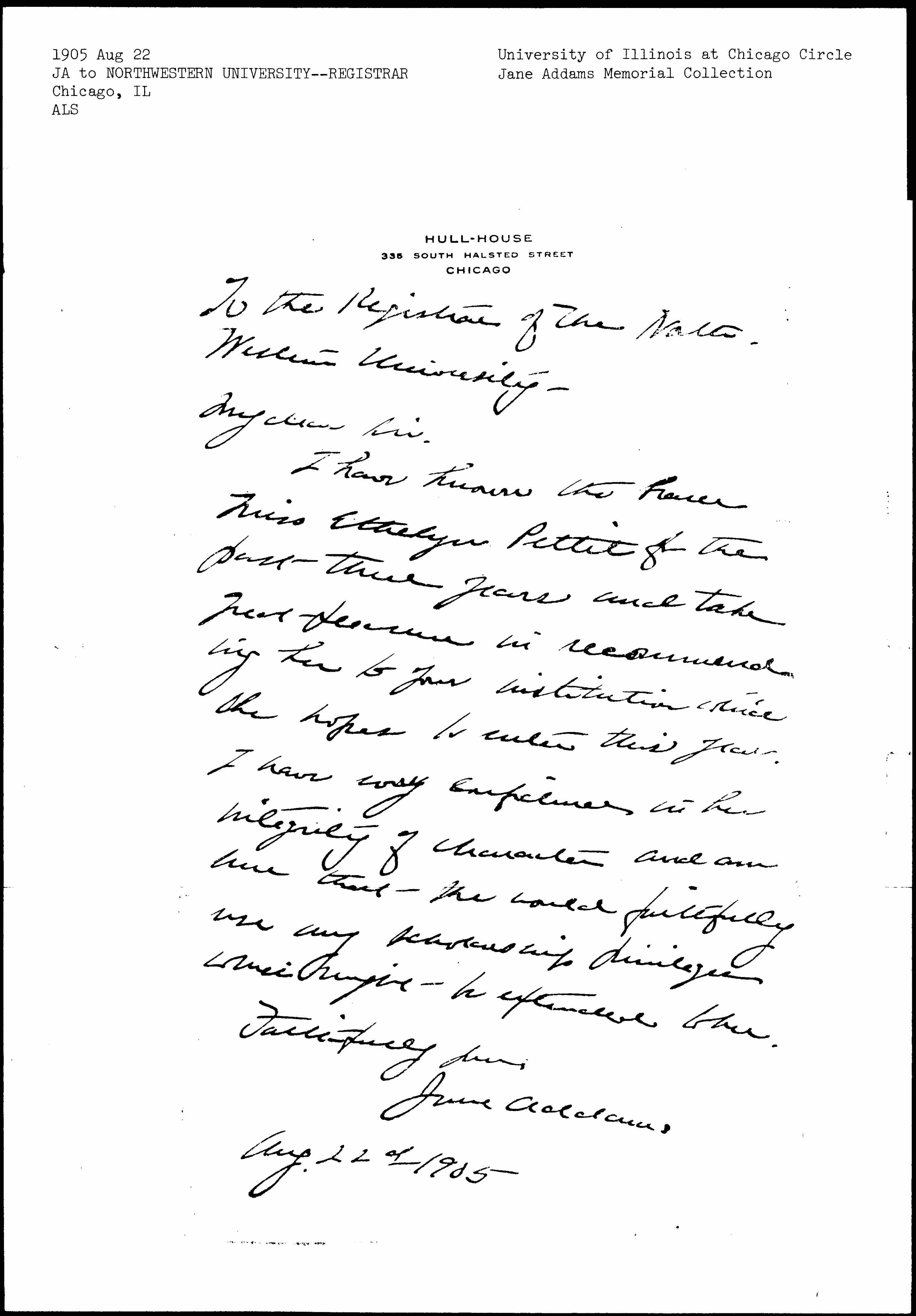I have known the bearer Miss Ethelyn Pettit for the past three years and take great pleasure in recommending her to your institution which she hopes to enter this year. I have every confidence in her integrity of character and am sure that she would faithfully use any scholarship privileges which might be extended to her.