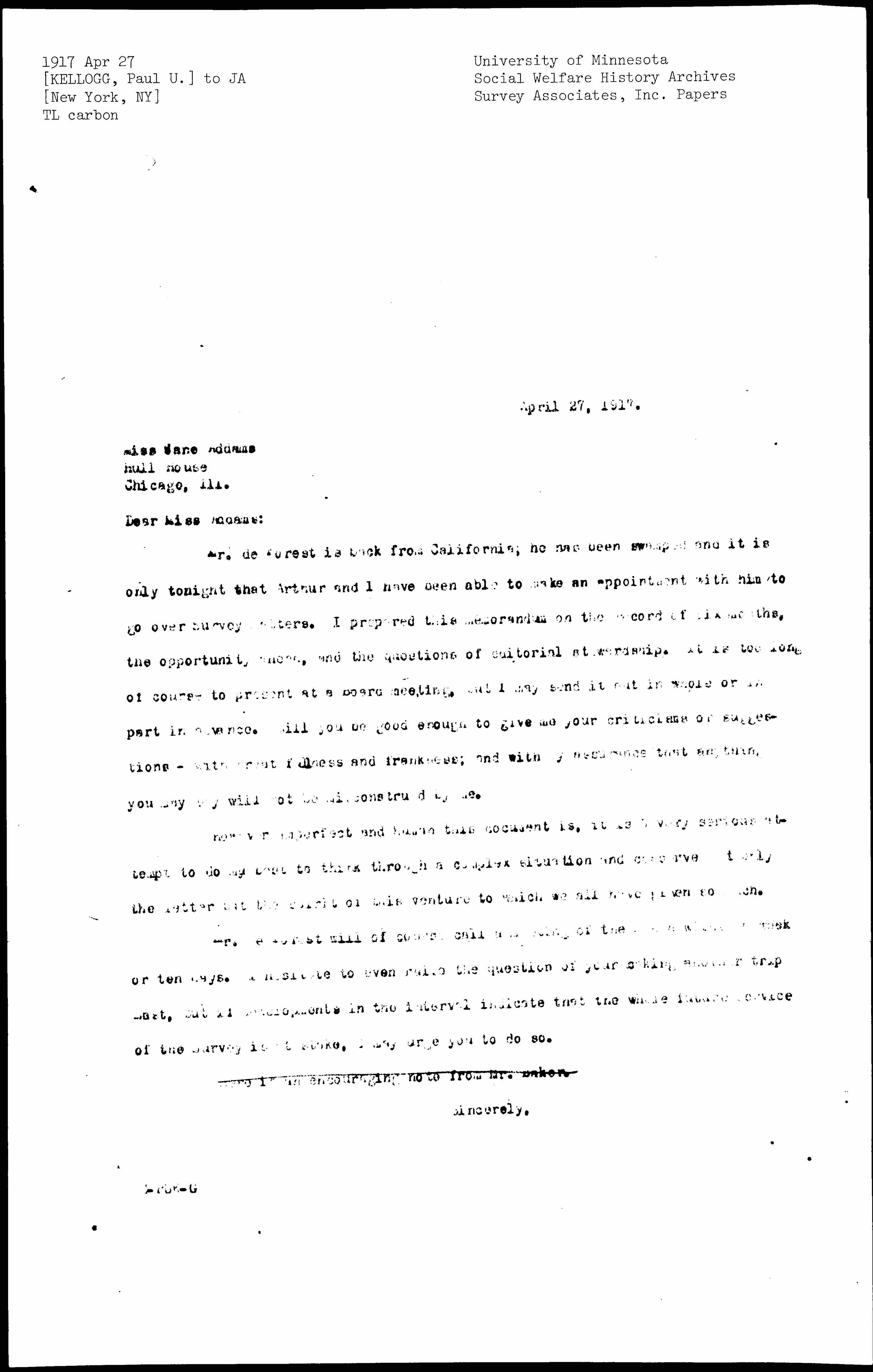 Mr. DeForest is back from California; he has been swamped and it is only tonight that Arthur and I have been able to make an appointment with him to go over Survey [matters]. I prepared this memorandum on the record of six months, the opportunity [there?], and the questions of editorial stewardship. It is too long of course to present at a board meeting, and I may send it out in whole or in part in advance. Will you be good enough to give me your criticisms or suggestions -- with great fullness and frankness; and with my assurance that anything you may say will not be misconstrued by me.