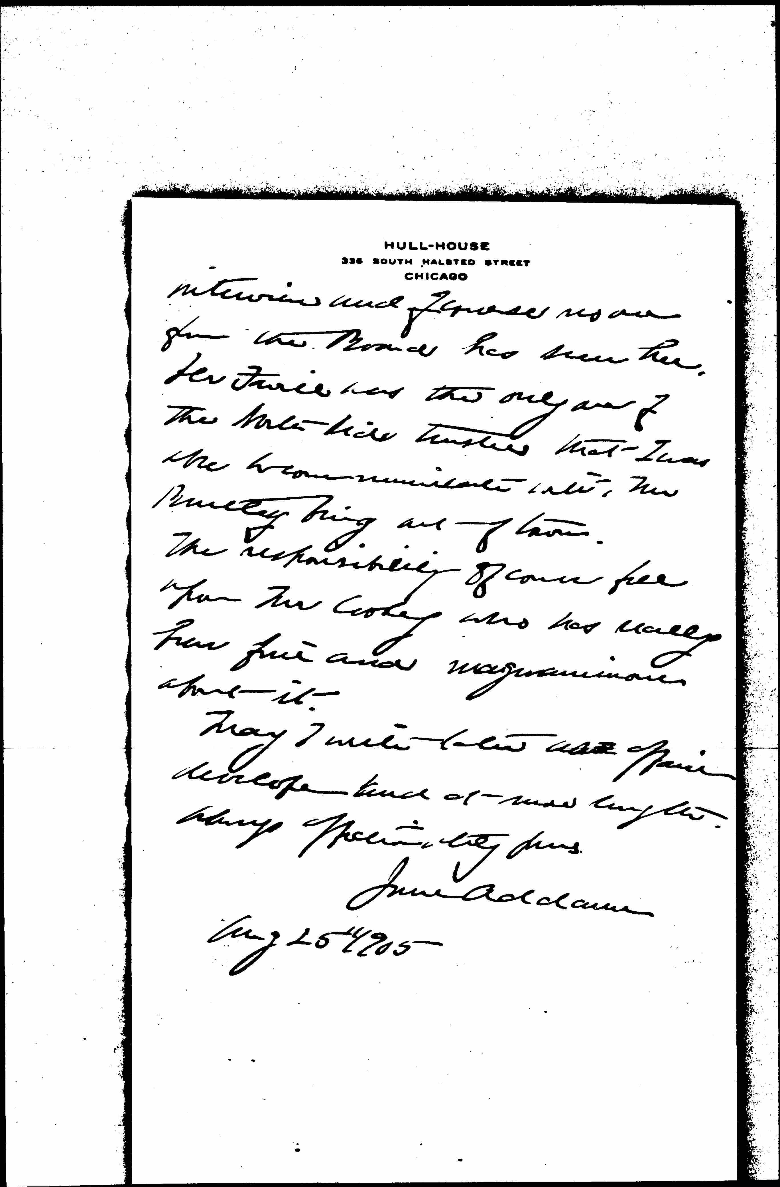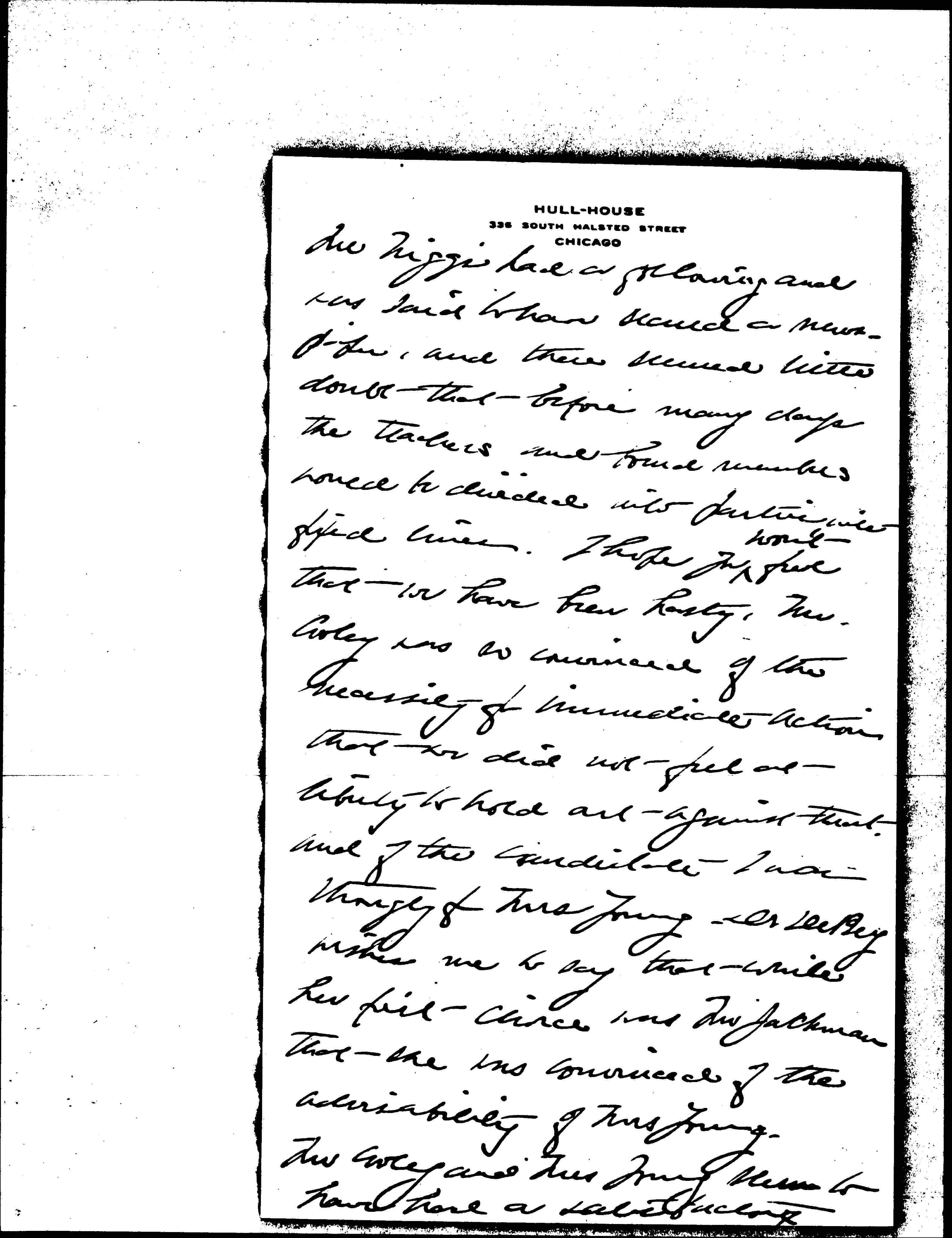 Mr Cooley and Mrs Young seem to have had a satisfactory [page 3] interview and of course no one from the Board has seen her. Dr [Favill] was the only one of the North Side trustees that I was able to communciate with, Mr Bentley being out of town.