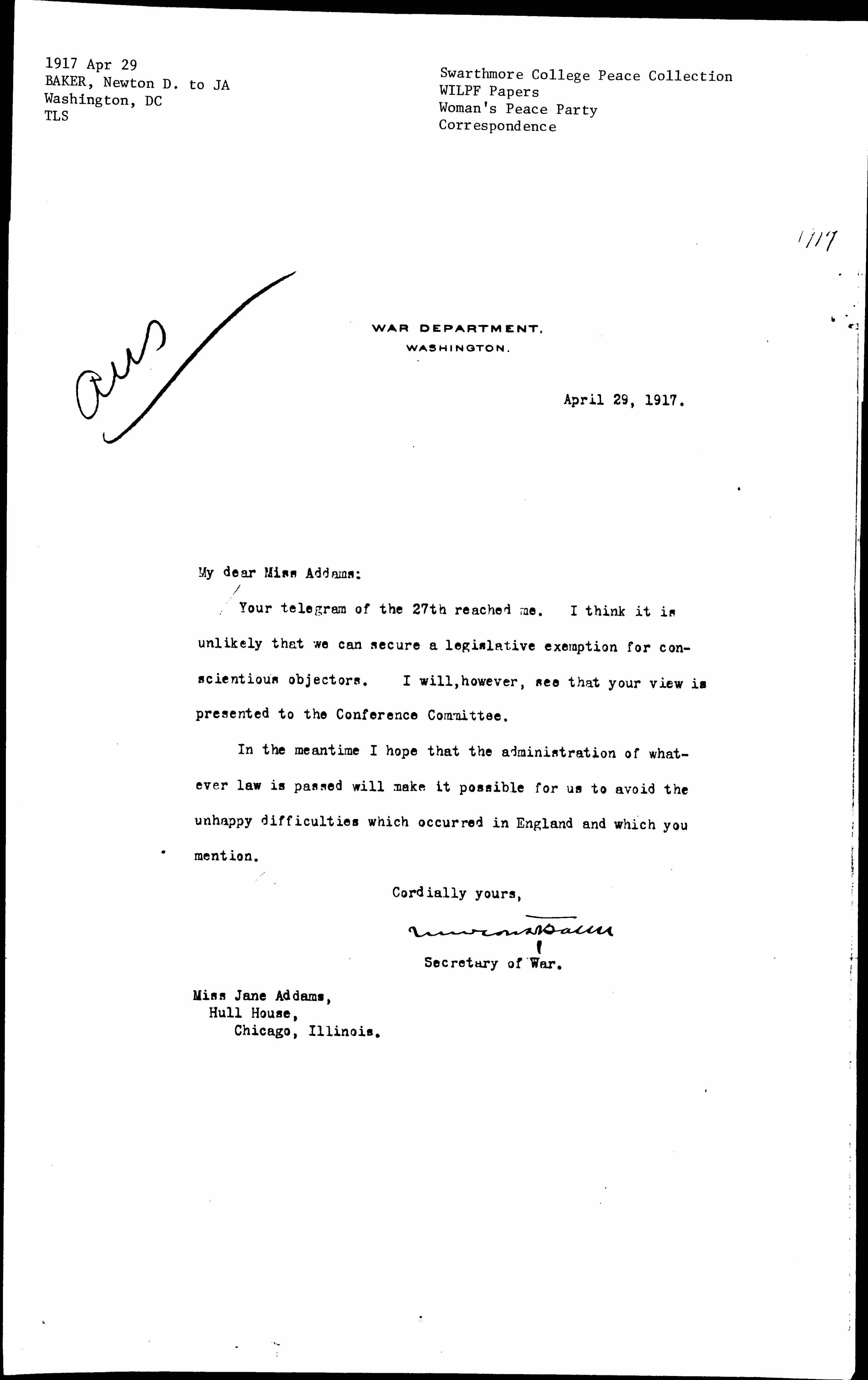 Your telegram of the 27th reached me. I think it is unlikely that we can secure a legislative exemption for conscientious objectors. I will, however, see that your view is presented to the Conference Committee.