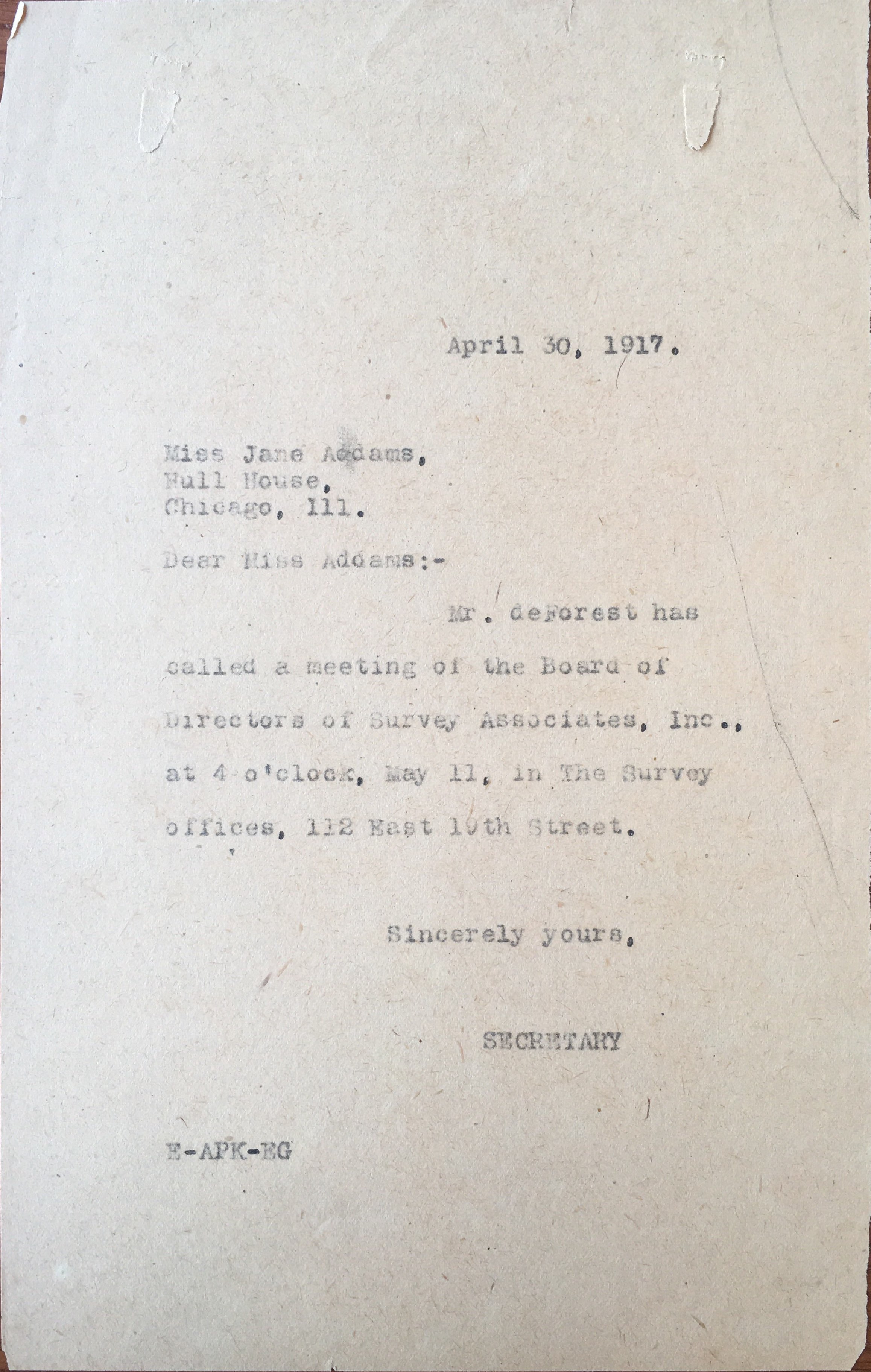 Mr. DeForest has called a meeting of the Board of Directors of Survey Associates, Inc., at 4 o'clock, May 11, in The Survey offices, 112 East 19th Street.