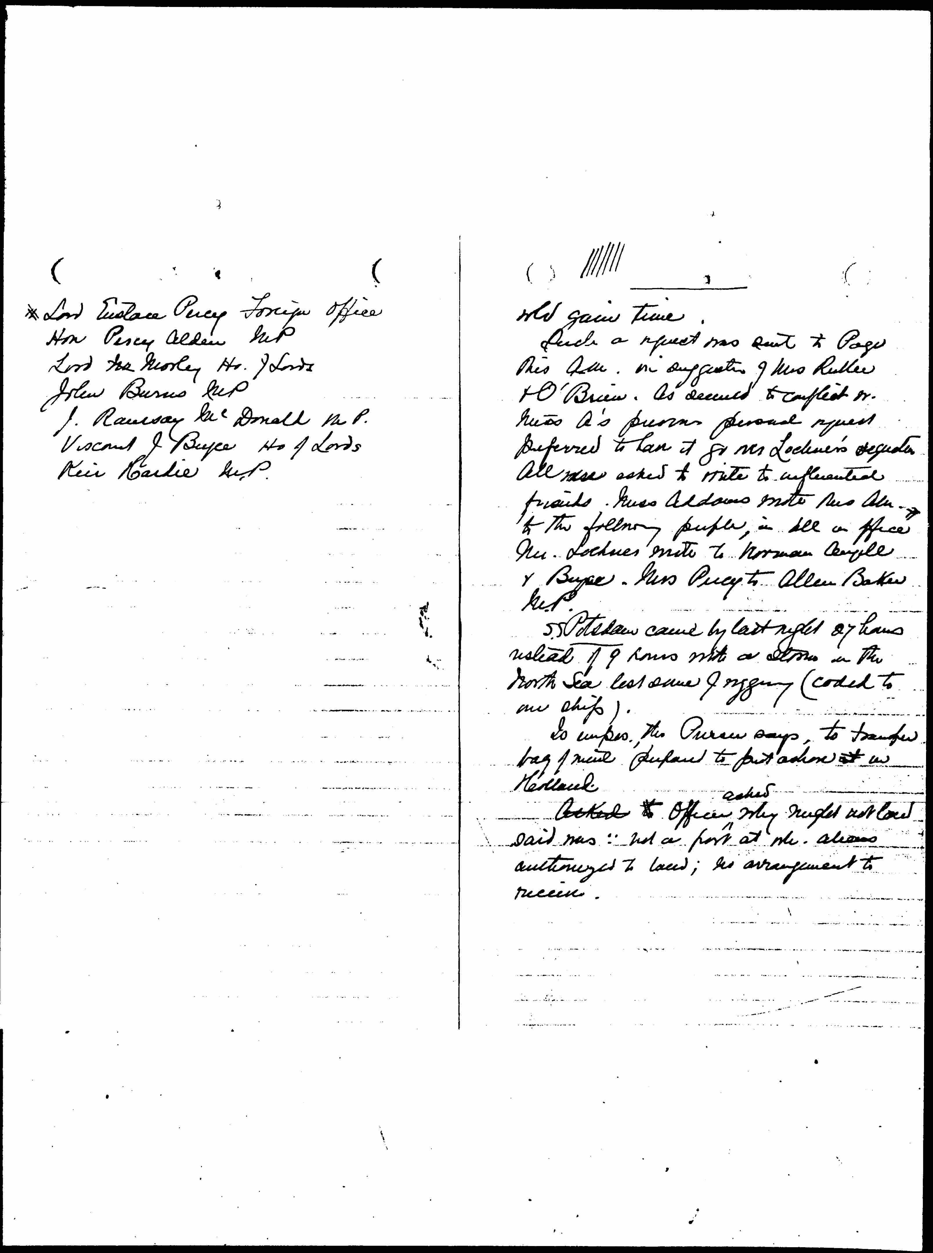 Such a request was sent to Page this AM. on suggestion of Mrs Rublee & O'Brien. As seemed to conflict w. Miss A's previous personal request preferred to have it go over Mr Lochner's signature. All were asked to write to influential friends. Miss Addams wrote [this] AM. to the following people,