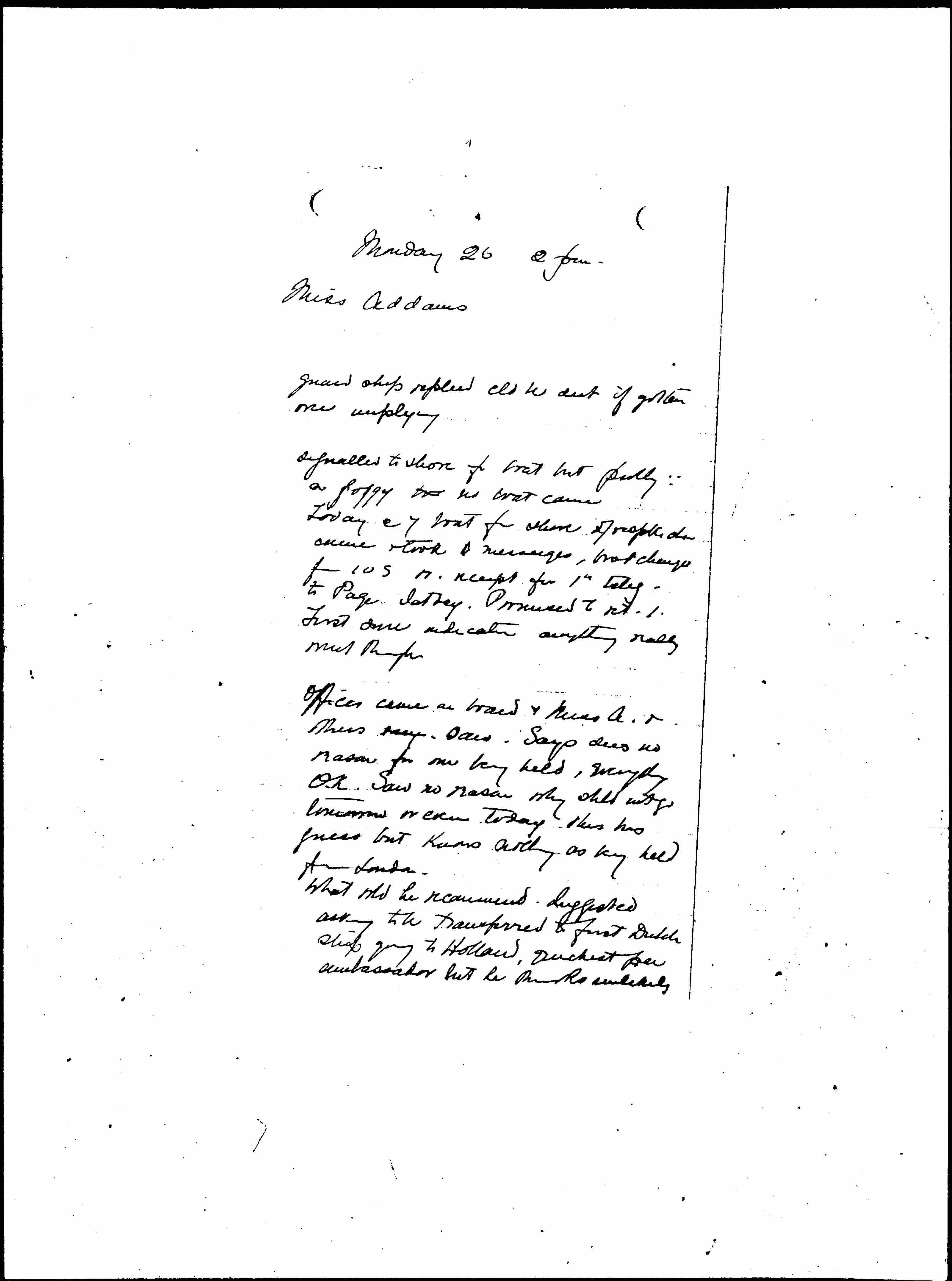Officer came on board & Miss A. & Miss [illegible] [said?] -- Says sees no reason for our being held, everything O.K. Saw no reason why shld not go tomorrow or even today this his guess but knows nothing as why held from London.
