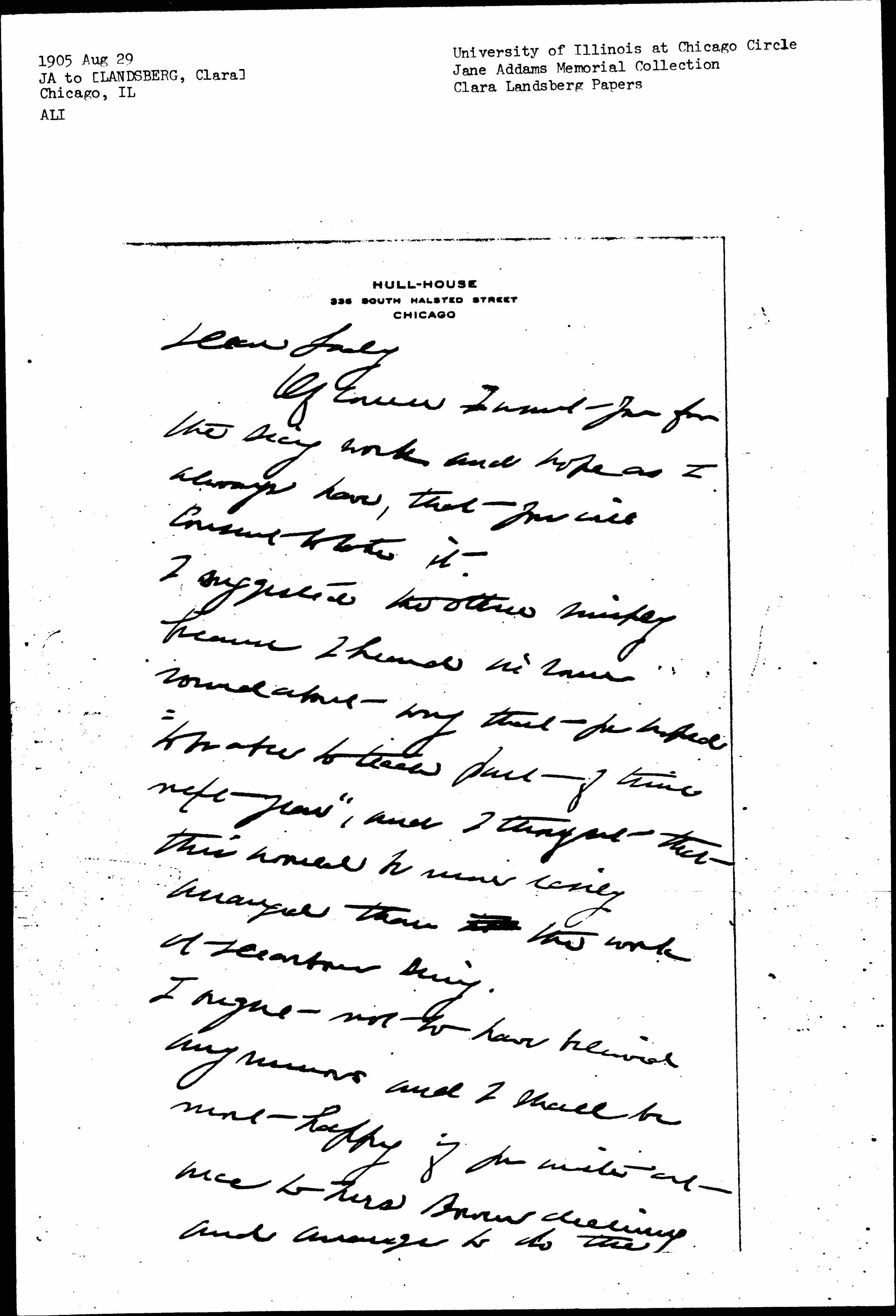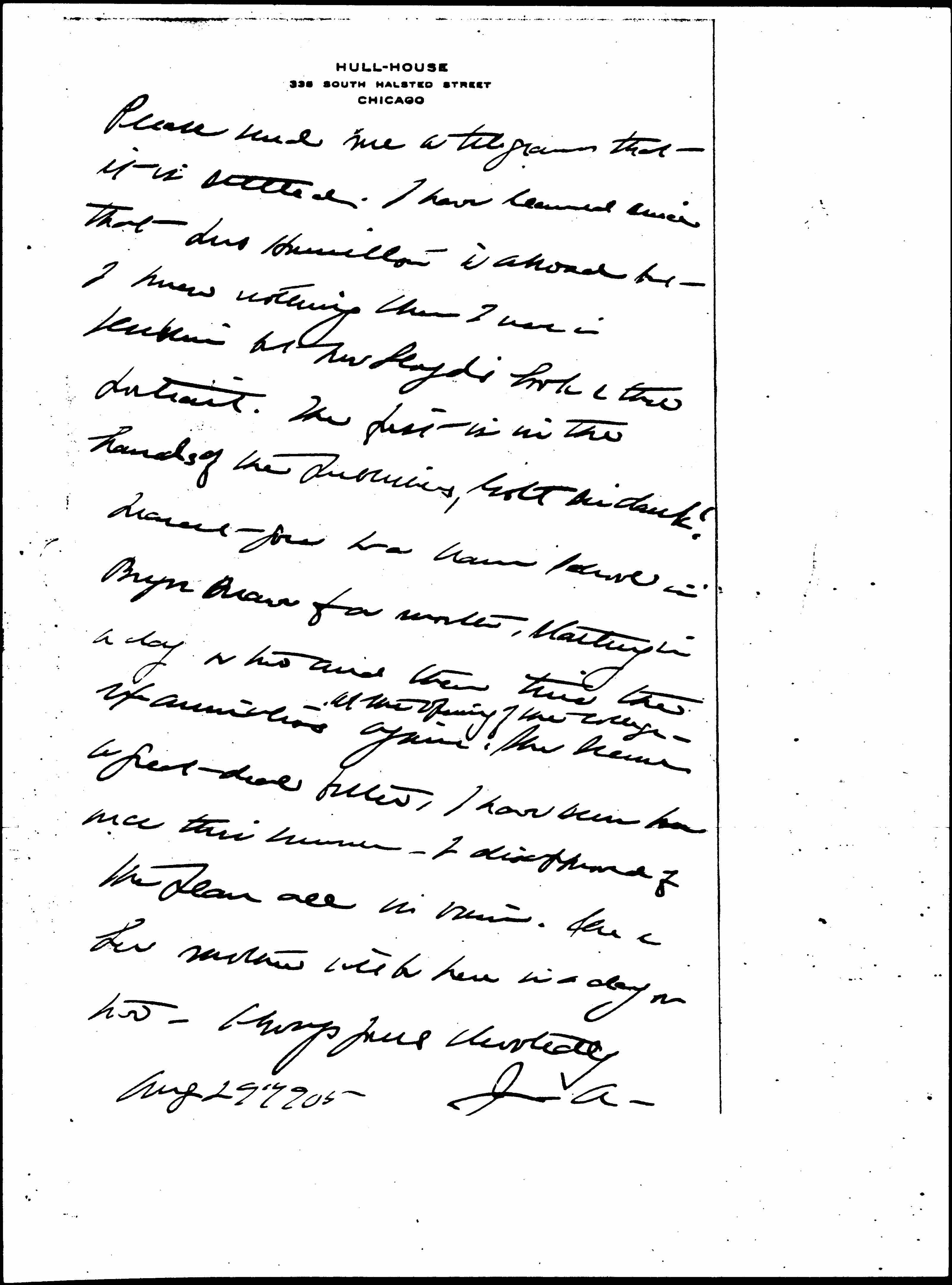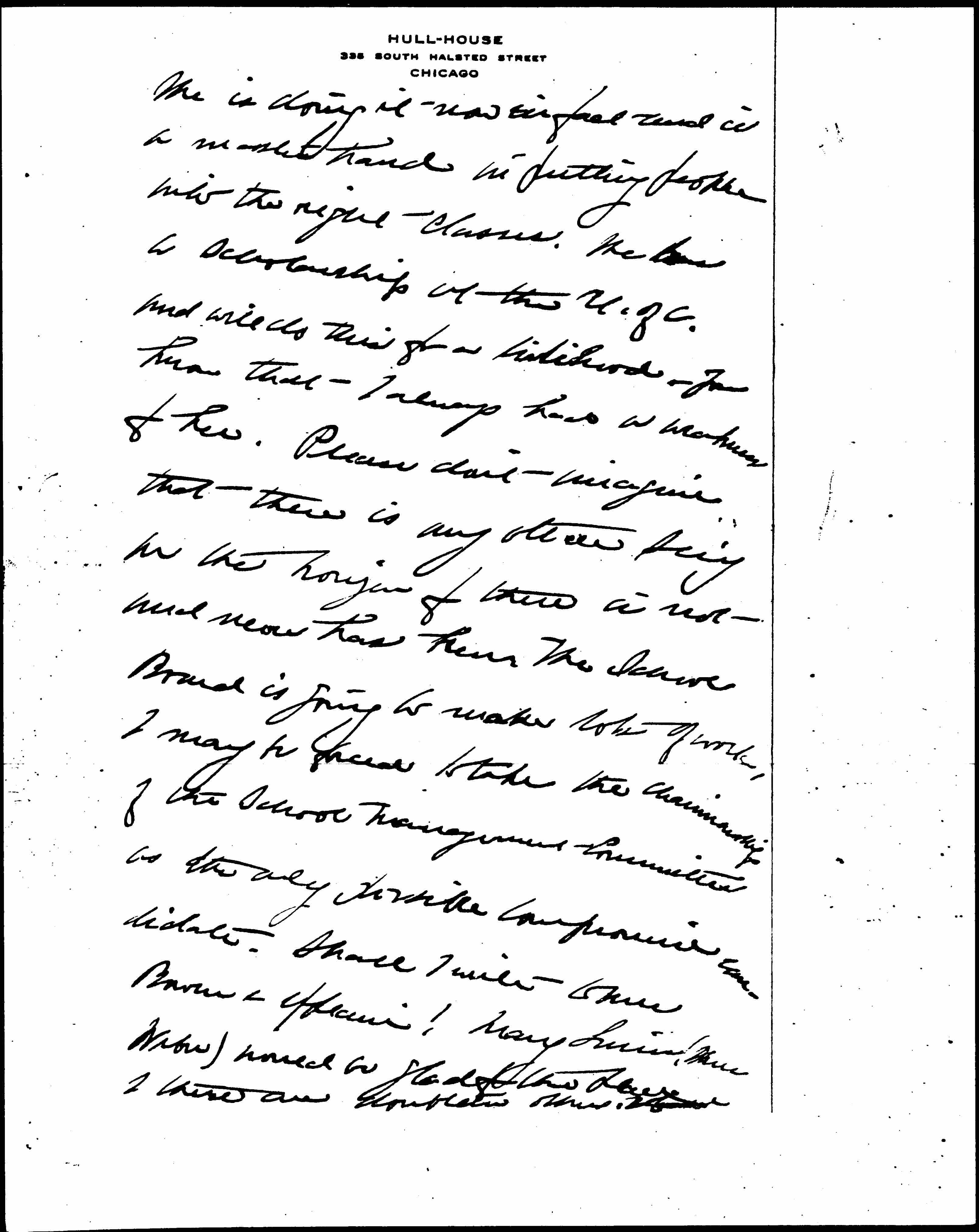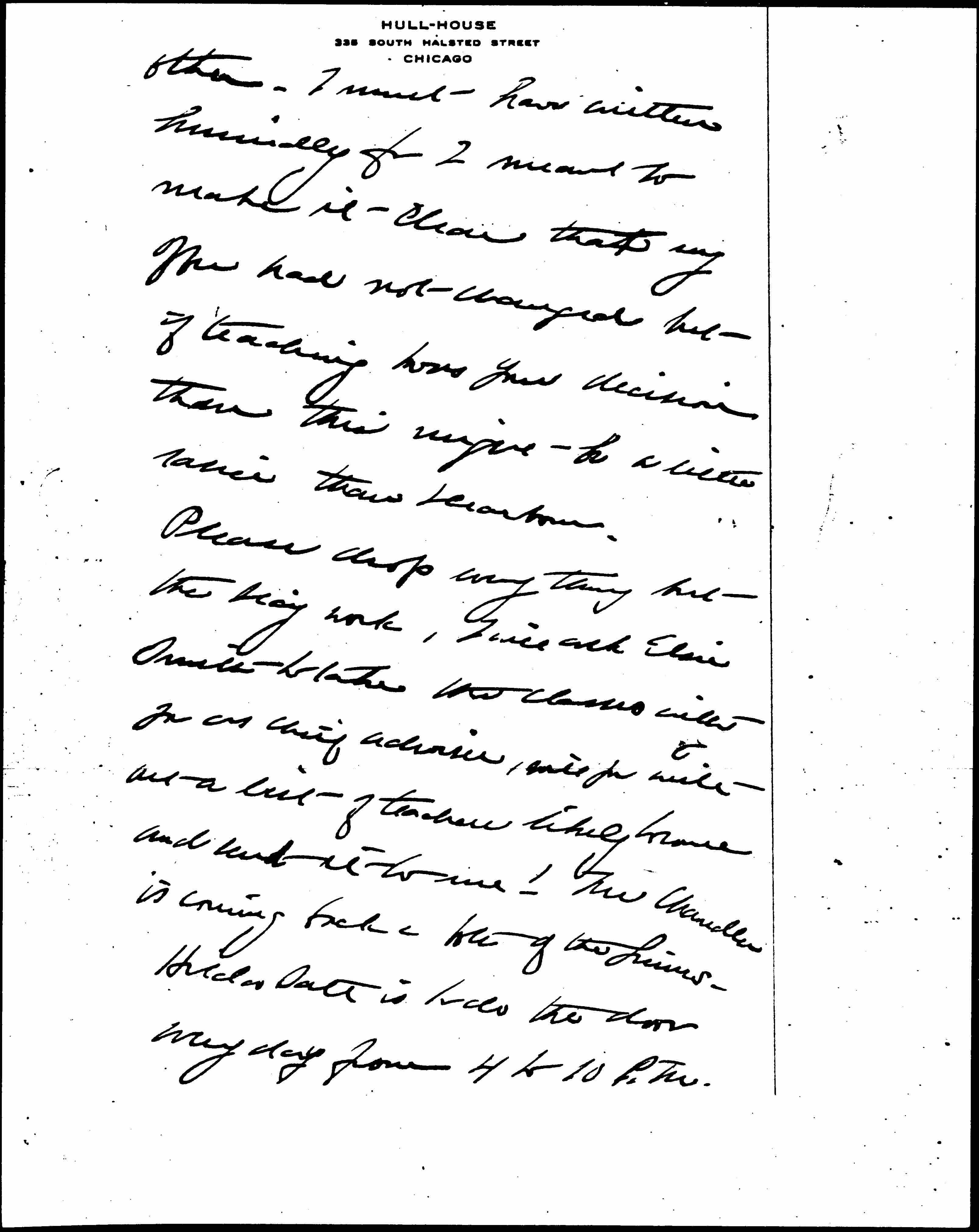 Hilda Satt is to do the door every day from 4 to 10 P.M. [page 3] She is doing it now in fact and is a master hand in putting people into the right classes. She has a scholarship at the U. of C. and will do this for a livelihood. You know that I always had a weakness for her. Please don't imagine that there is any other Sec'y on the horizon for there is not and never has been. The School Board is going to make lots of work, I may be forced to take the chairmanship of the School Management Committee as the only possible compromise candidate. Shall I write to Mrs Bowen & explain? Mary Linn (Mrs Weber) would be glad for the place & there are doubtless others. [illegible] [page 4]