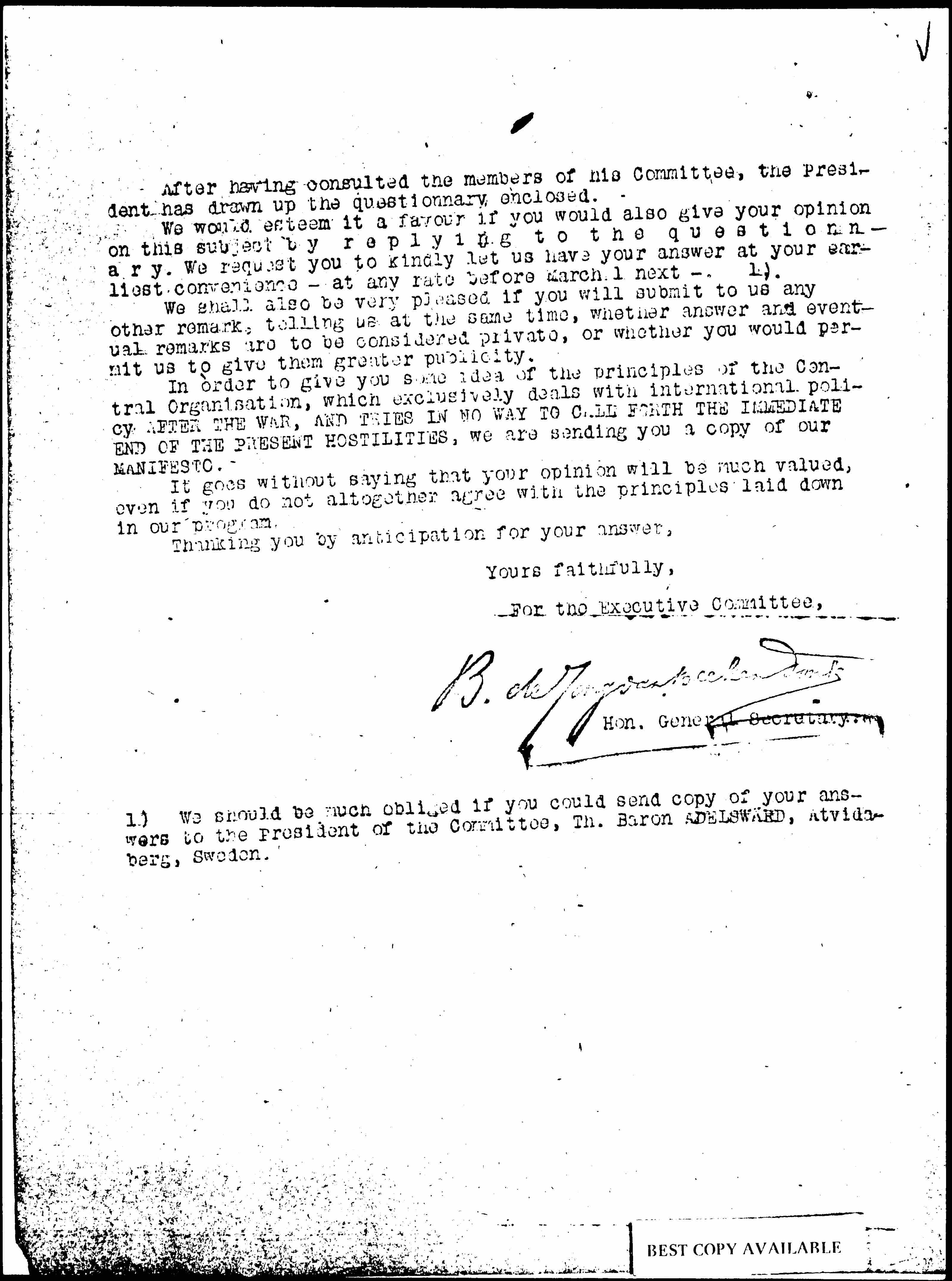 1) We should be much obliged if you could send copy of your answers to the President of the Committee, Th. Baron ADELSWÄRD, Åtvidaberg, Sweden.