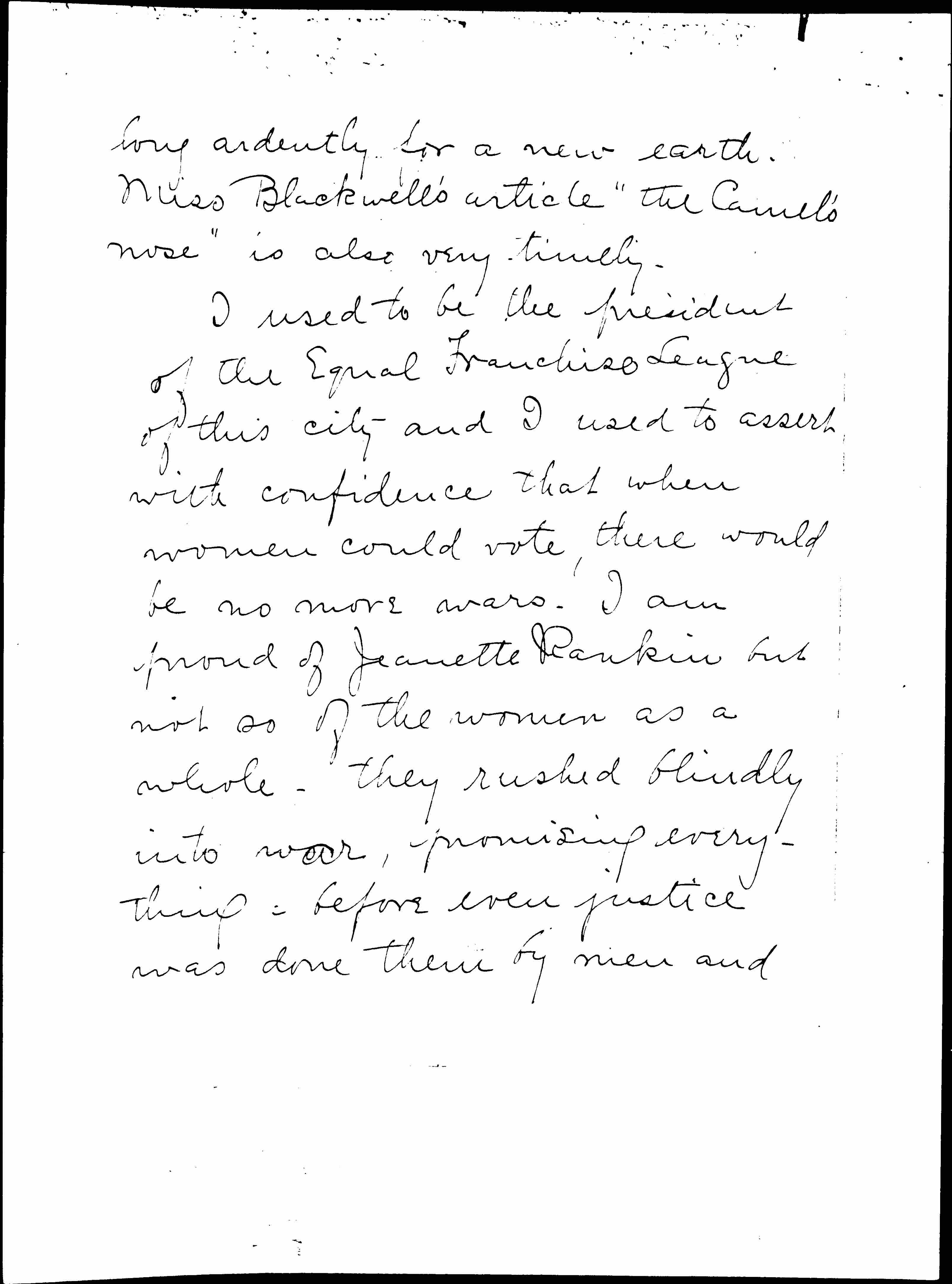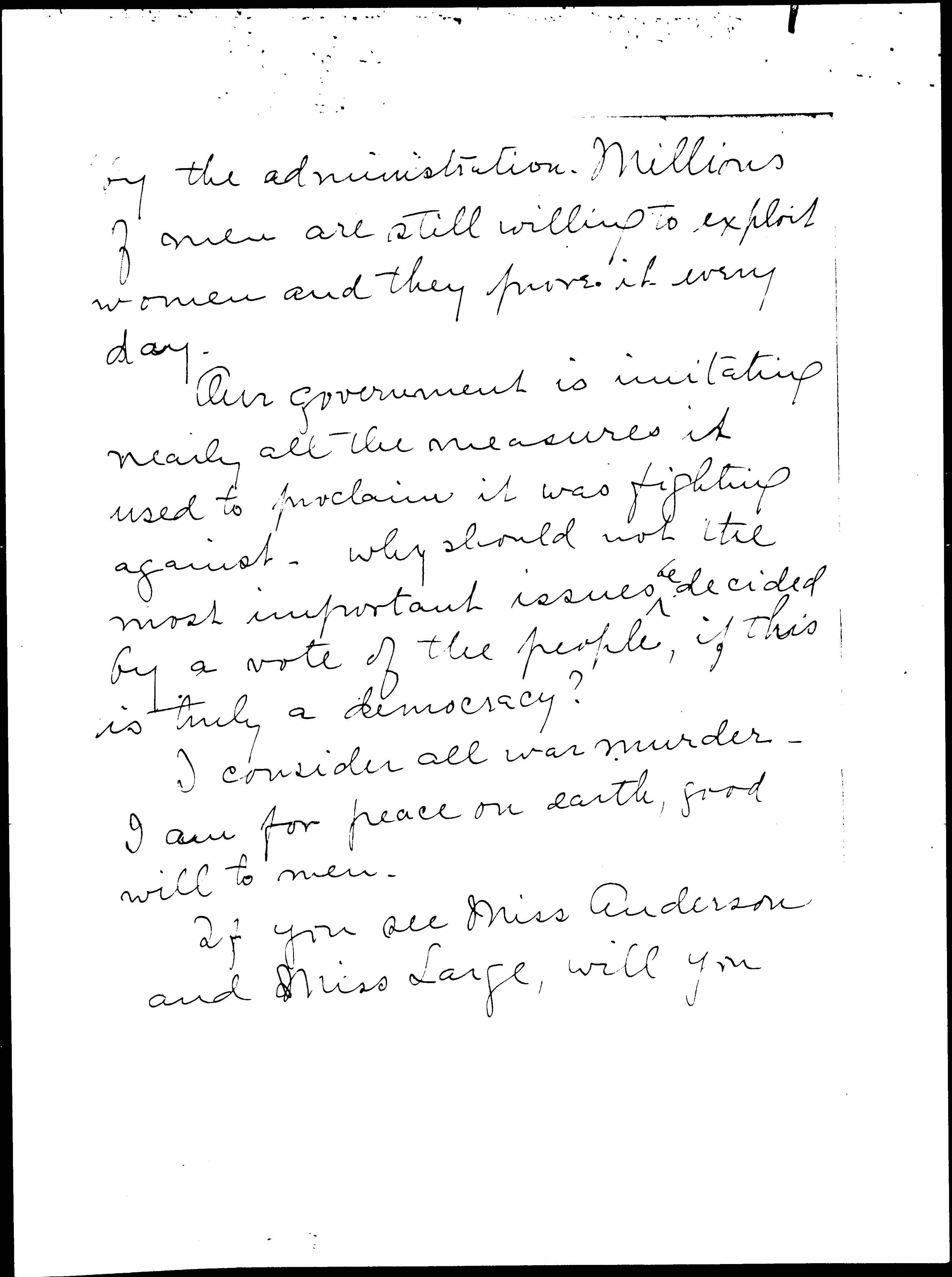 I used to be the president of the Equal Franchise League of this city and I used to assert with confidence that when women could vote, there would be no more wars. I am proud of Jeanette Rankin but not so of the women as a whole -- they rushed blindly into war, promising everything -- before even justice was done them by men and [page 3] by the administration. Millions of men are still willing to exploit women and they prove it every day.