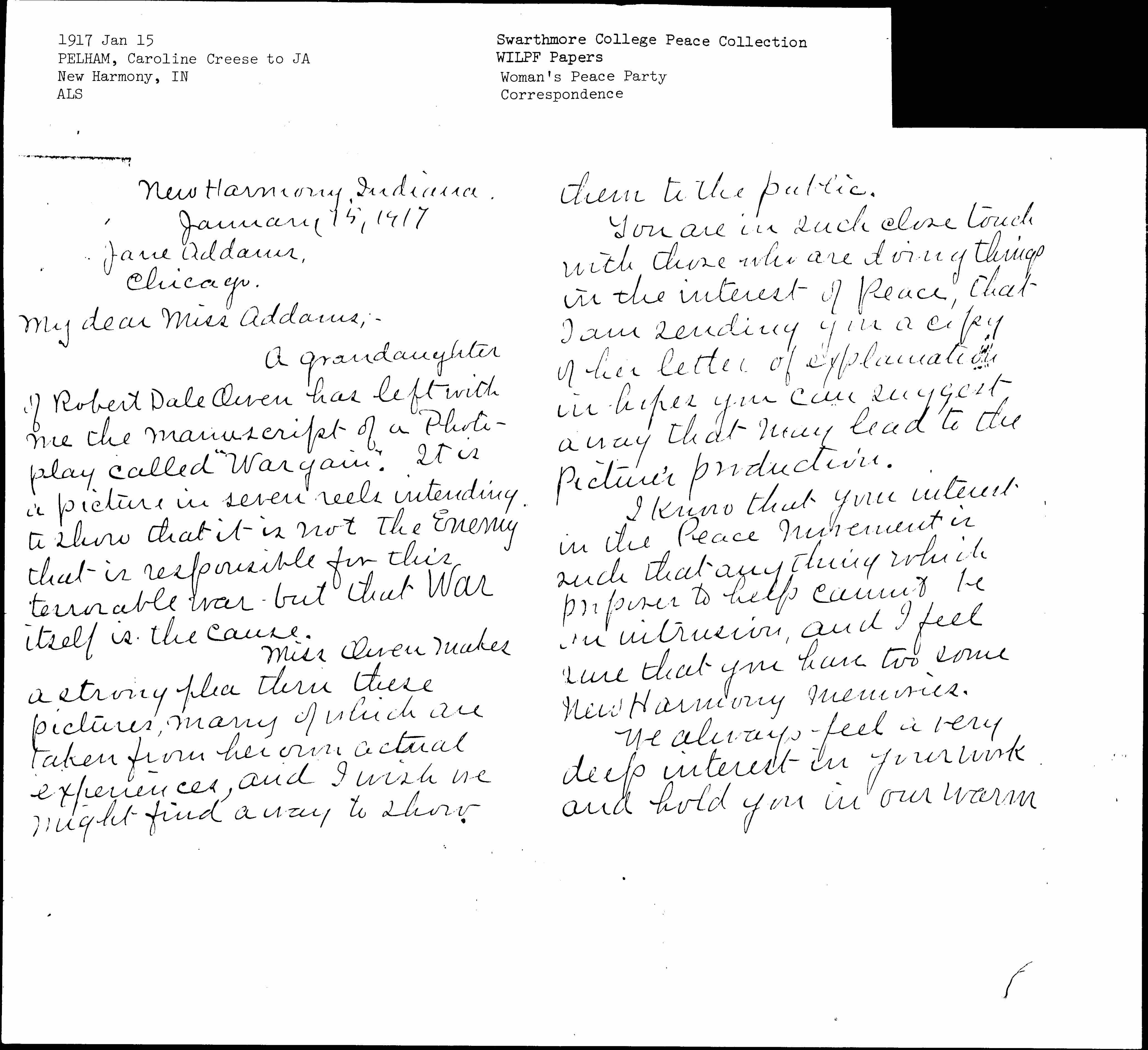 A [granddaughter] of Robert Dale Owen has left with me the manuscript of a Photoplay called "Wargain". It is a picture in seven reels intending to show that it is not the Enemy that is responsible for this [terrible] war -- but that War itself is the cause.