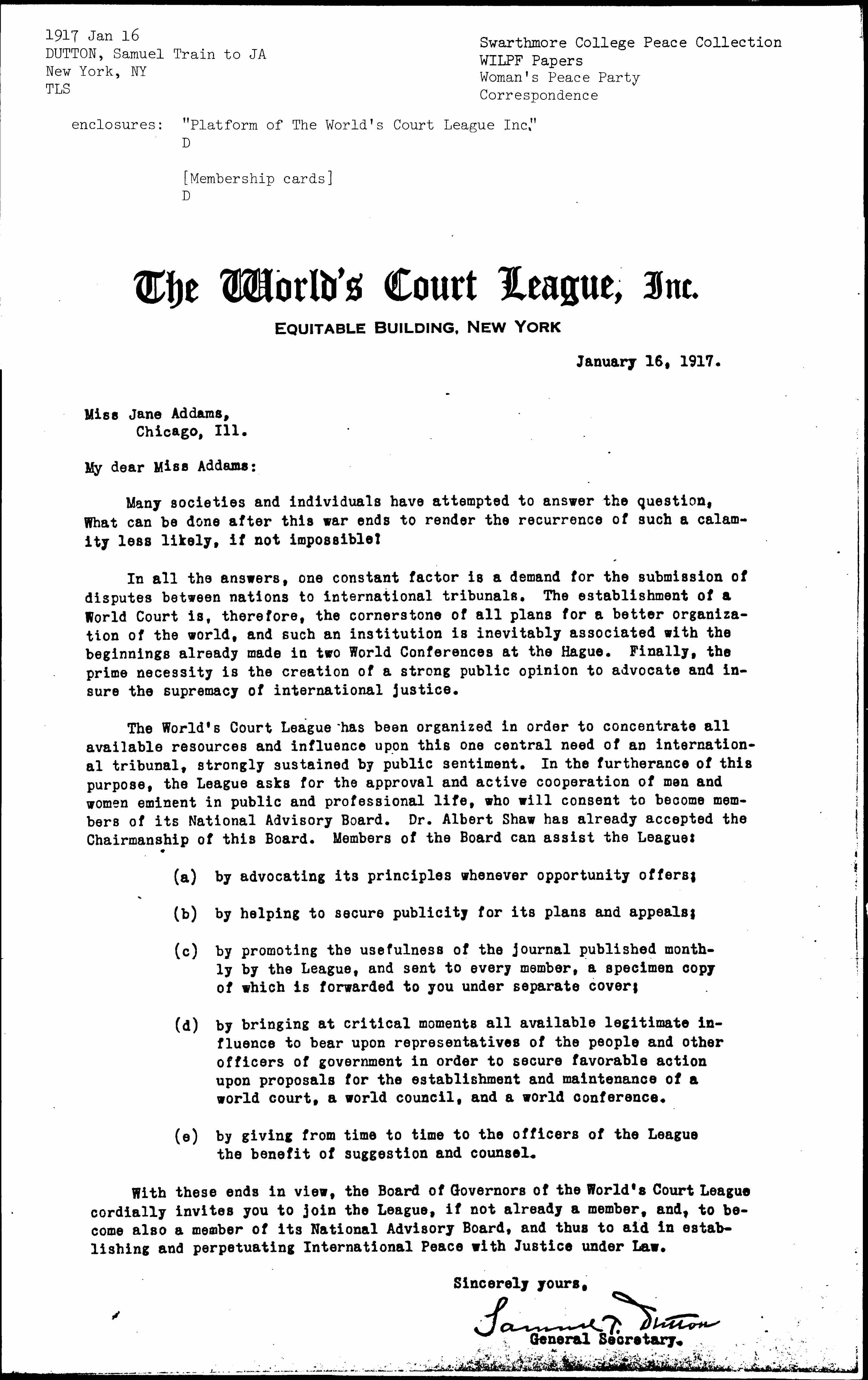 With these ends in view, the Board of Governors of the World's Court League cordially invites you to join the League, if not already a member, and, to become also a member of its National Advisory Board, and thus to aid in establishing and perpetuating International Peace with Justice under Law.