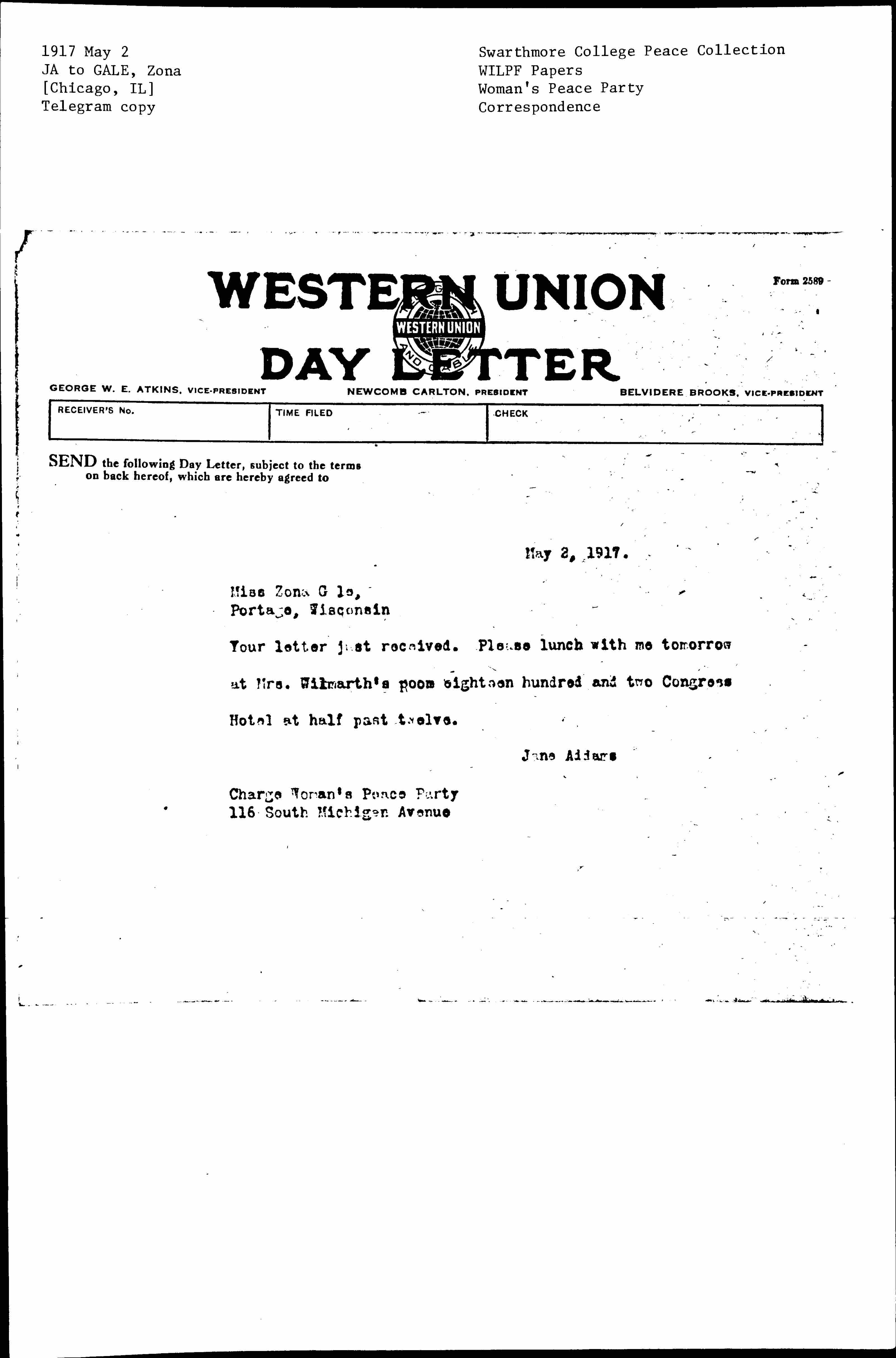 Your letter just received. Please lunch with me tomorrow at Mrs. Wilmarth's room eighteen hundred and two Congress Hotel at half past twelve.