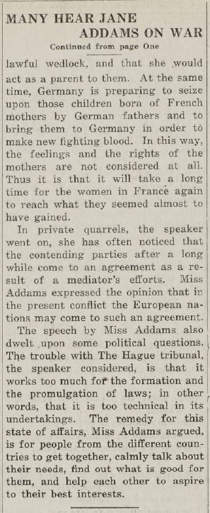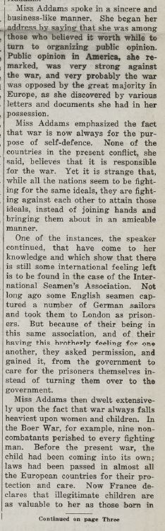 Miss Addams then dwelt extensively upon the fact that war always falls heaviest upon women and children. In the Boer War, for example, nine non-combatants perished to every fighting man. Before the present war, the child had been coming into its own; laws had been passed in almost all the European countries for their protection and care. Now France declares that illegitimate children are as valuable to her as those born in [page 3] lawful wedlock, and that she would act as a parent to them. At the same time, Germany is preparing to seize upon those children born of French mothers by German fathers and to bring them to Germany in order to make new fighting blood. In this way, the feelings and the rights of the mothers are not considered at all. Thus it is that it will take a long time for the women in France again to reach what they seemed almost to have gained.