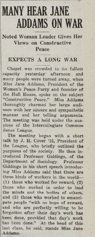 Chapel was crowded to its fullest capacity yesterday afternoon and many people were turned away, when Miss Jane Addams, President of the [Woman's] Peace Party and founder of the Hull House, spoke on the subject "Constructive Peace." Miss Addams thoroughly charmed her large audience with her sincere and sympathetic manner and her telling arguments. The meeting was held under the auspices of the Intercollegiate Common Sense League.
