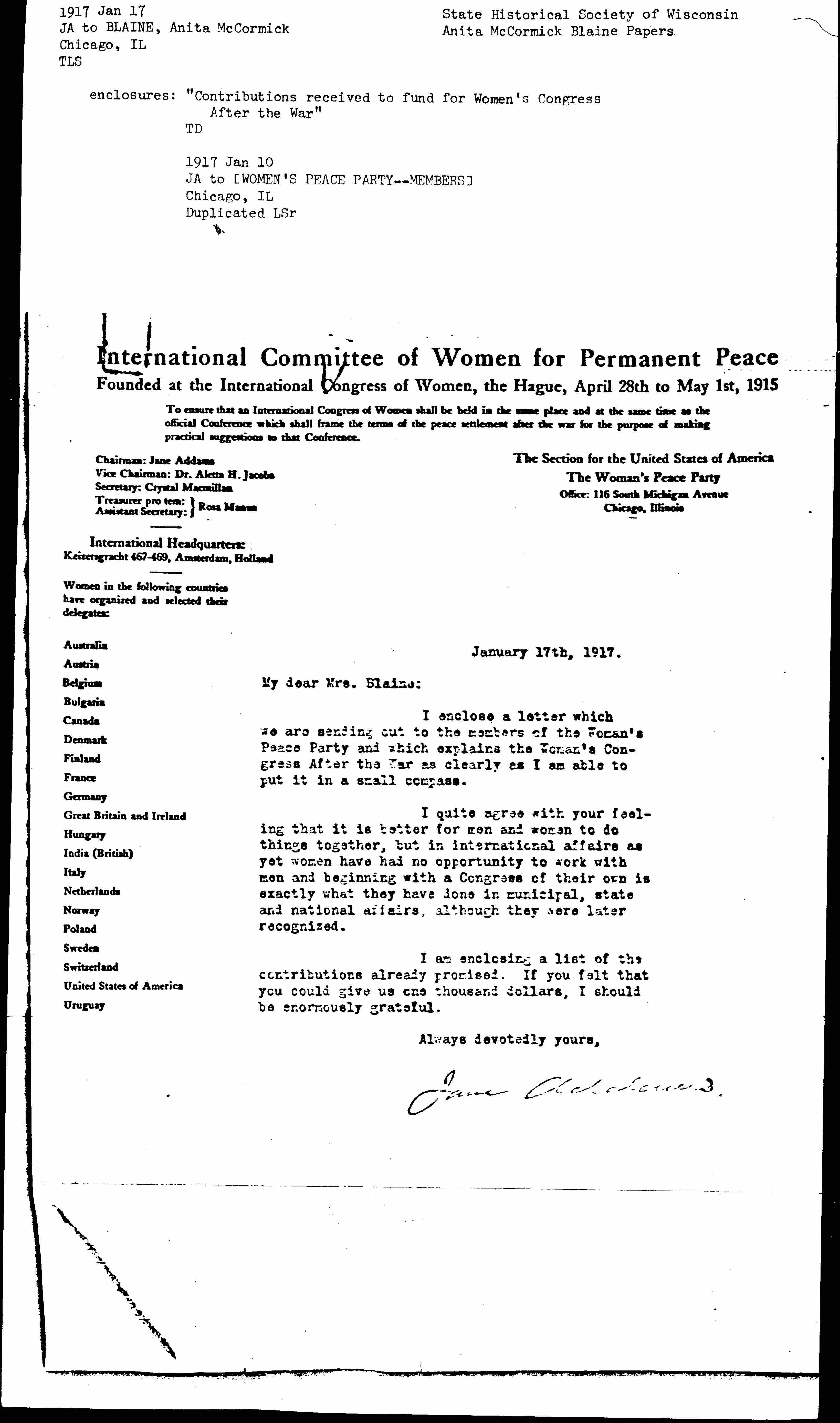 I enclose a letter which we are sending out to the members of the Woman's Peace Party and which explains the Woman's Congress After the War as clearly as I am able to put it in a small compass.