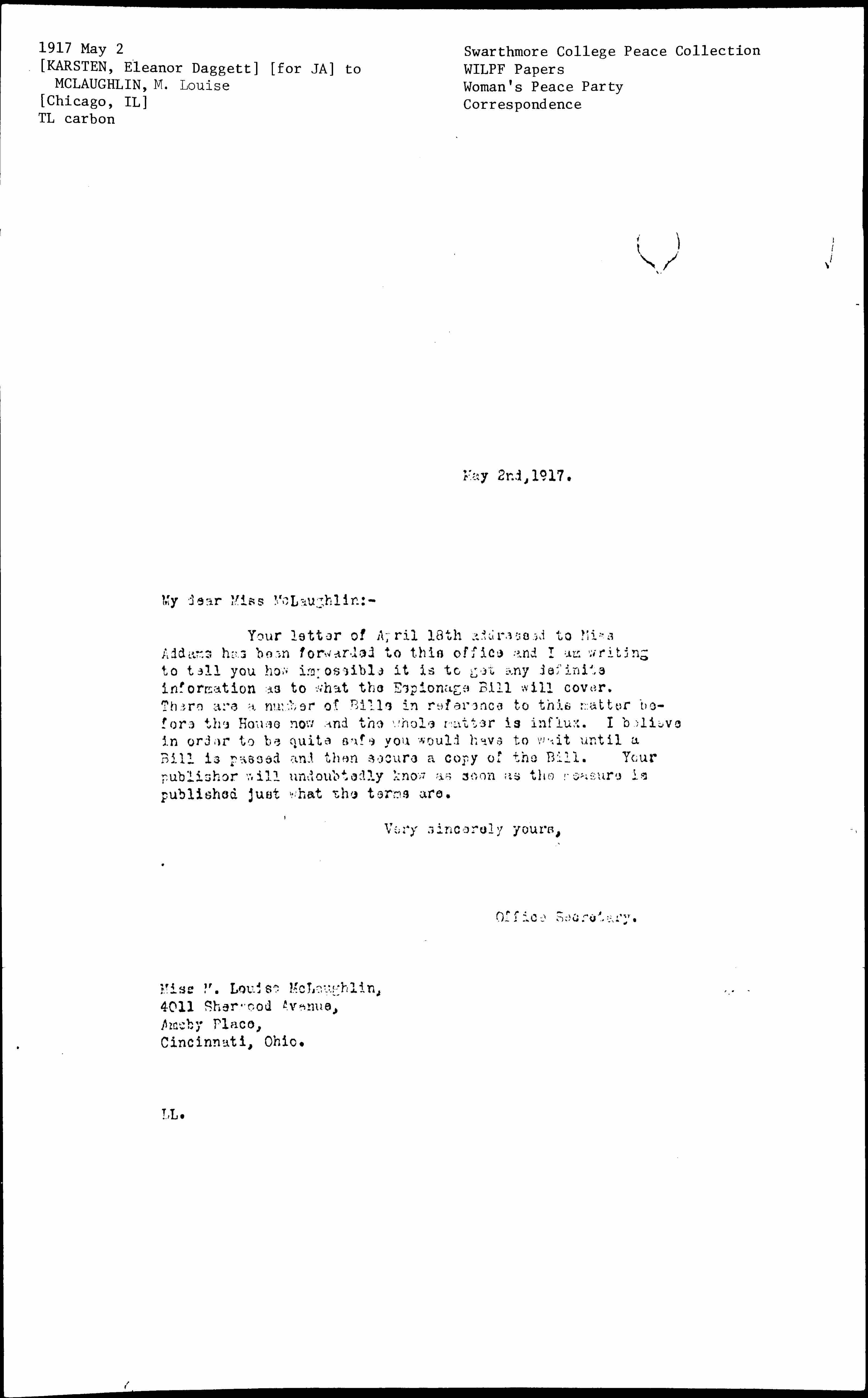 Your letter of April 18th addressed to Miss Addams has been forwarded to this office and I am writing to tell you how impossible it is to get any definite information as to what the Espionage Bill will cover. There are a number of Bills in reference to this matter before the House now and the whole matter is [in flux]. I believe in order to be quite safe you would have to wait until a Bill is passed and then secure a copy of the Bill. Your publisher will undoubtedly know as soon as the measure is published just what the terms are.