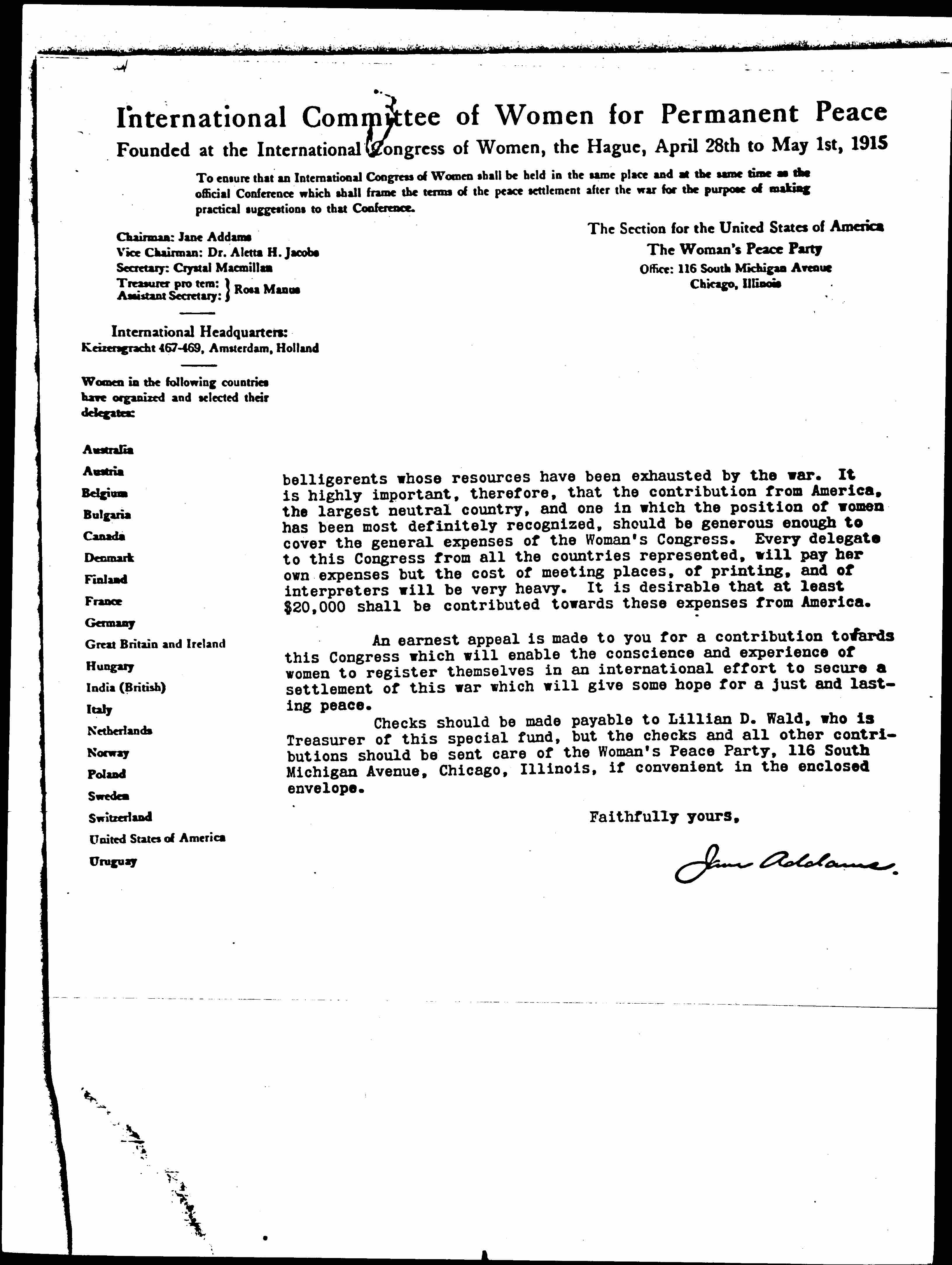Checks should be made payable to Lillian D. Wald, who is Treasurer of this special fund, but the checks and all other contributions should be sent care of the Woman's Peace Party, 116 South Michigan Avenue, Chicago, Illinois, if convenient in the enclosed envelope.