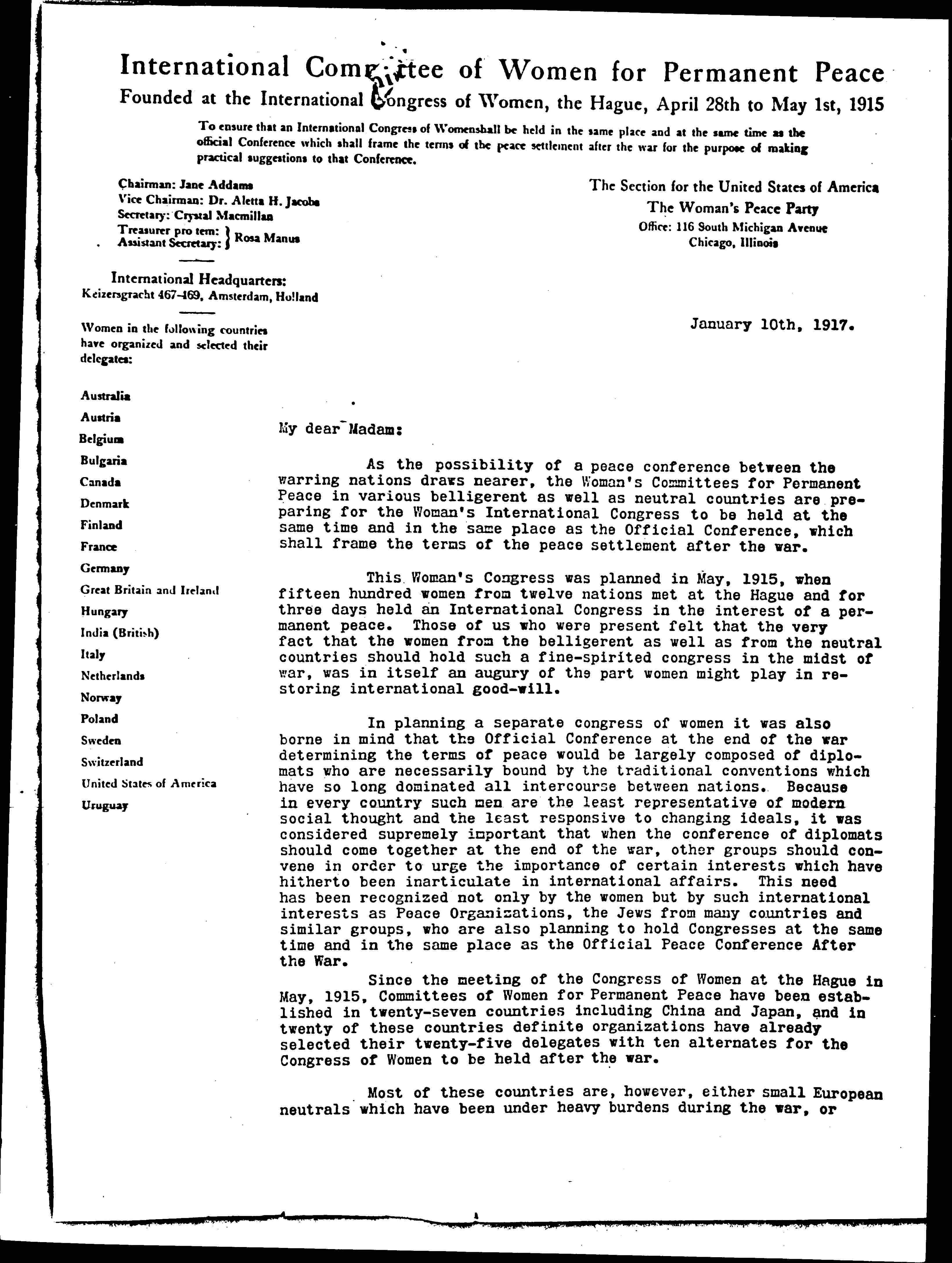 Since the meeting of the Congress of Women at The Hague in May, 1915, Committees of Women for Permanent Peace have been established in twenty-seven countries including China and Japan, and in twenty of these countries definite organizations have already selected their twenty-five delegates with ten alternates for the Congress of Women to be held after the war.