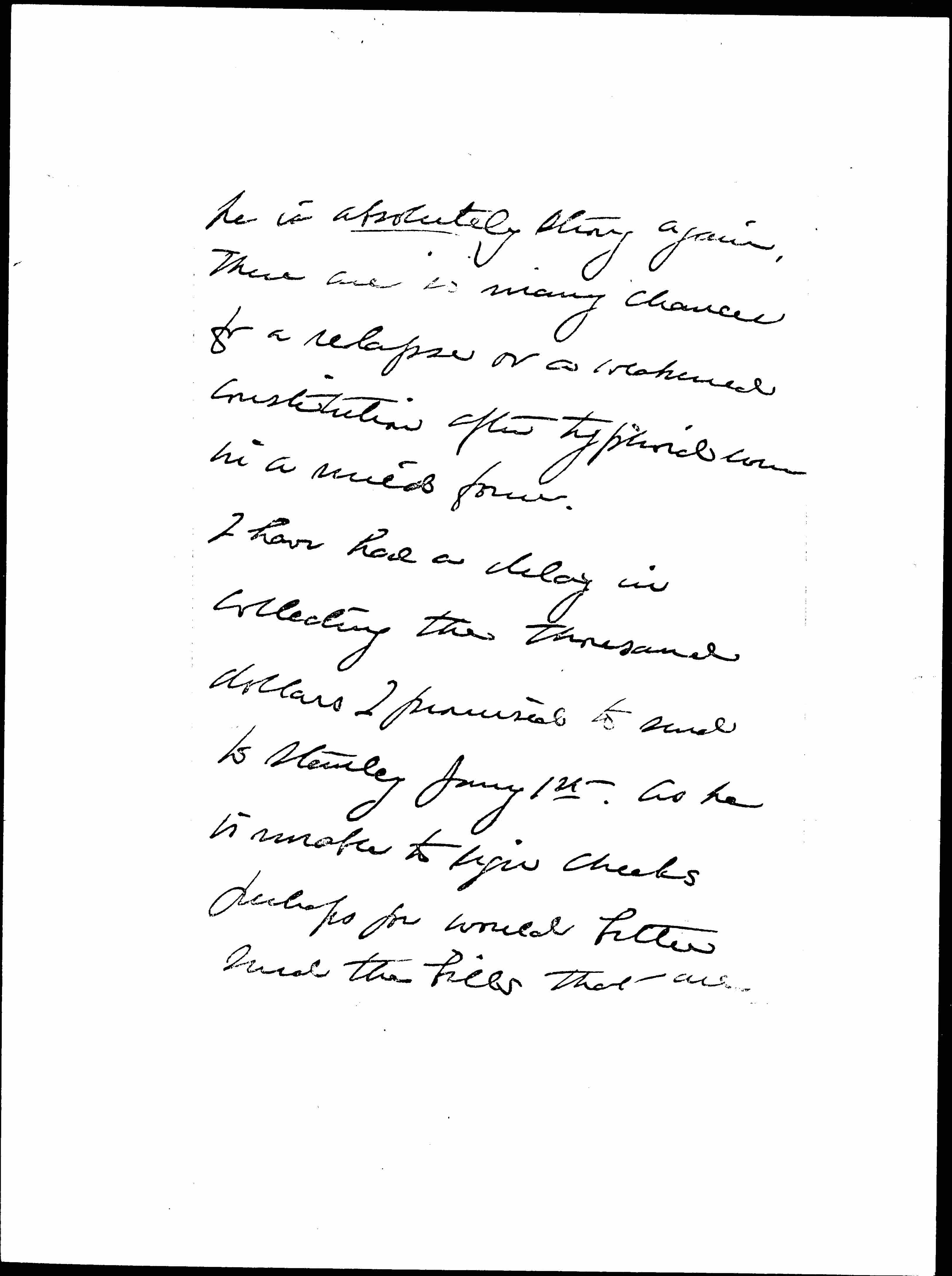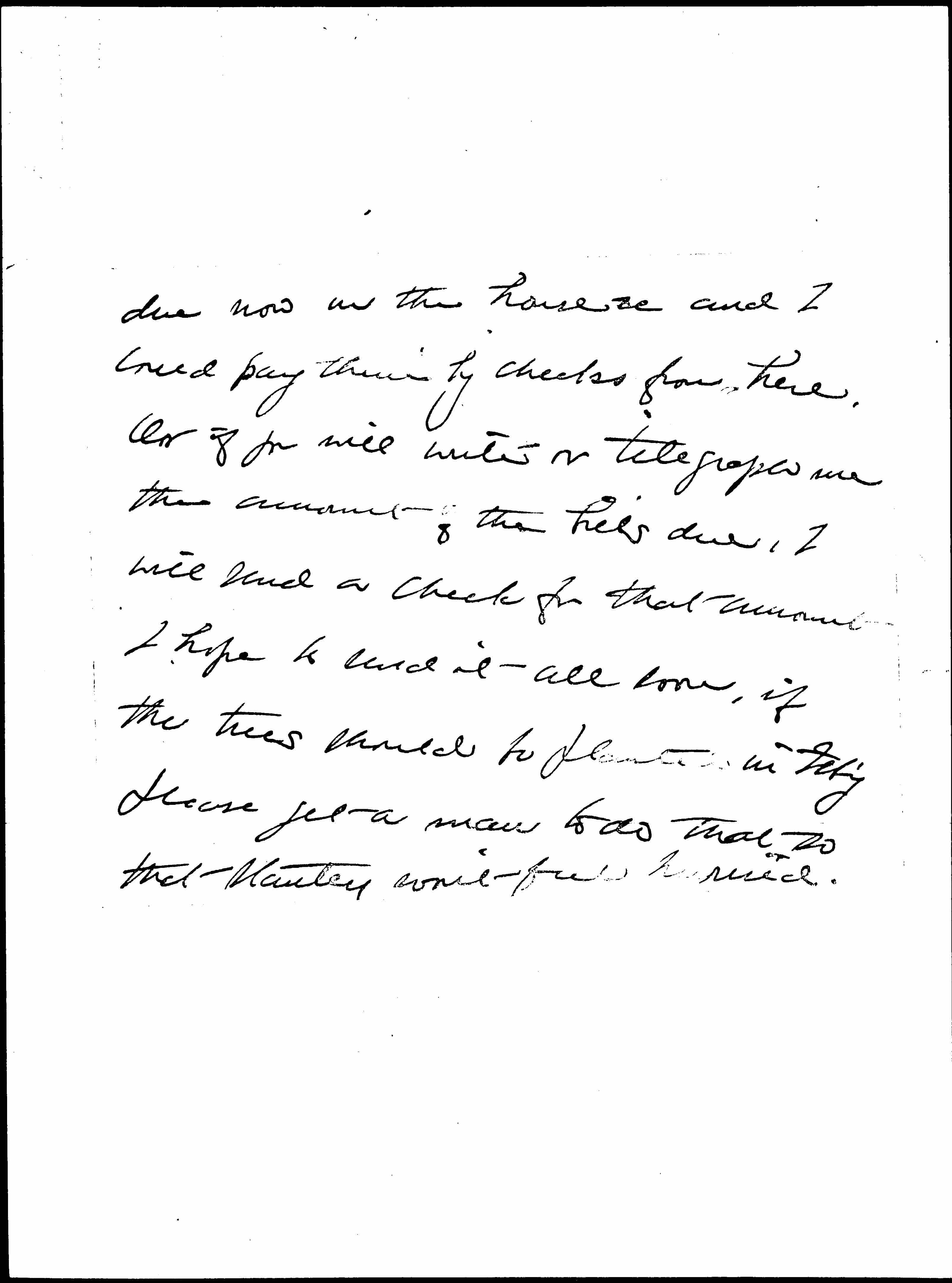 I have had a delay in collecting the thousand dollars I promised to send to Stanley Jany 1st. As he is unable to sign checks perhaps you would better send the bills that are [page 3] due now on the house [etc] and I could pay them by checks from here. Or if you will write or telegraph me the amount of the bills due, I will send a check for that amount. I hope to send it all soon, if the trees should be planted in Feb'y please get a man to do that so that Stanley won't feel hurried. [page 4]