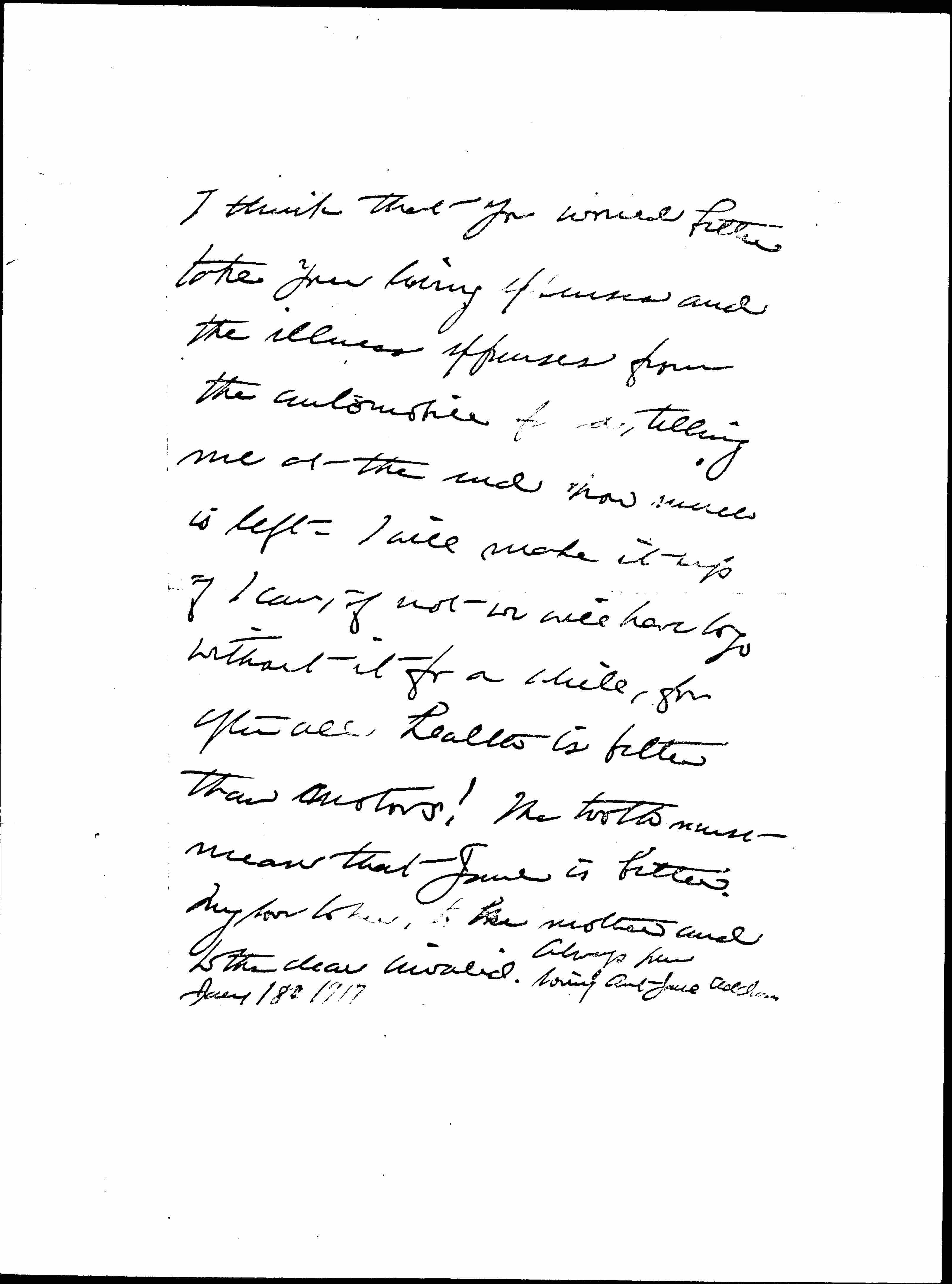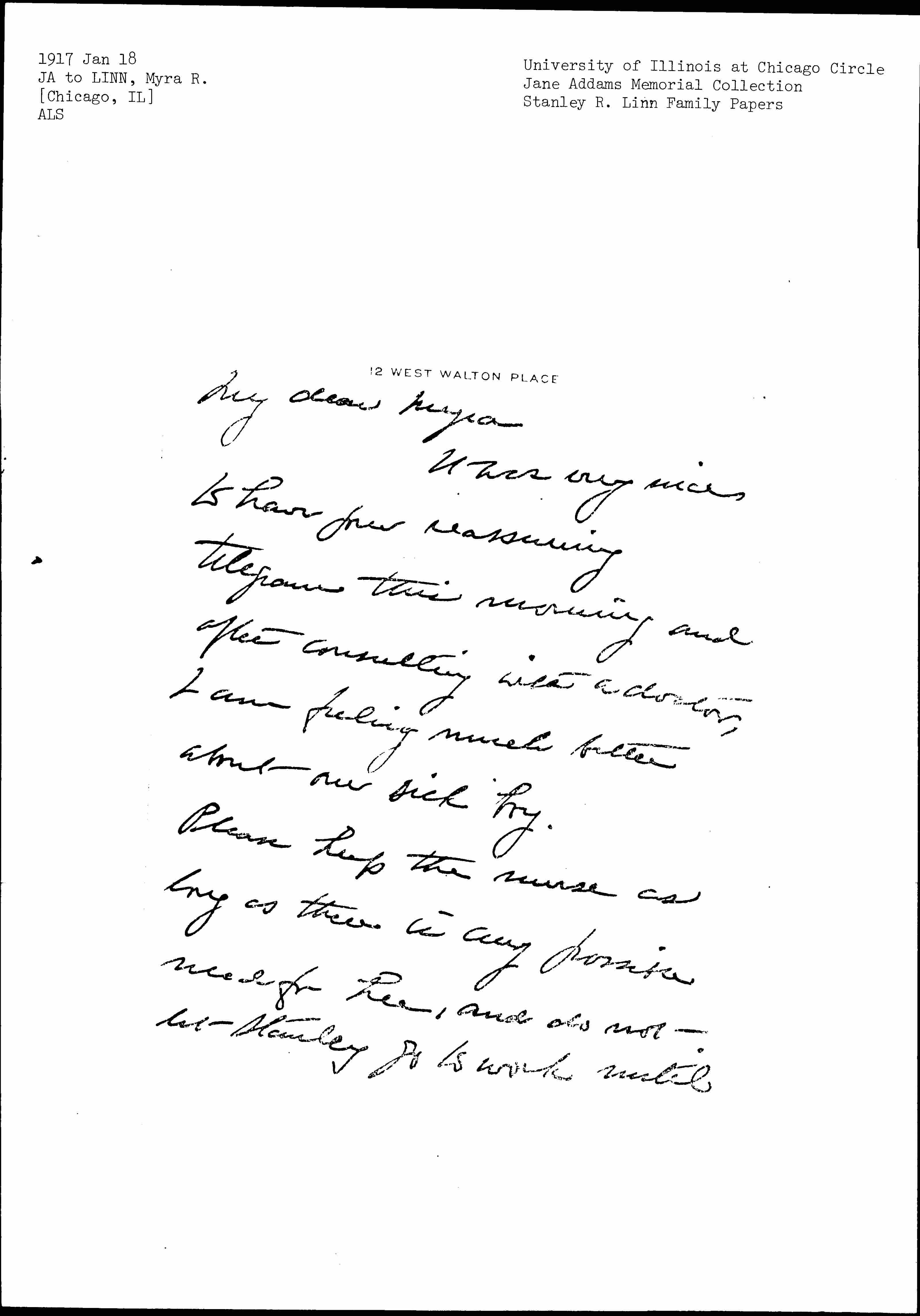 I think that you would better take your living expenses and the illness expenses from the automobile fund, telling me at the end how much is left -- I will make it up if I can, if not we will have to go without it for a while, for after all health is better than motors! The tooth must mean that Jane is better. My love to her, to her mother and to the dear invalid. <Always your> loving Aunt Jane Addams
