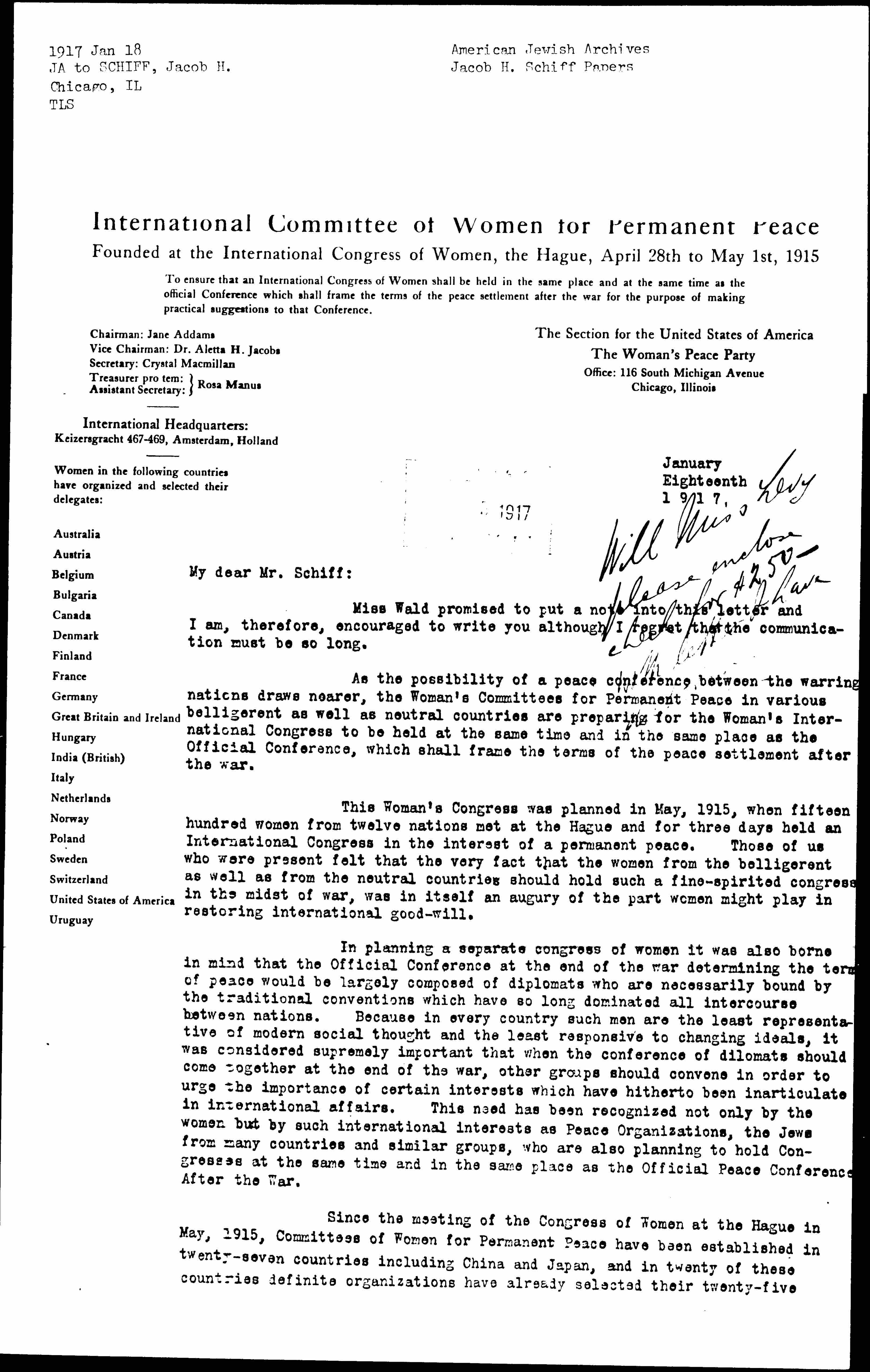 Since the meeting of the Congress of Women at The Hague in May, 1915, Committees of Women for Permanent Peace have been established in twenty-seven countries including China and Japan, and in twenty of these countries definite organizations have already selected their twenty-five [page 2] delegates with ten alternates for the Congress of Women to be held after the war.