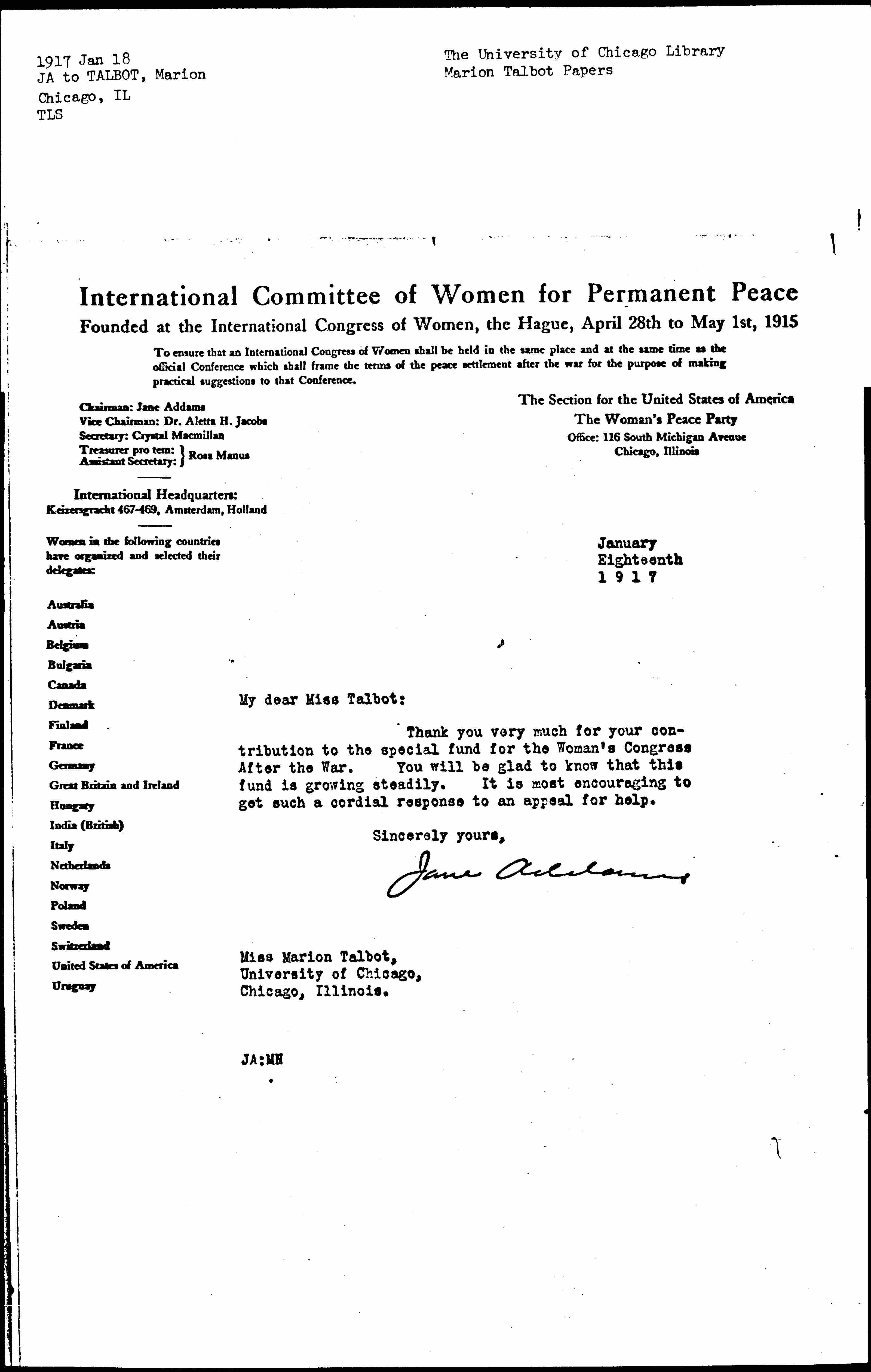 Thank you very much for your contribution to the special fund for the Woman's Congress After the War. You will be glad to know that this fund is growing steadily. It is most encouraging to get such a cordial response to an appeal for help.