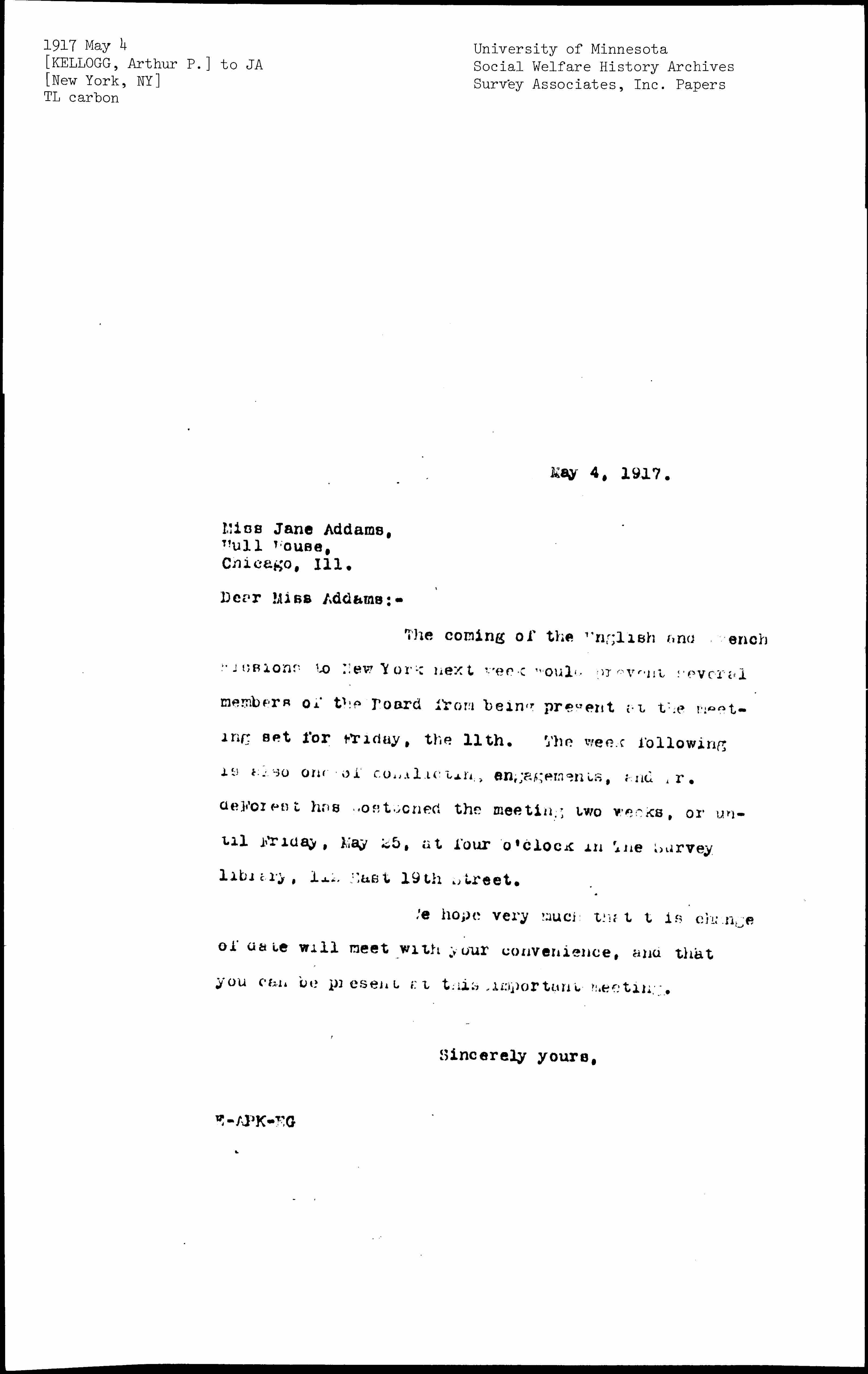 The coming of the English and French missions to New York next week would prevent several members of the Board from being present at the meeting set for Friday, the 11th. The week following is also one of conflicting engagements, and Mr. DeForest has postponed the meeting two weeks, or until Friday, May 25, at four o'clock in The Survey library, 112 East 19th Street.