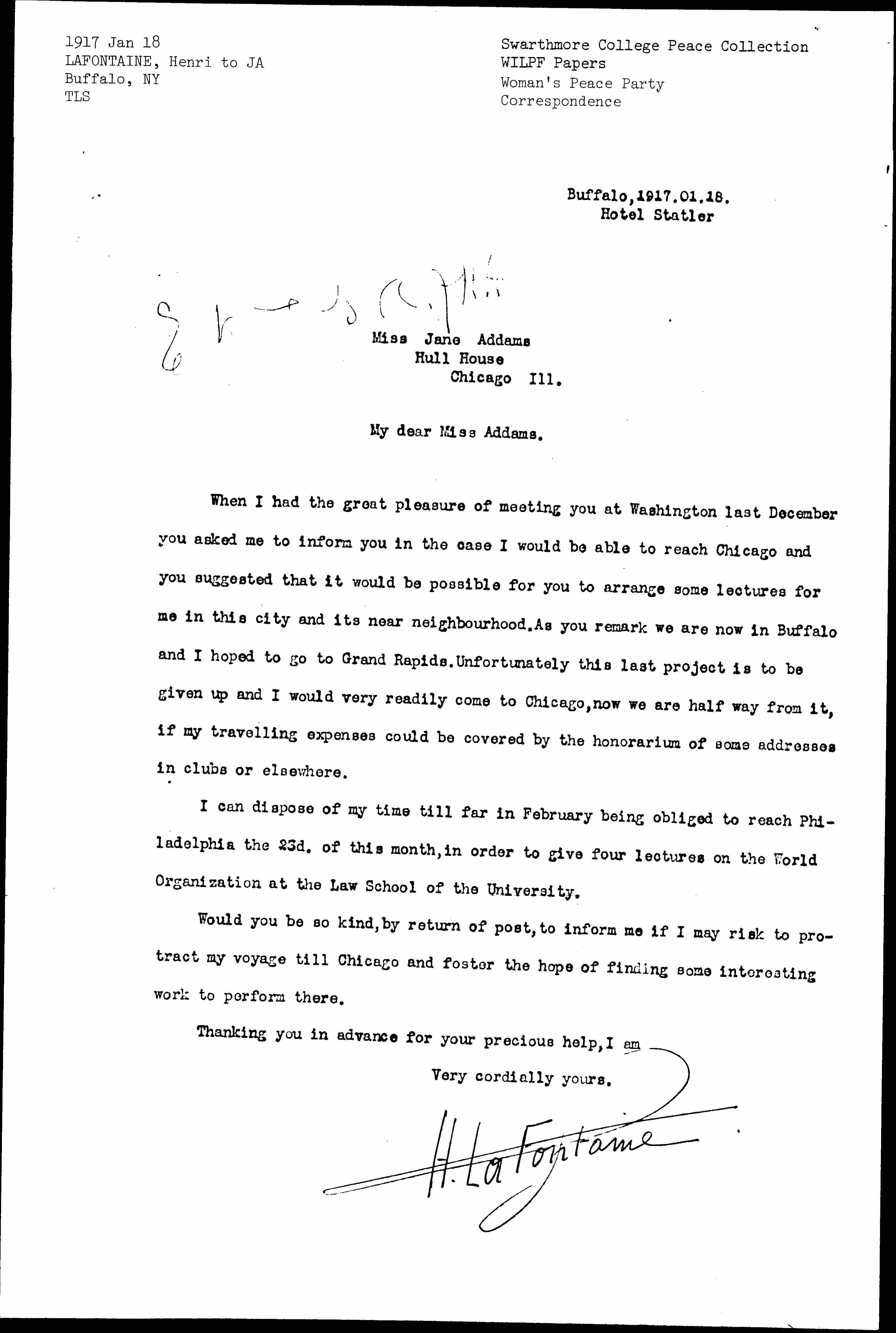 When I had the great pleasure of meeting you at Washington last December you asked me to inform you in the case I would be able to reach Chicago and you suggested that it would be possible for you to arrange some lectures for me in this city and its near [neighborhood]. As you remark we are now in Buffalo and I hoped to go to Grand Rapids. Unfortunately this last project is to be given up and I would very readily come to Chicago, now we are half way from it, if my [traveling] expenses could be covered by the honorarium of some addresses in clubs or elsewhere.