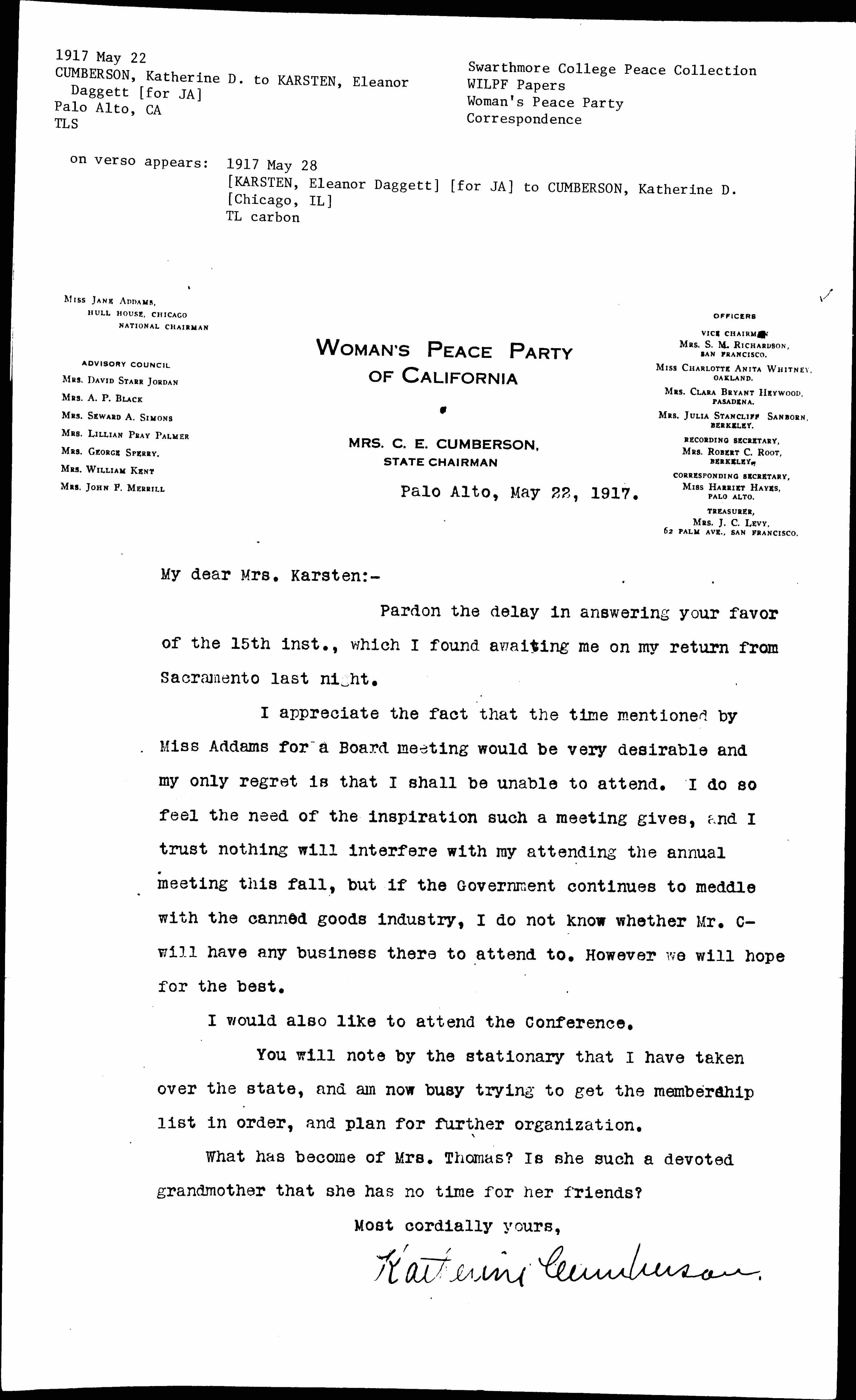I appreciate the fact that the time mentioned by Miss Addams for a Board meeting would be very desirable and my only regret is that I shall be unable to attend. I do so feel the need of the inspiration such a meeting gives, and I trust nothing will interfere with my attending the annual meeting this fall, but if the Government continues to meddle with the canned goods industry, I do not know whether Mr. C- will have any business there to attend to. However we will hope for the best.